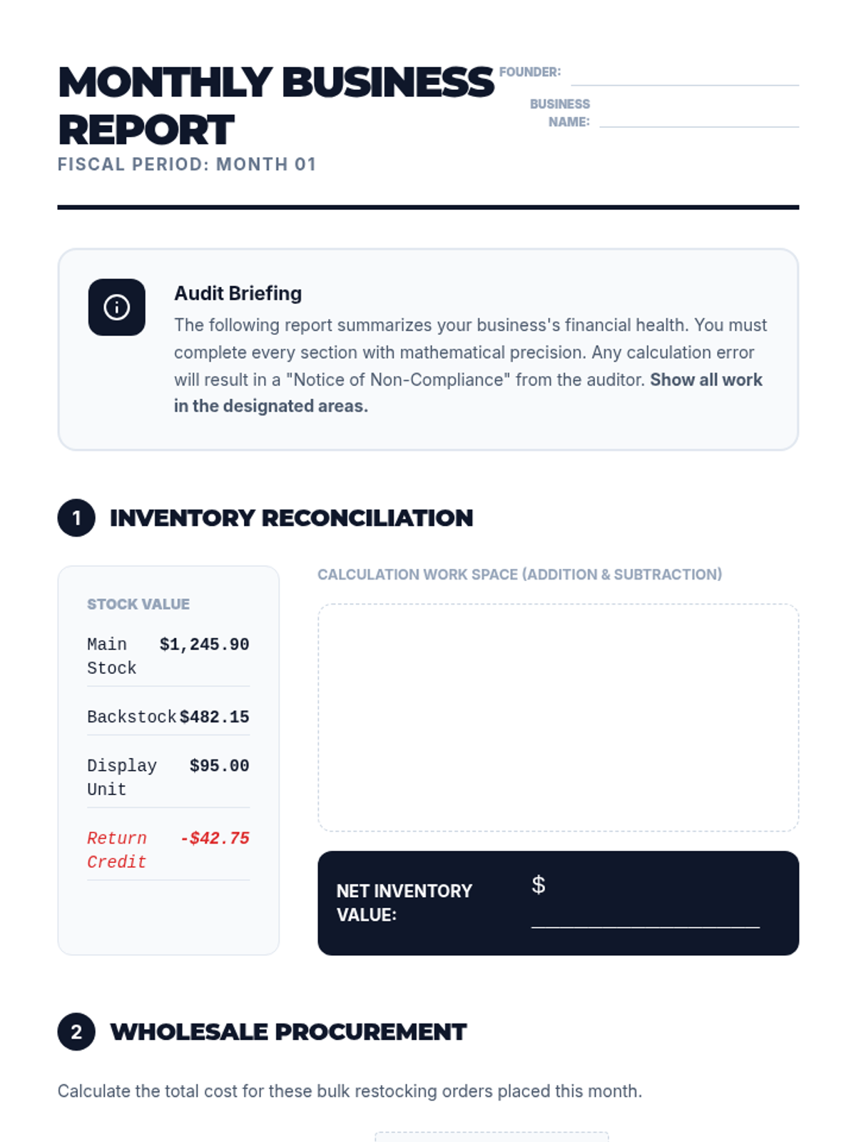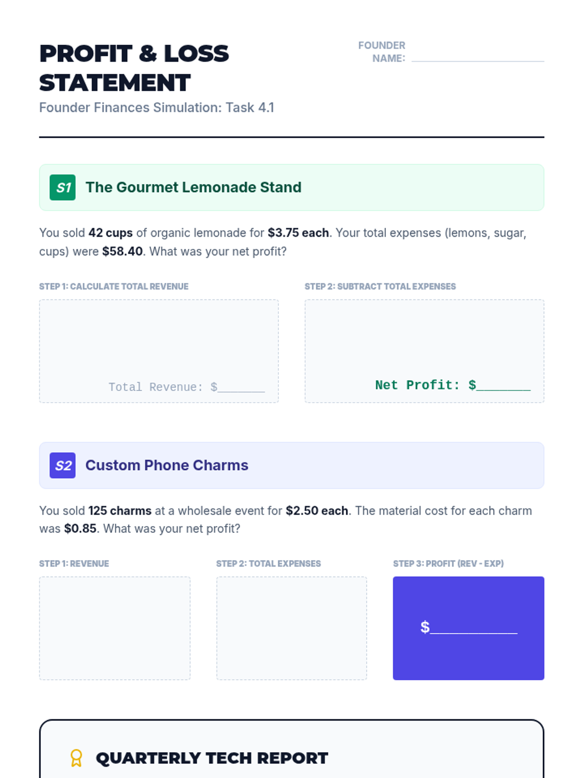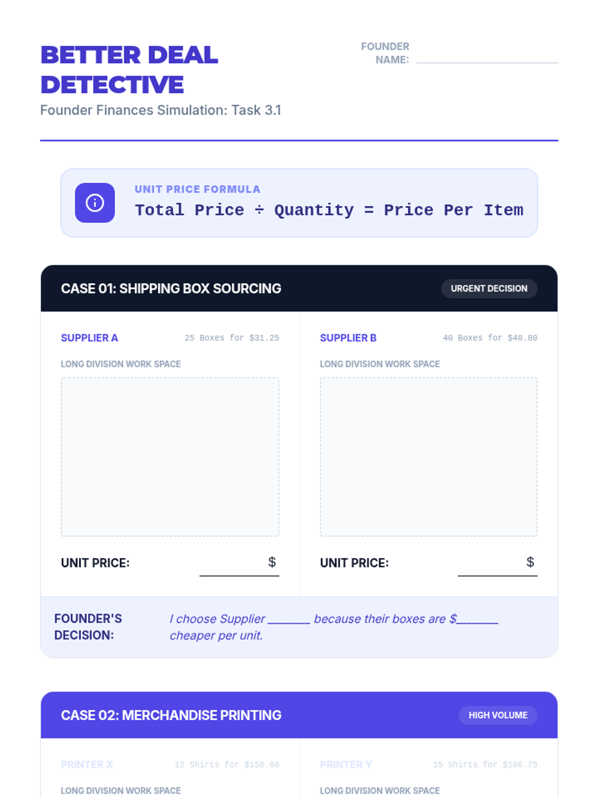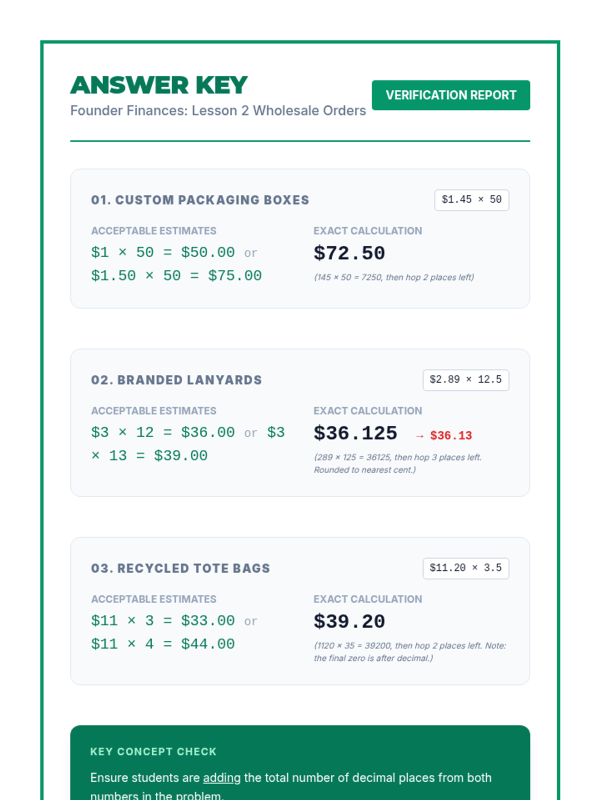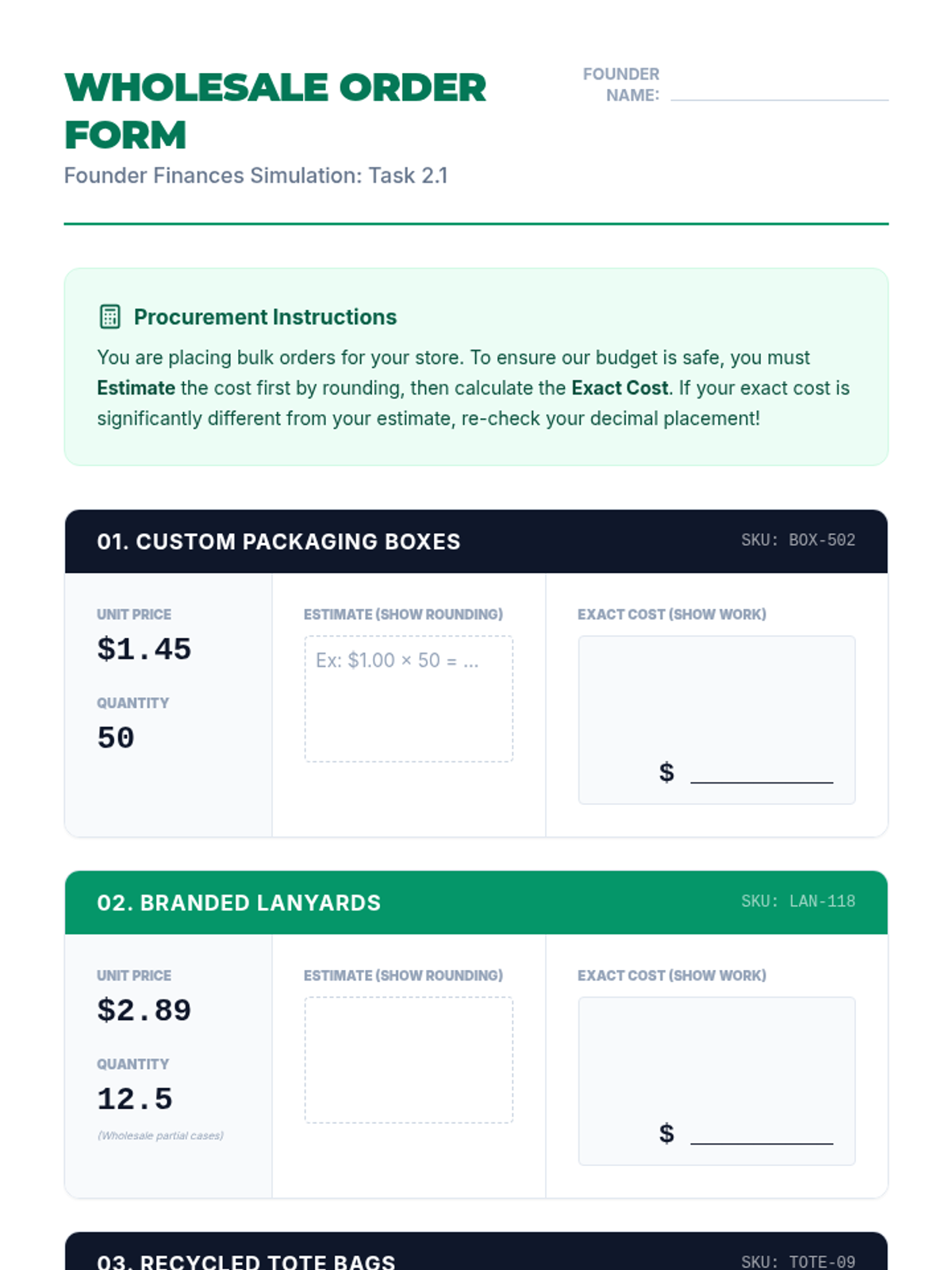 A 5-lesson unit where students master multi-digit decimal operations by running a simulated small business, from inventory management to final profit reporting.
