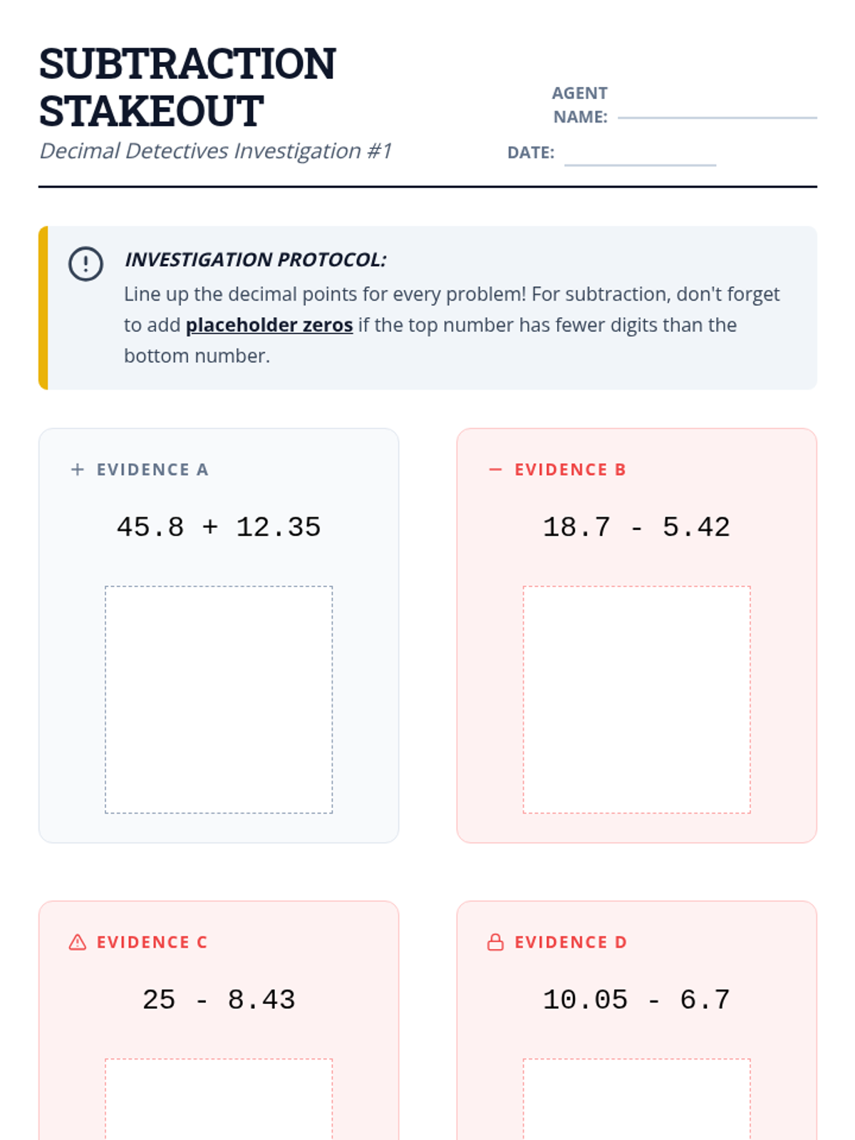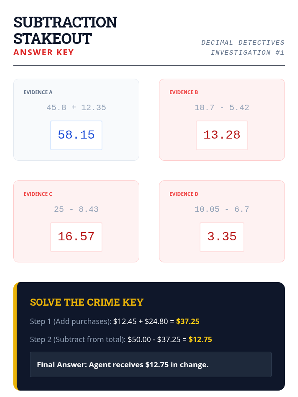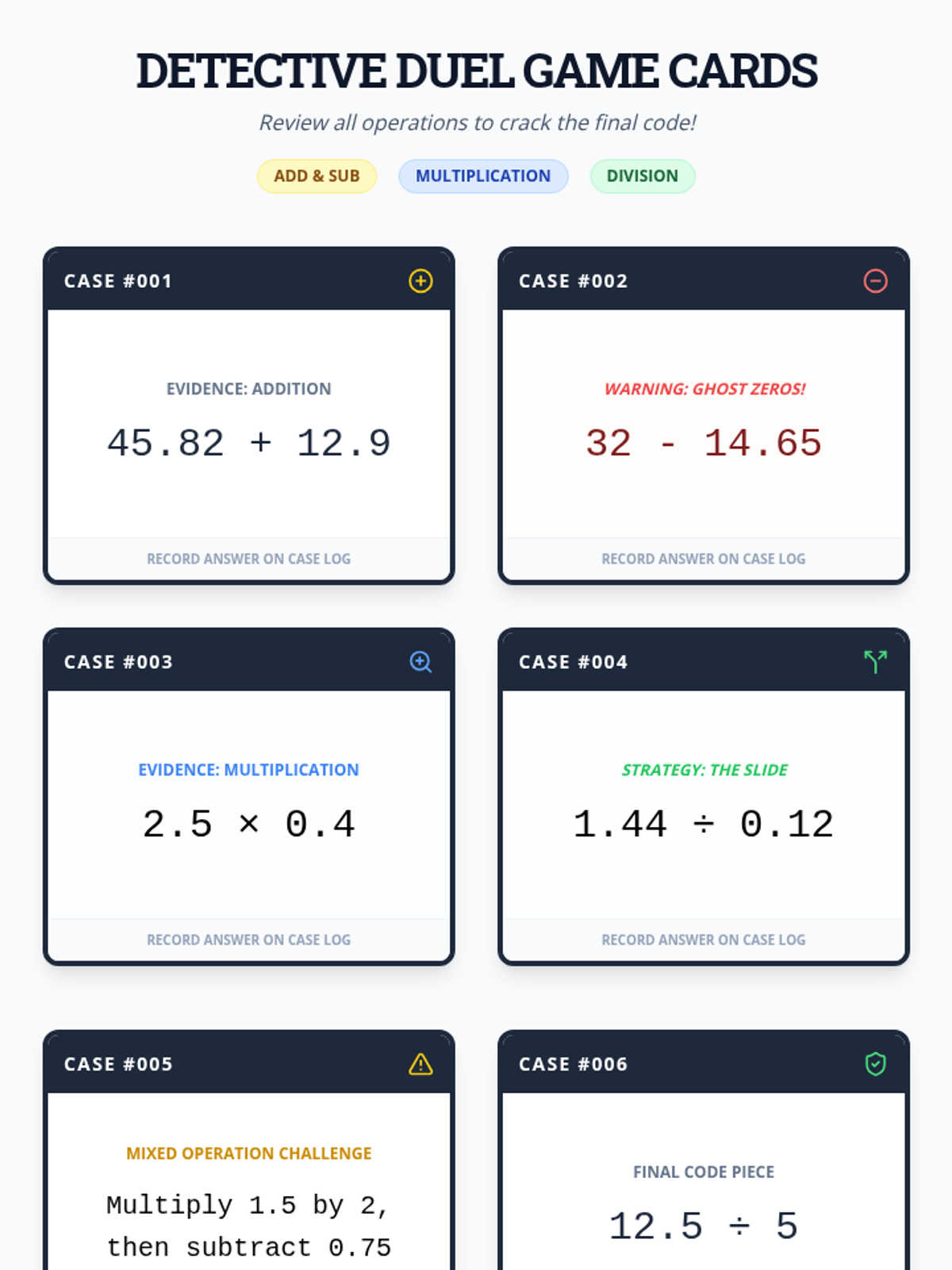 A comprehensive unit on performing the four operations with decimals, using a detective-themed approach to engage students in precision and problem-solving.