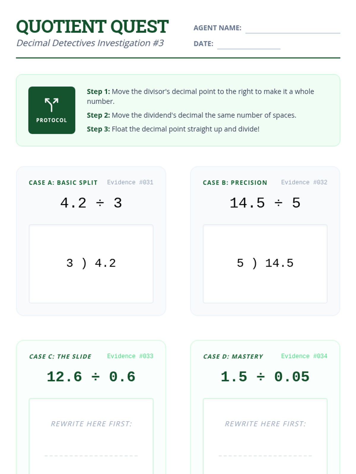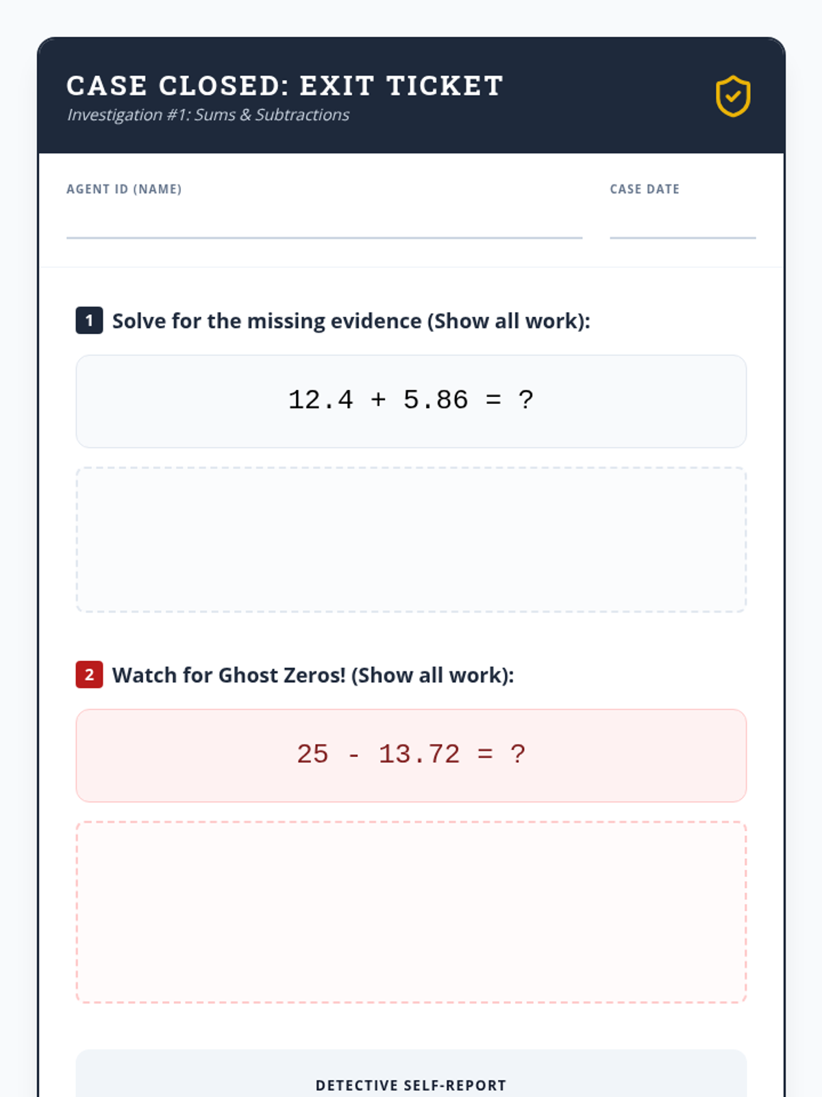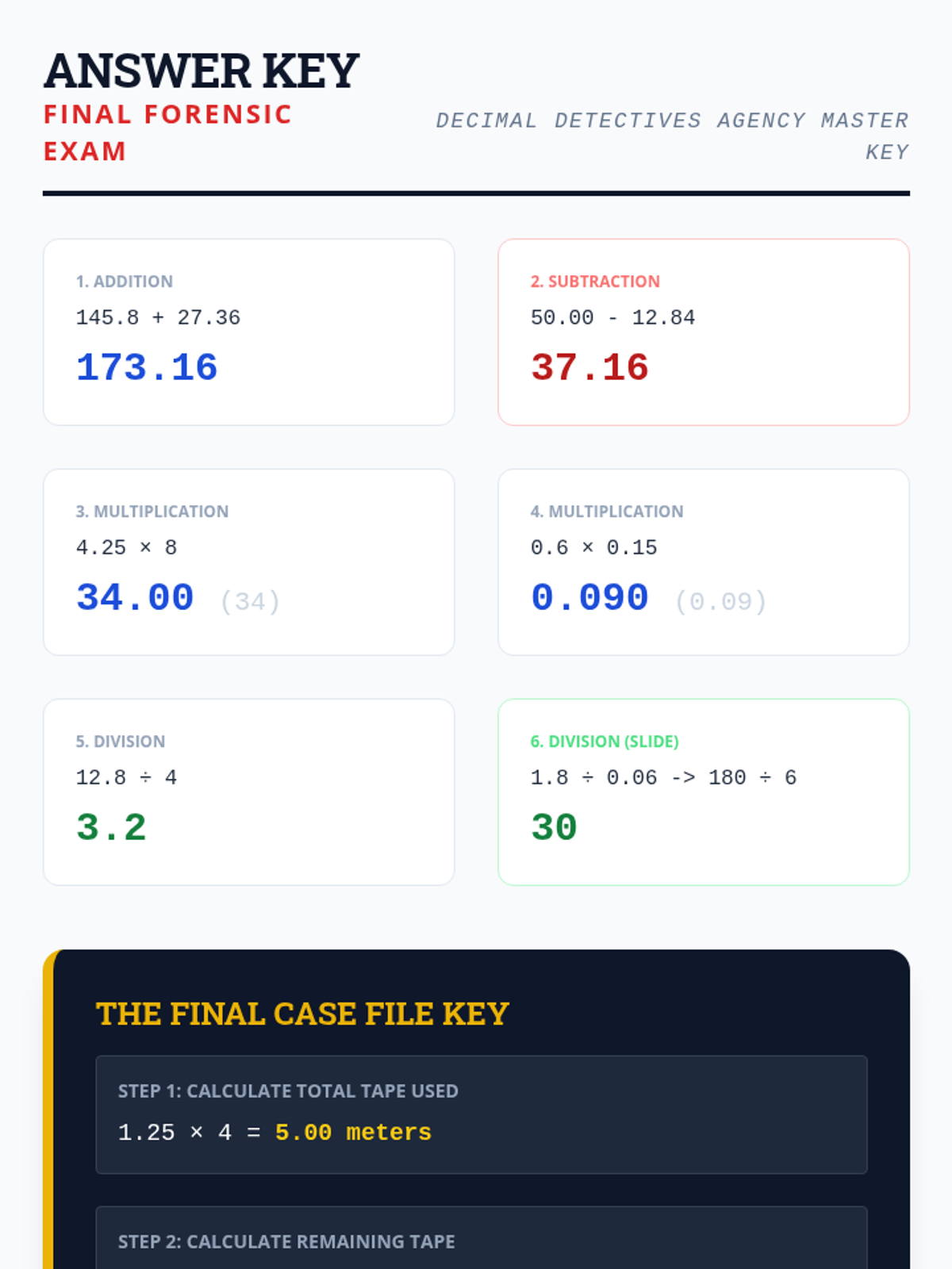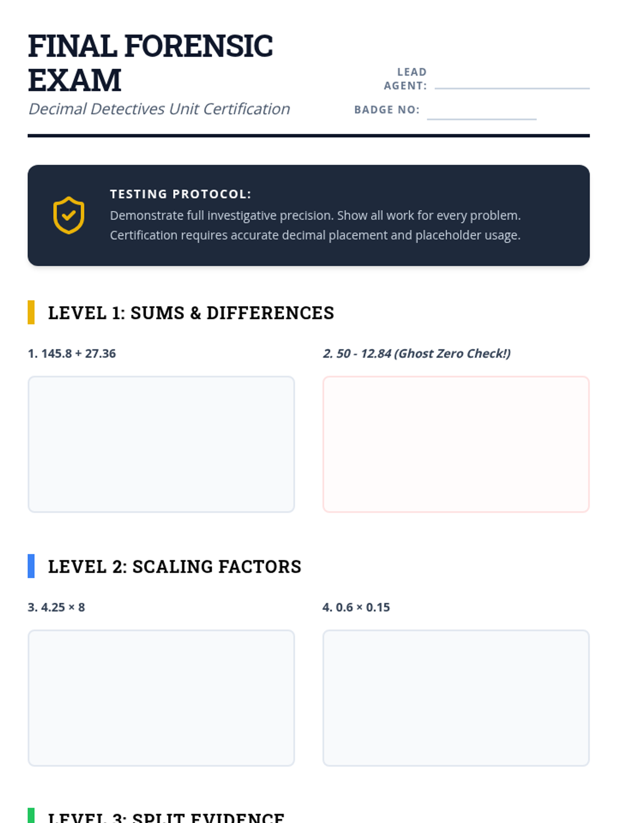 A comprehensive unit on performing the four operations with decimals, using a detective-themed approach to engage students in precision and problem-solving.