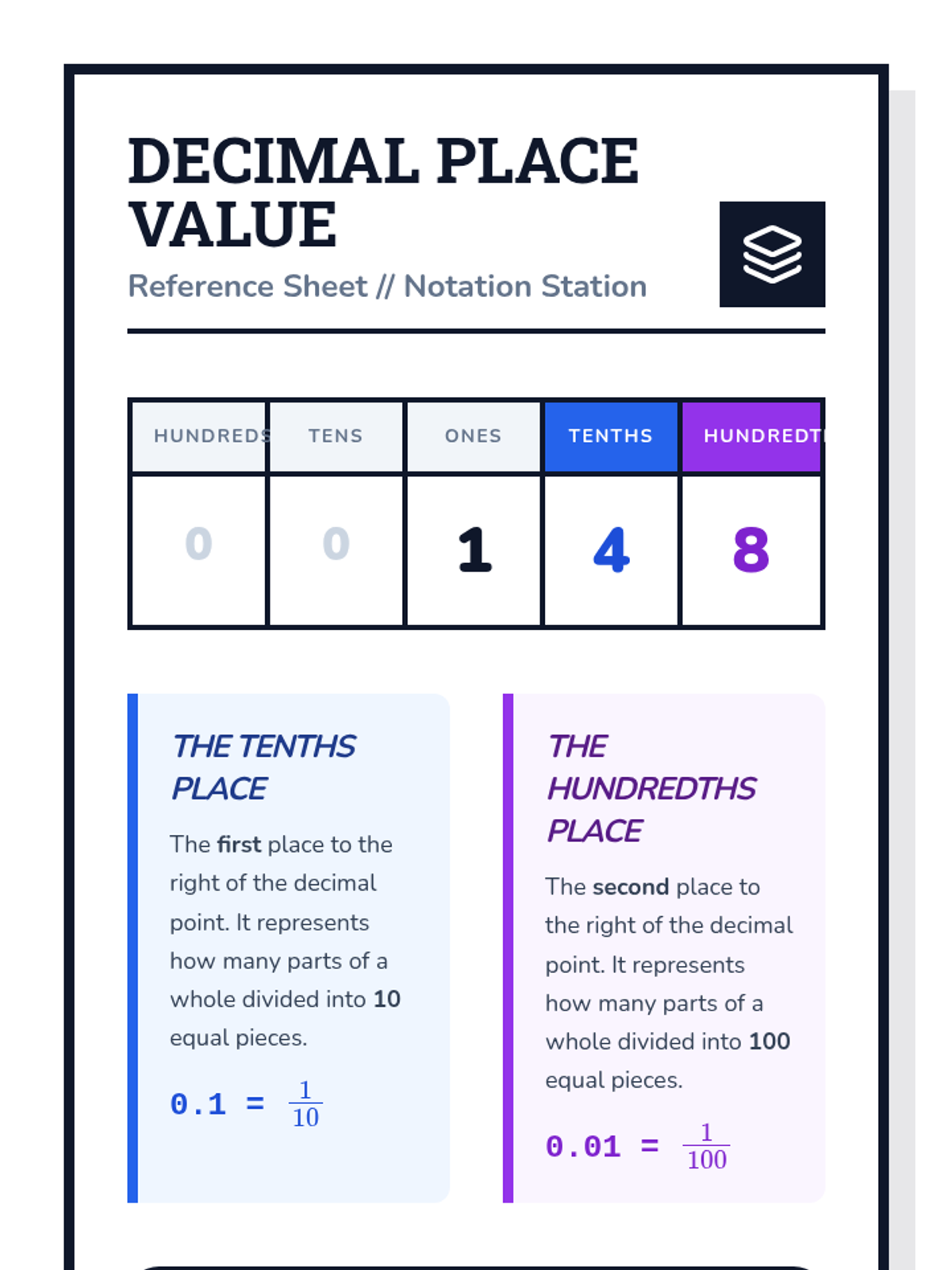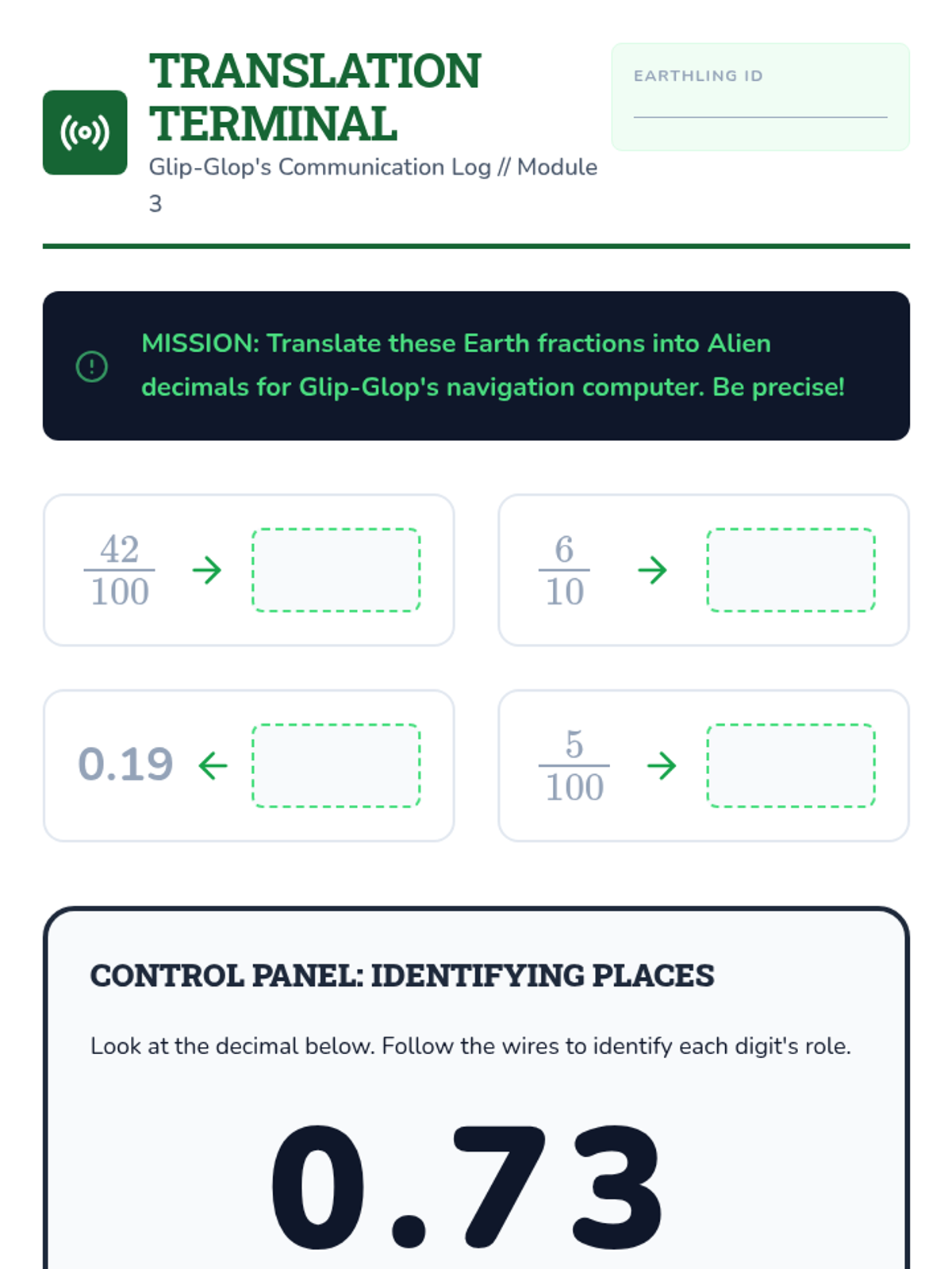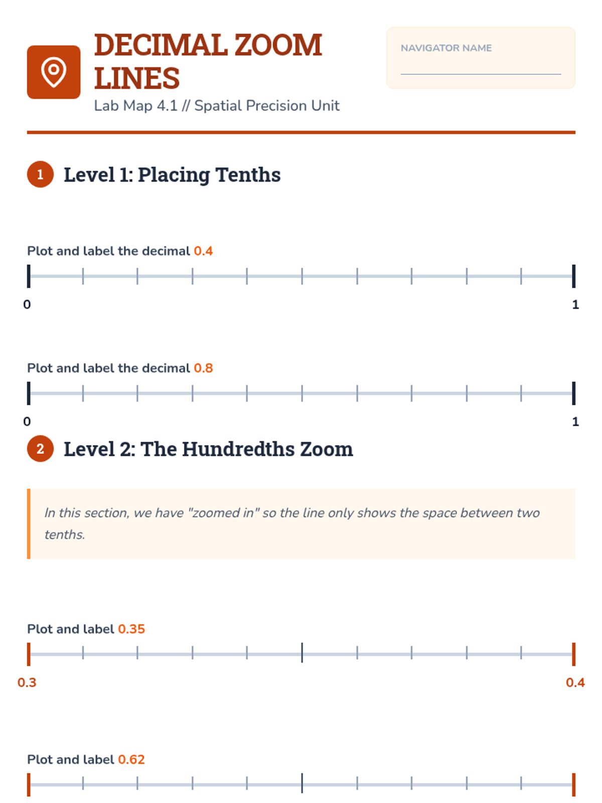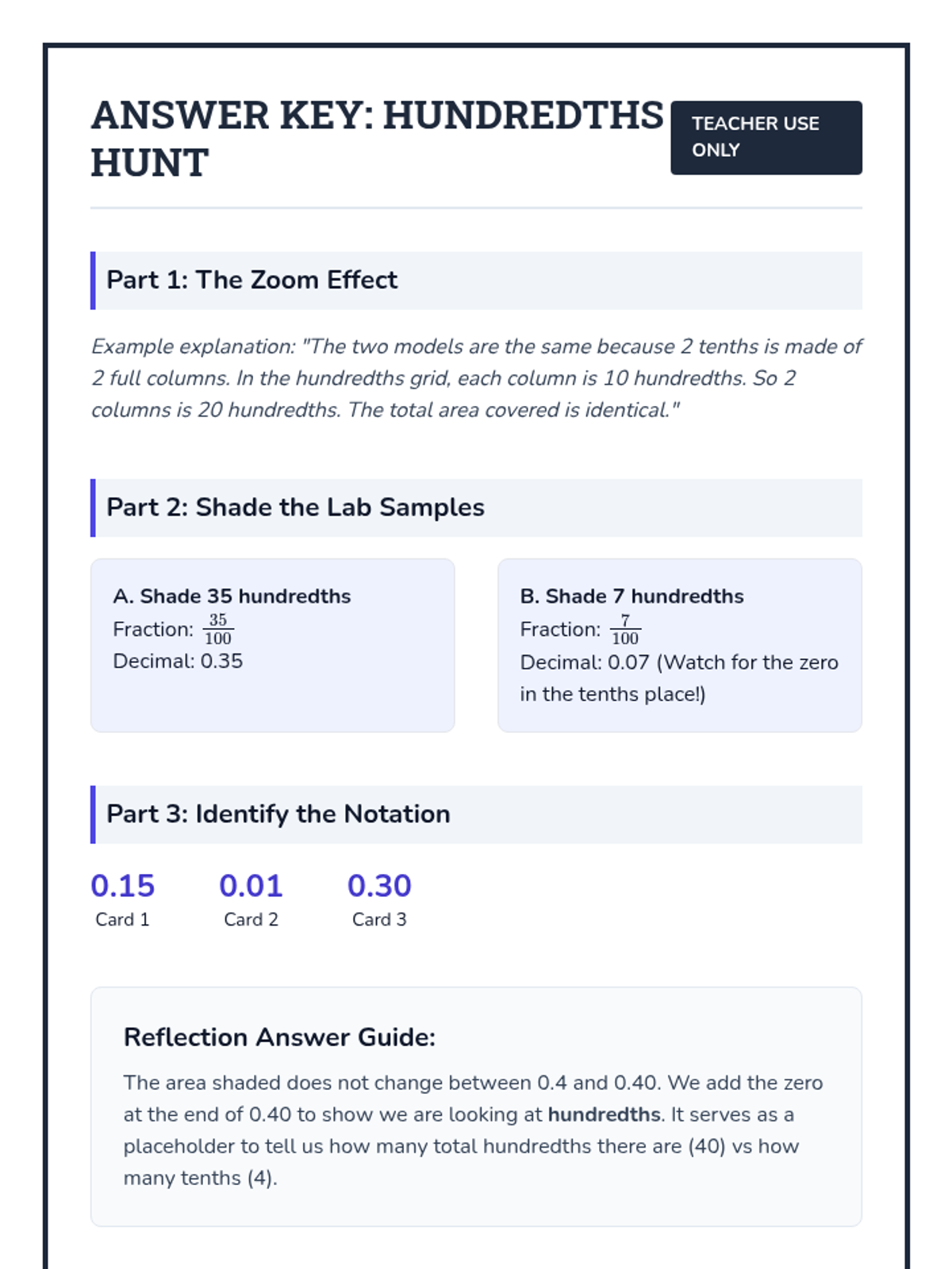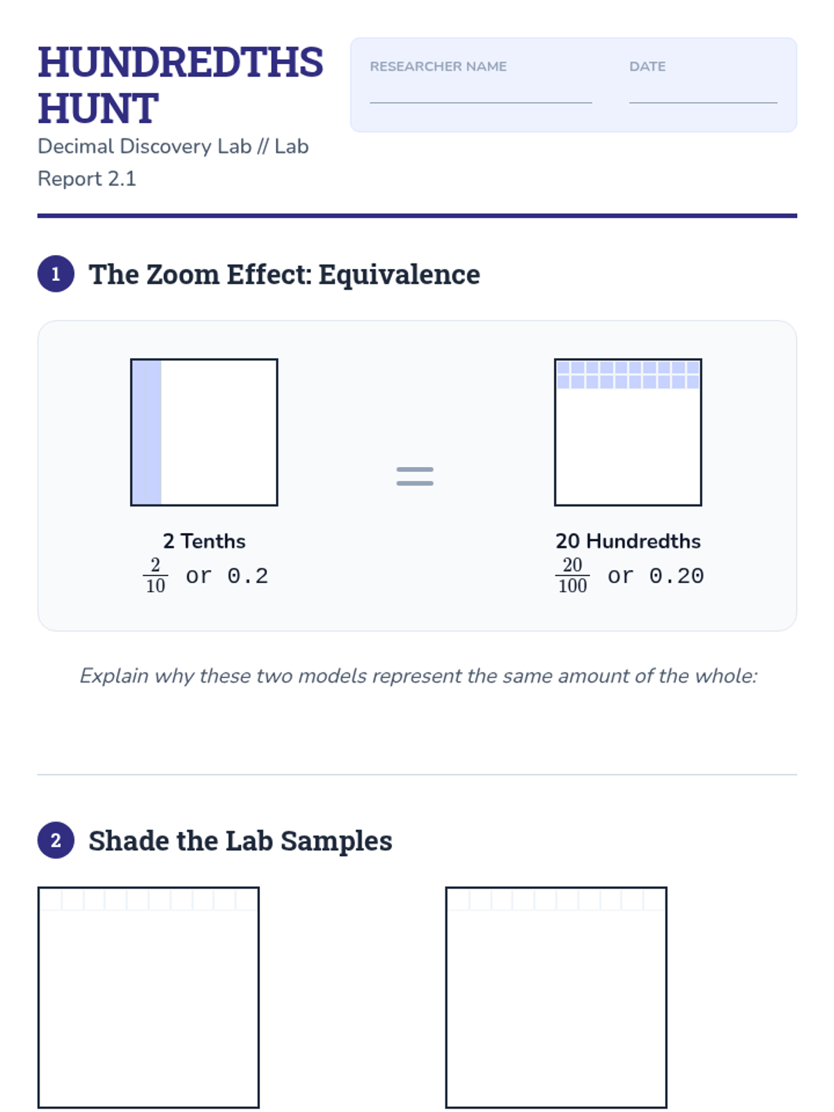 This sequence guides 4th-grade students through the transition from fractions to decimals, focusing on tenths and hundredths as extensions of the base-ten system using visual grids, number lines, and money models.