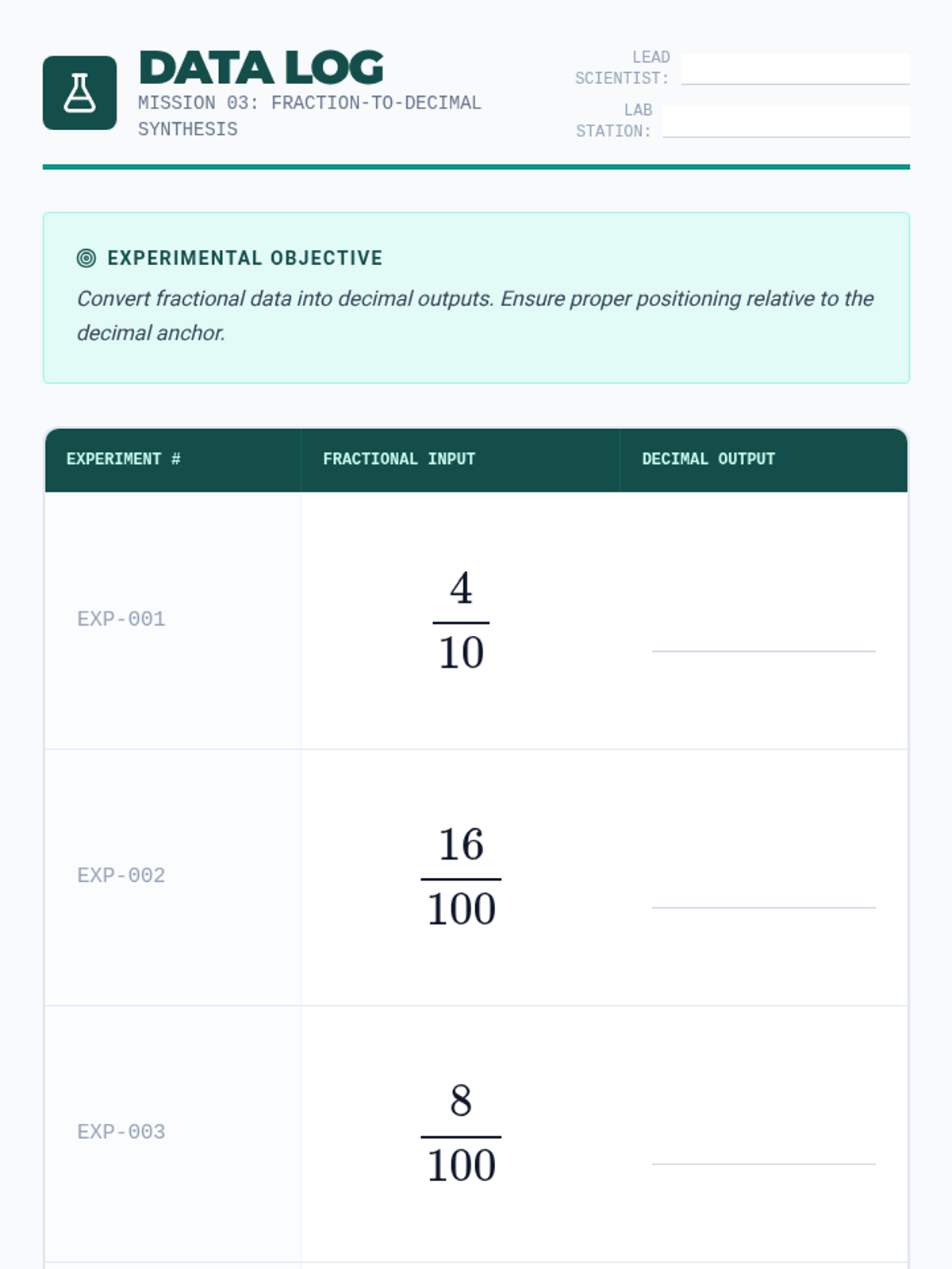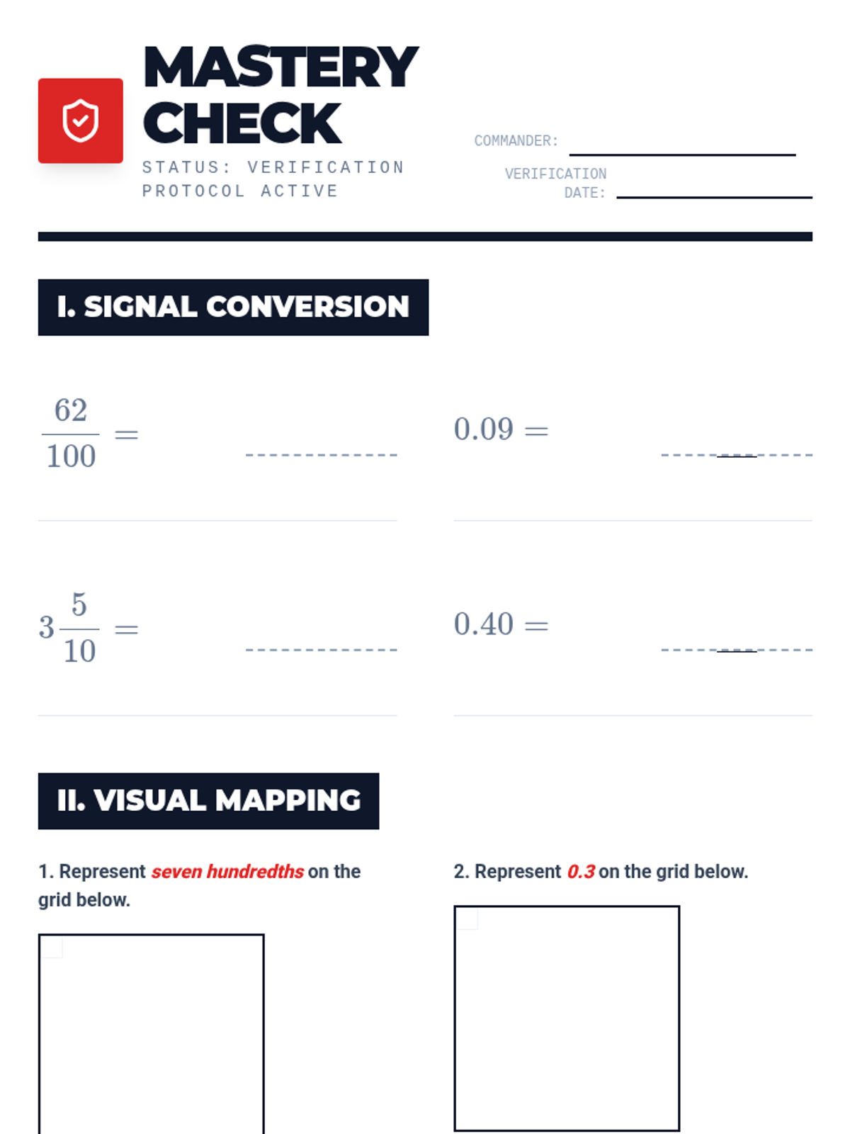 A comprehensive sequence for 6th-grade students focusing on the conceptual and procedural links between fractions with denominators of 10 and 100 and their decimal equivalents. Students use area models and place value charts to build mastery in conversion and mathematical justification.
