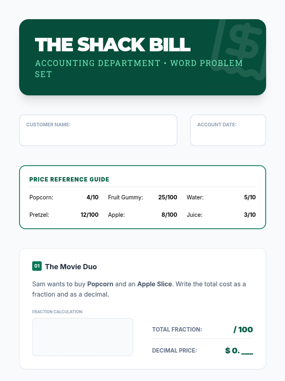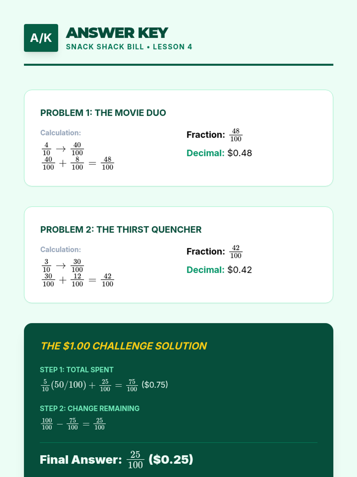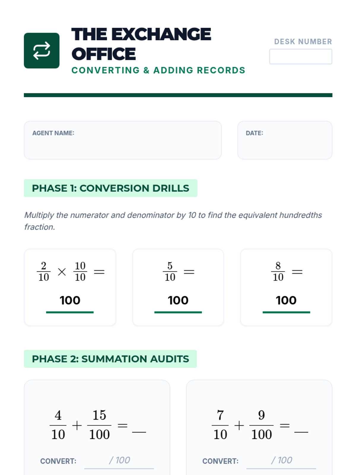This sequence focuses on adding tenths and hundredths by converting denominators, using money (dimes and pennies) as a primary concrete model. Students progress from inquiry-based simulations to abstract addition and real-world application in a 'shopping spree' context.
