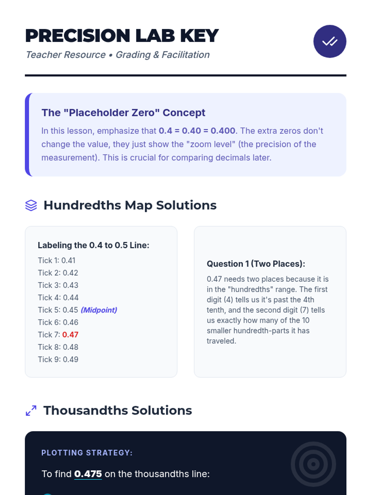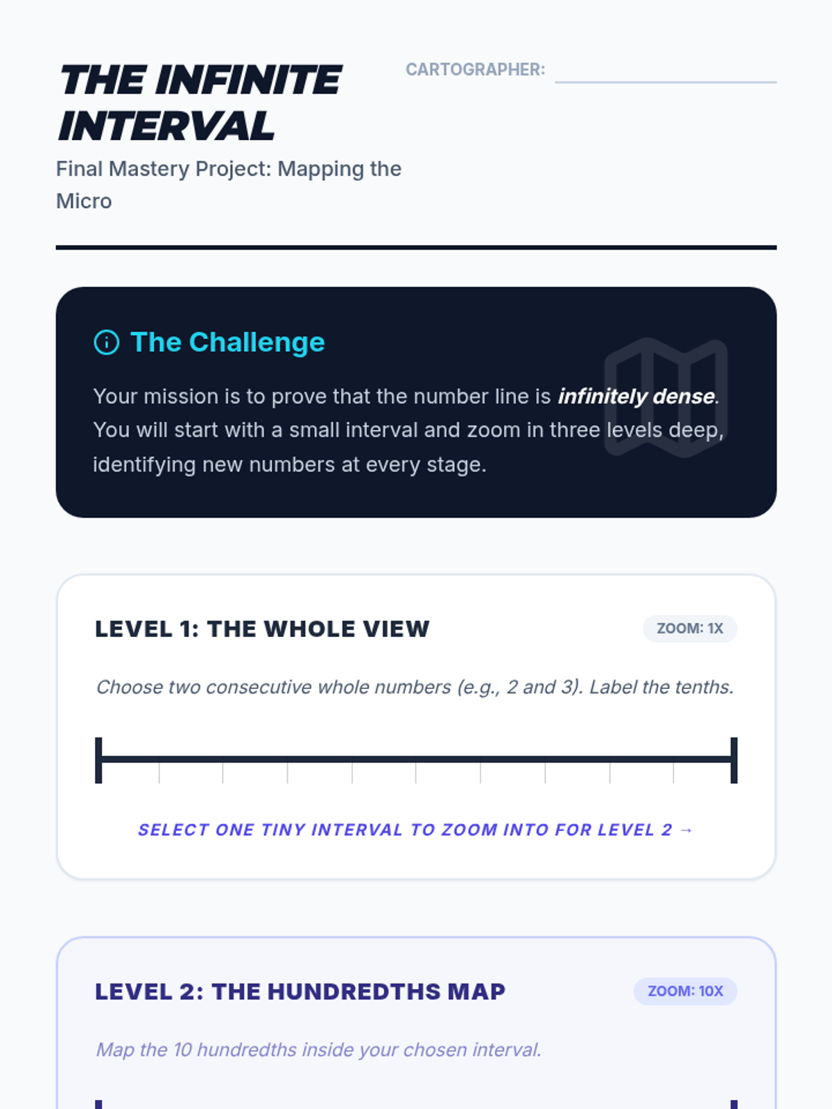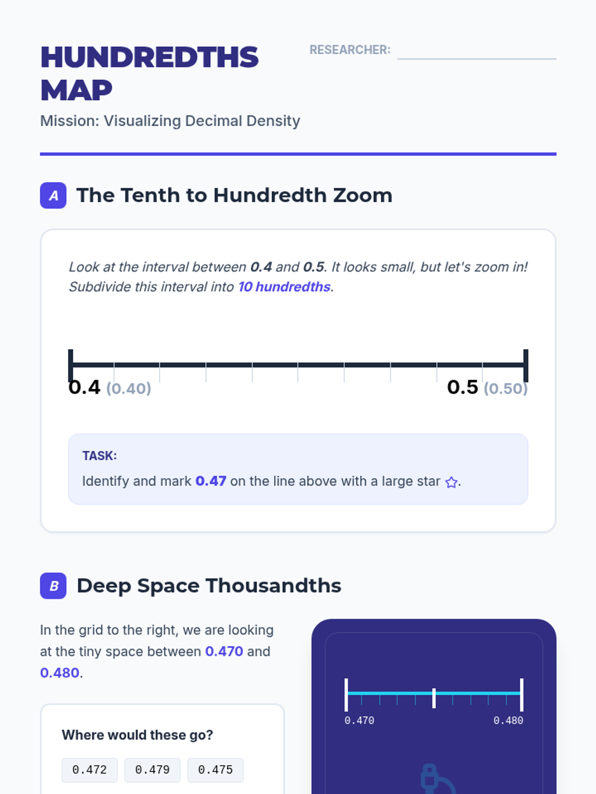 A 5-lesson sequence for 5th-grade students focusing on the conceptual 'zooming' of the number line to understand decimals. Students progress from tenths to thousandths, using spatial reasoning to compare, order, round, and discover the density of rational numbers.