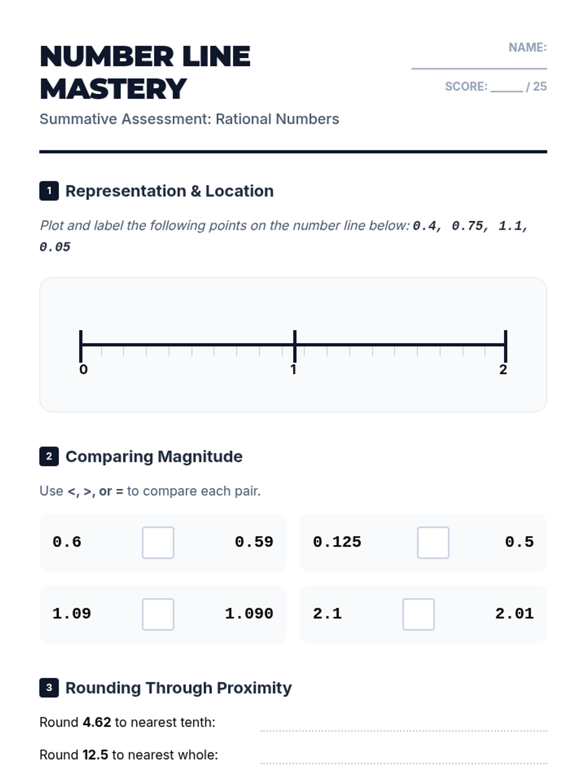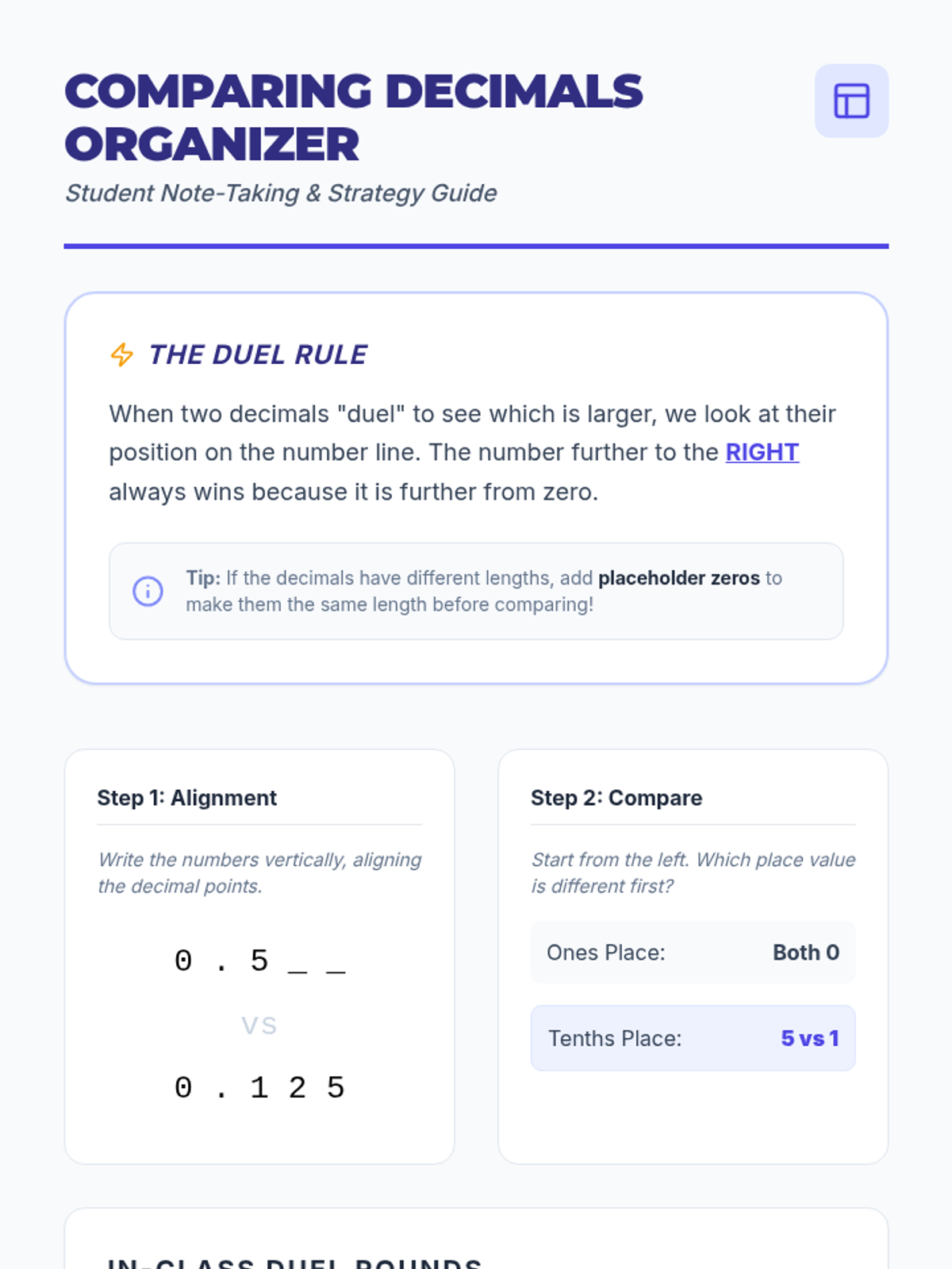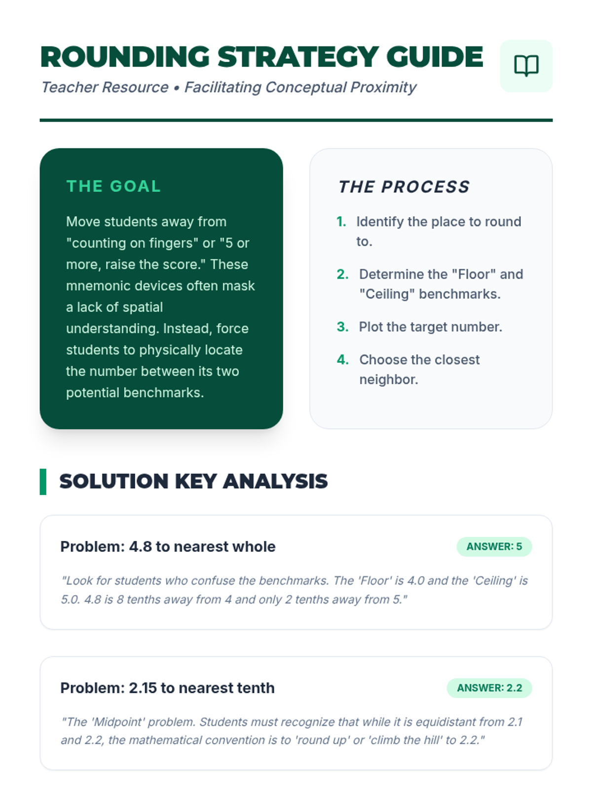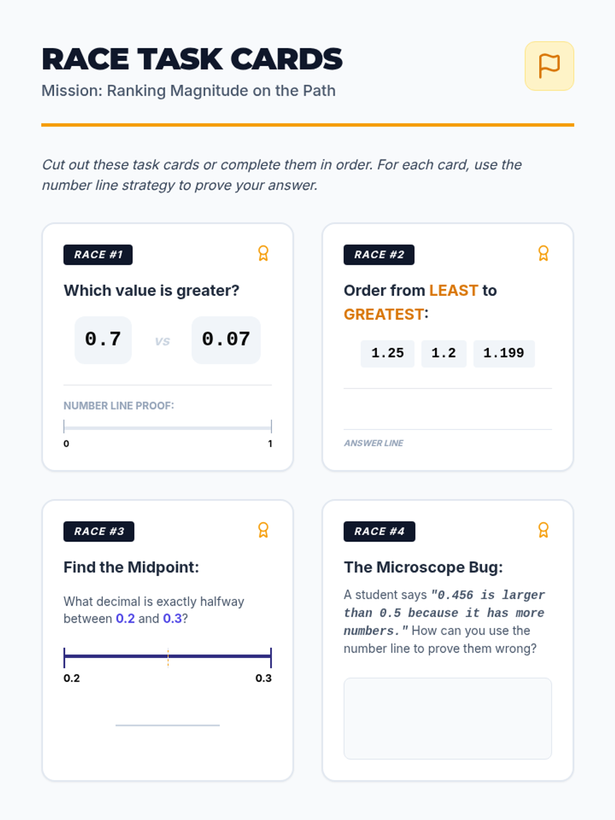 A 5-lesson sequence for 5th-grade students focusing on the conceptual 'zooming' of the number line to understand decimals. Students progress from tenths to thousandths, using spatial reasoning to compare, order, round, and discover the density of rational numbers.
