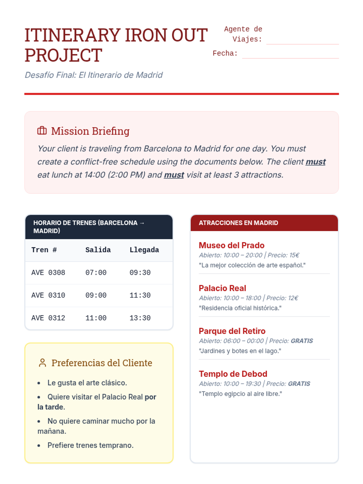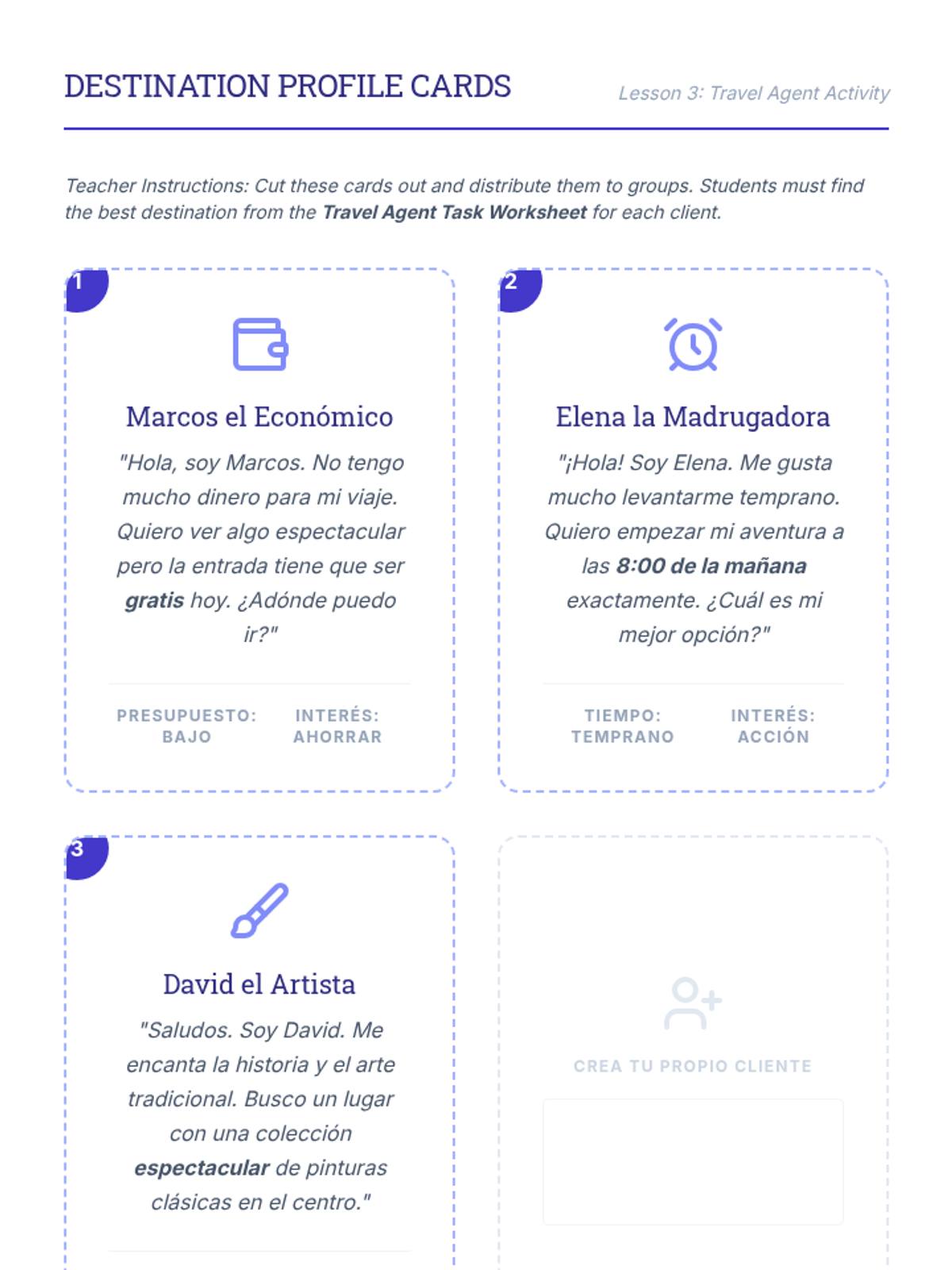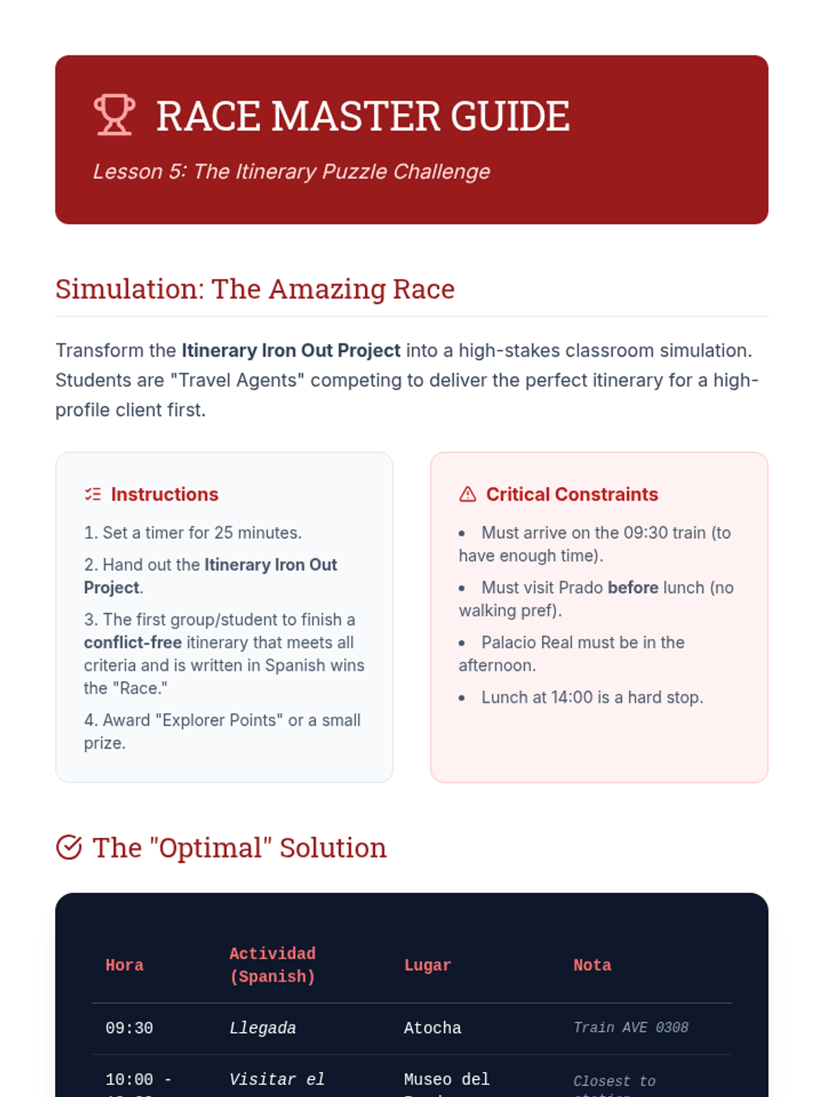 A 5-lesson unit for 8th-grade Spanish students focused on reading and interpreting travel-related texts. Students progress from basic map reading and prepositions to synthesizing complex schedules and brochures for functional literacy.