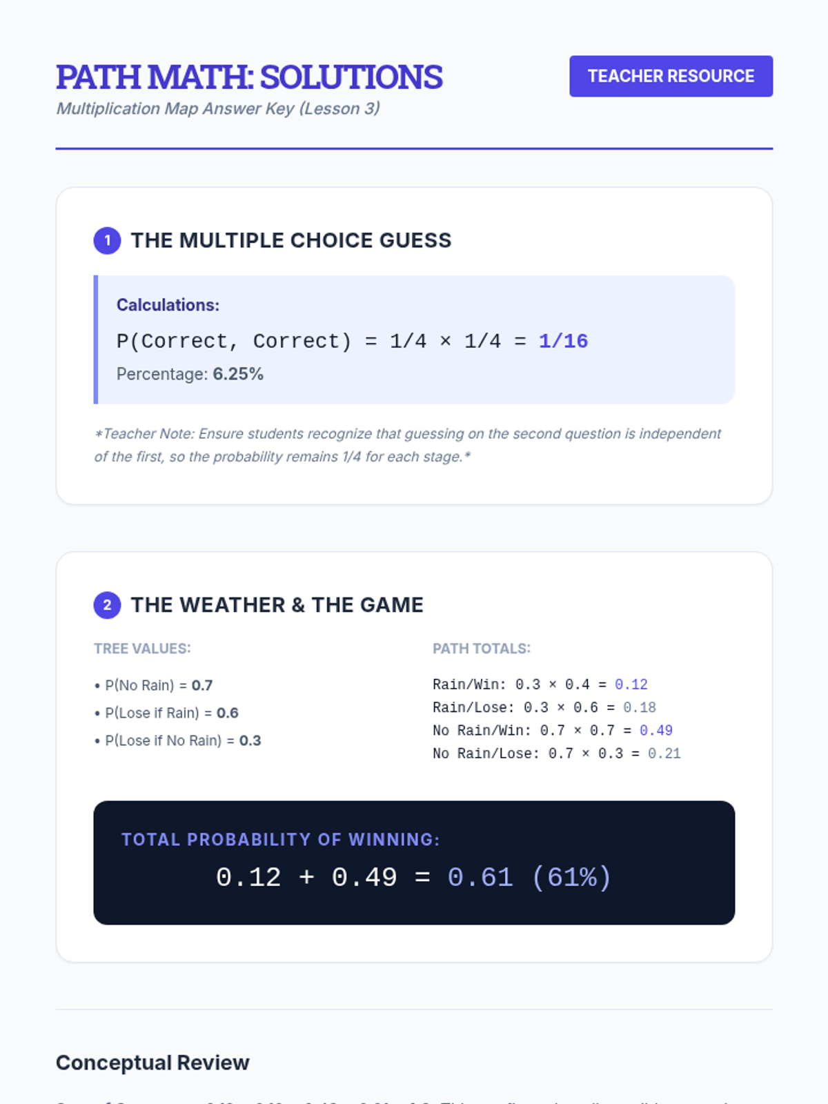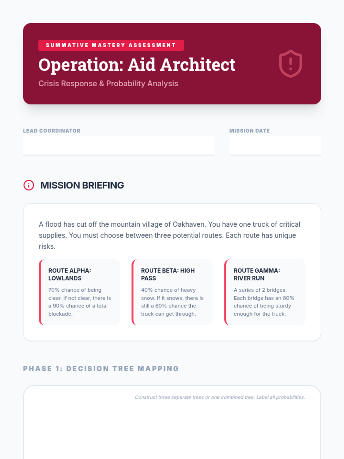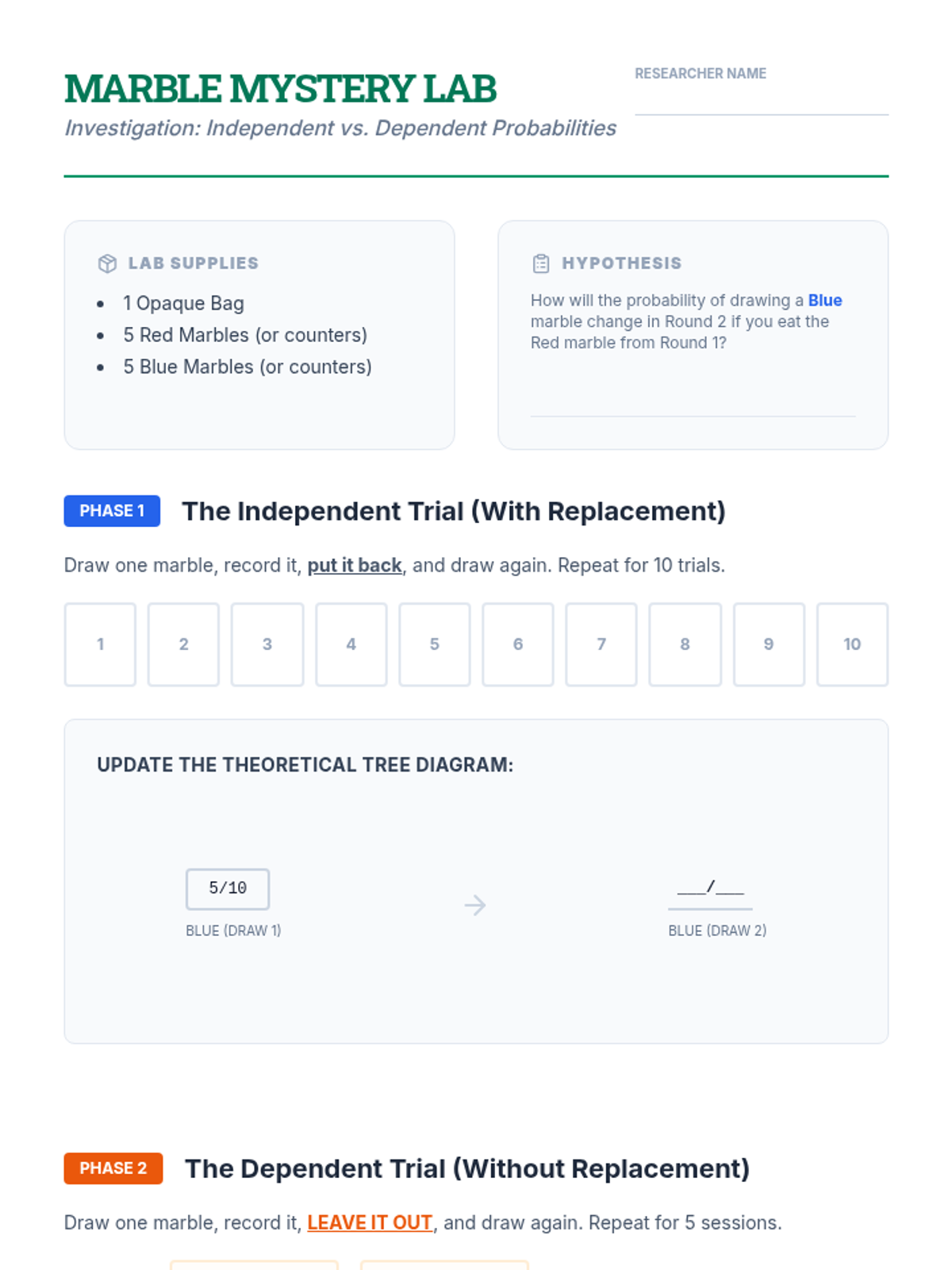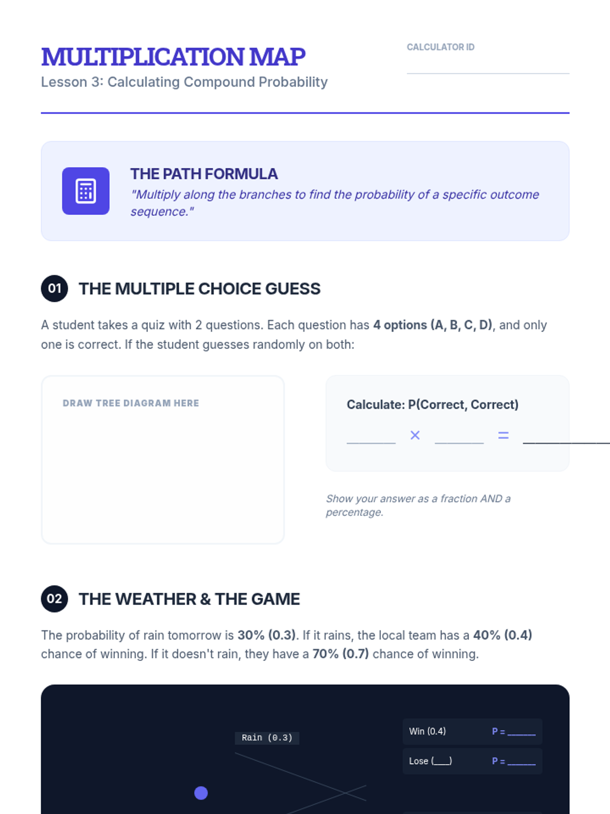 This sequence guides students through the visualization and calculation of compound probabilities using tree diagrams. Students progress from basic branching to analyzing complex real-world decisions involving dependent and independent events.