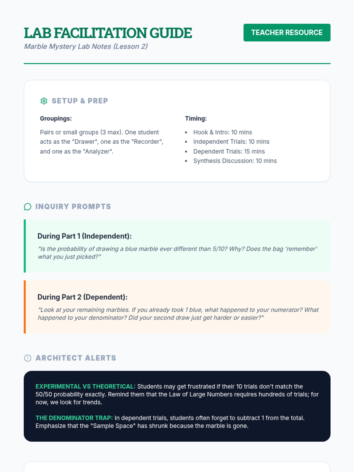 A lesson sequence focusing on compound probability, specifically analyzing events where order matters versus where it doesn't, using marble jar scenarios and tree diagrams.