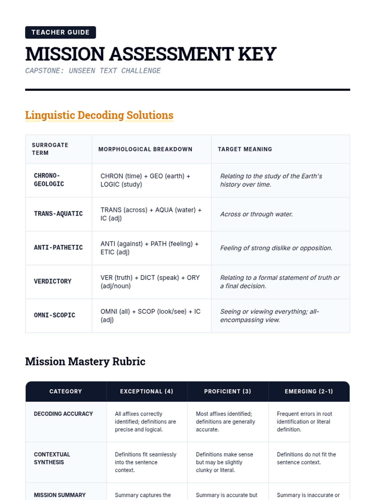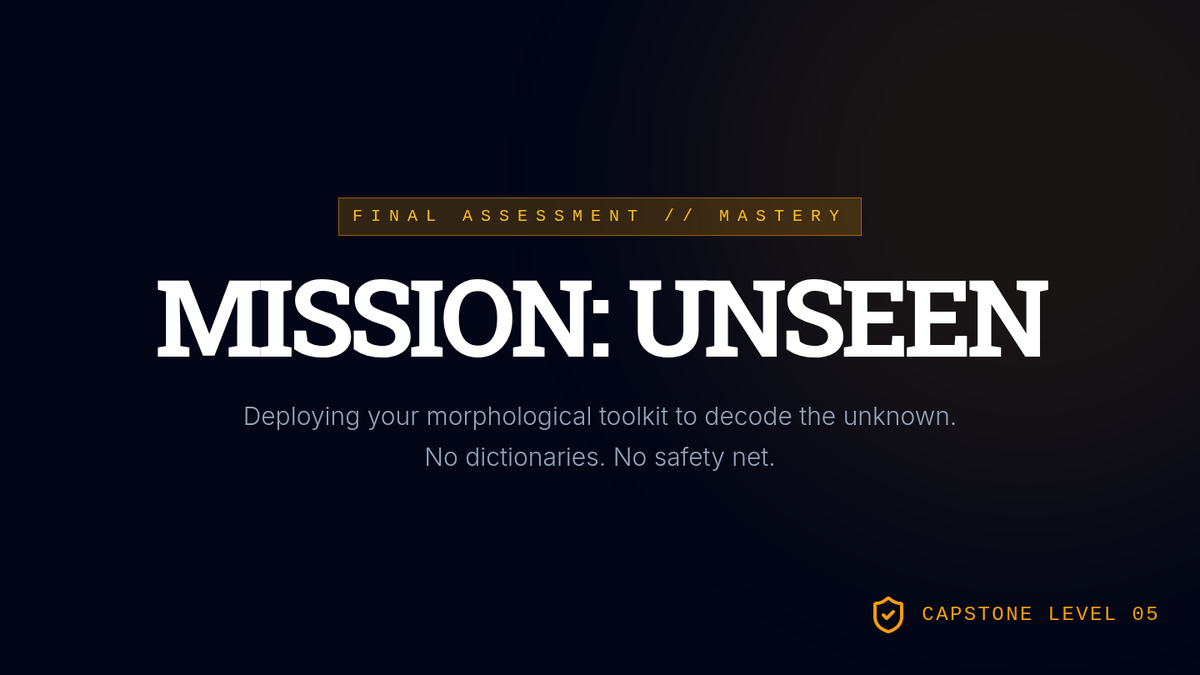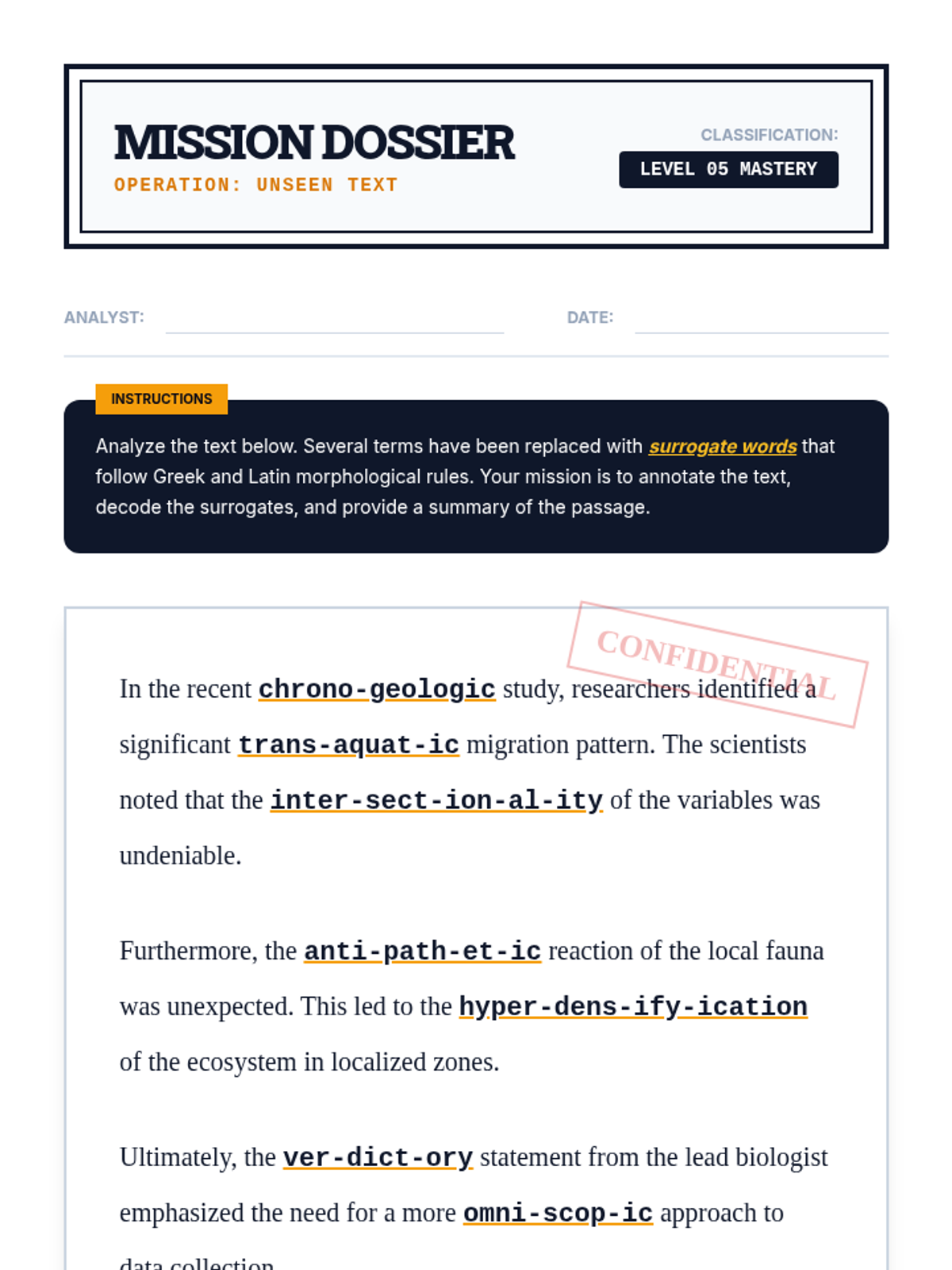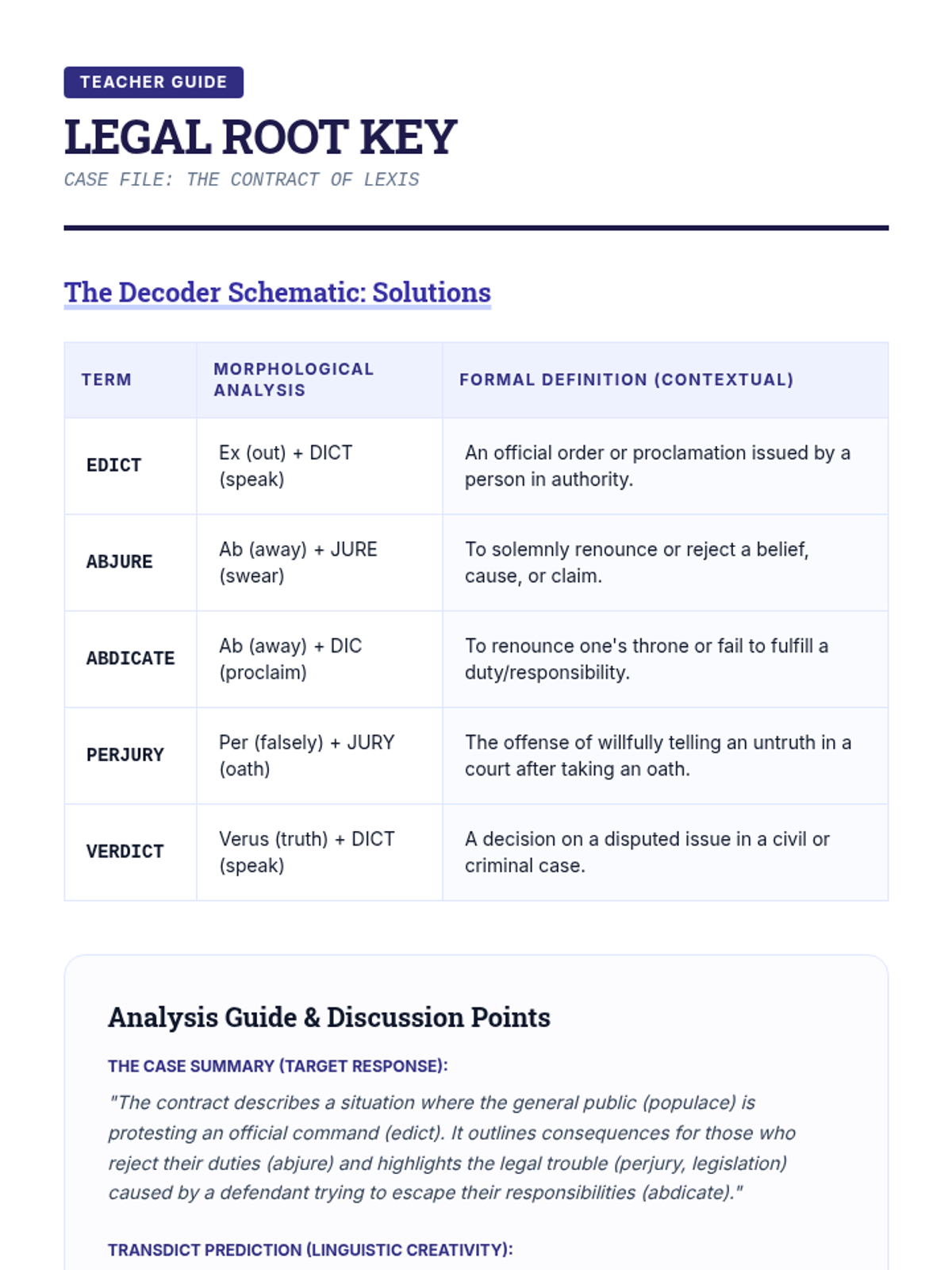 A comprehensive 11th-grade sequence focused on morphological analysis (roots, prefixes, suffixes) to decode advanced vocabulary in law, science, and academic writing. Students transition from identifying word parts to independently deconstructing complex, college-level texts.