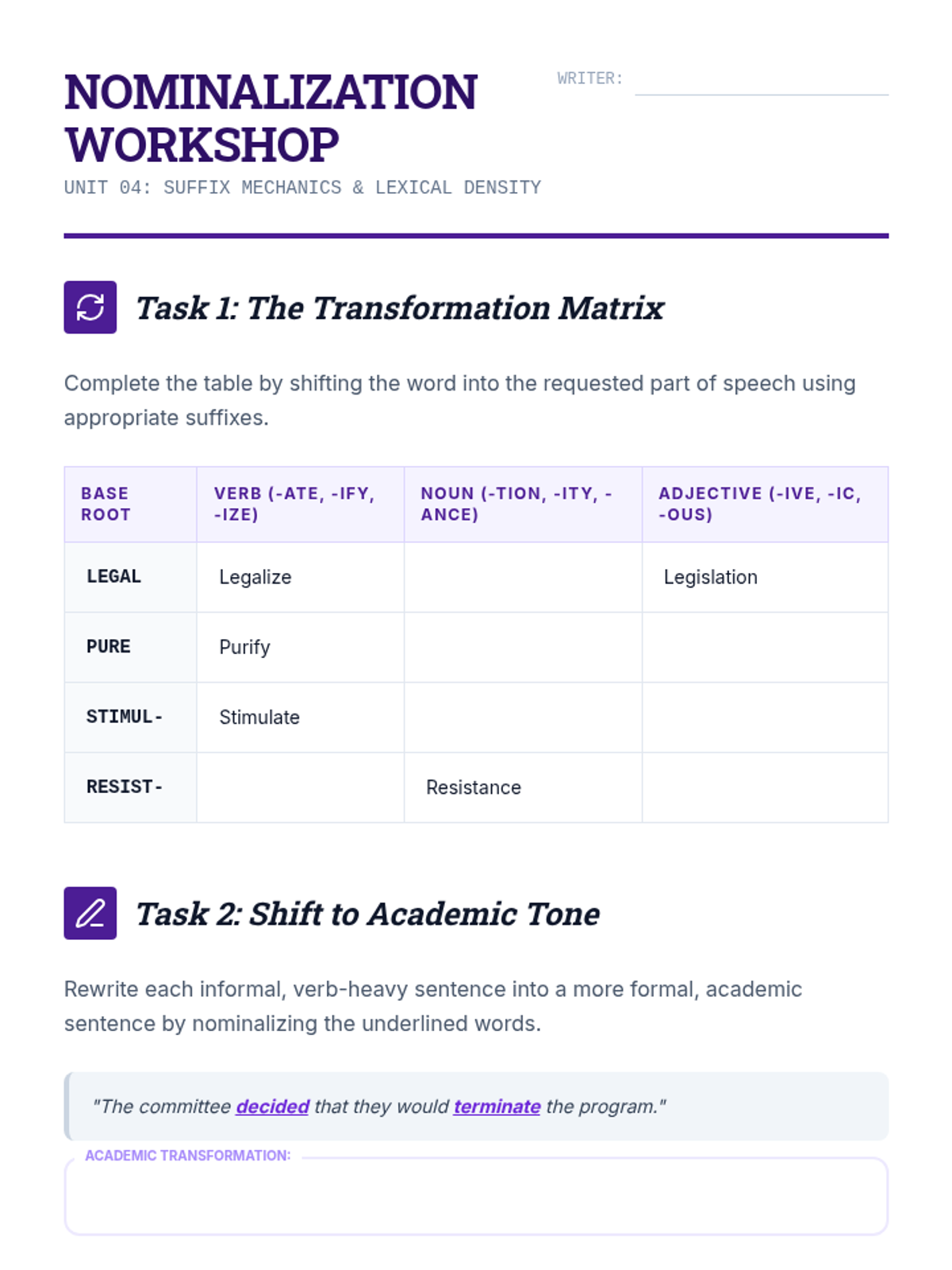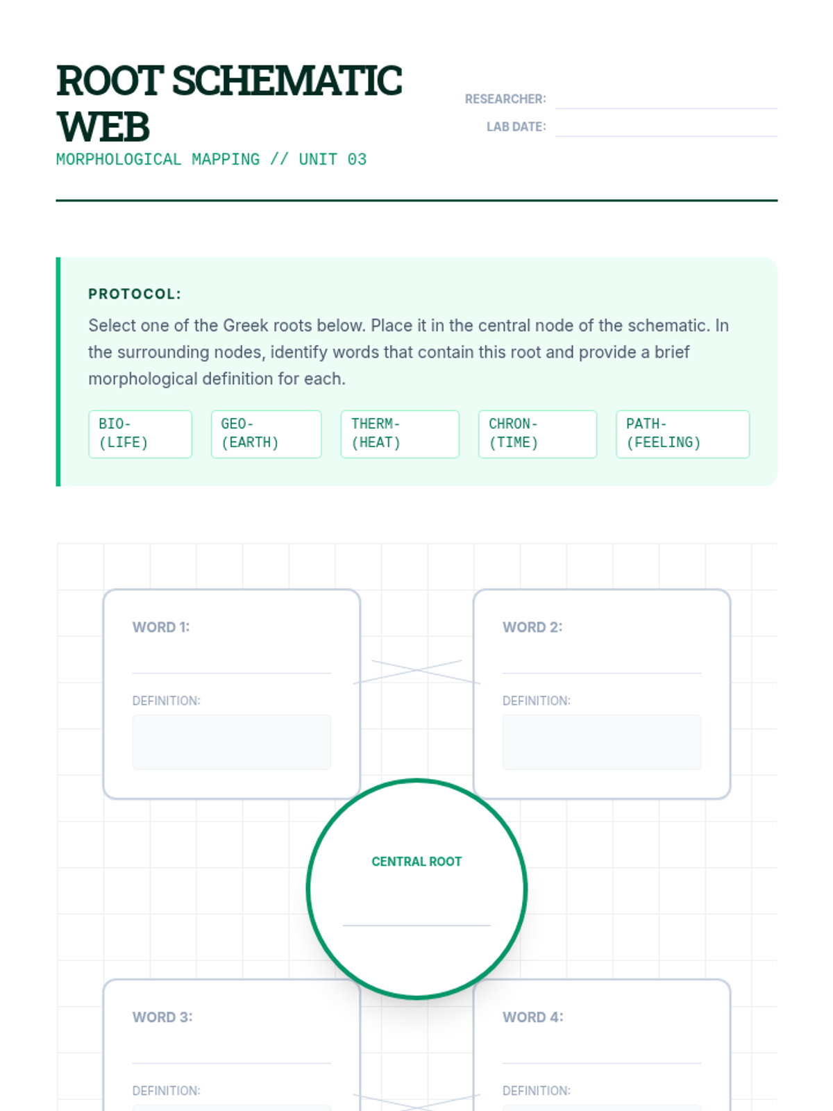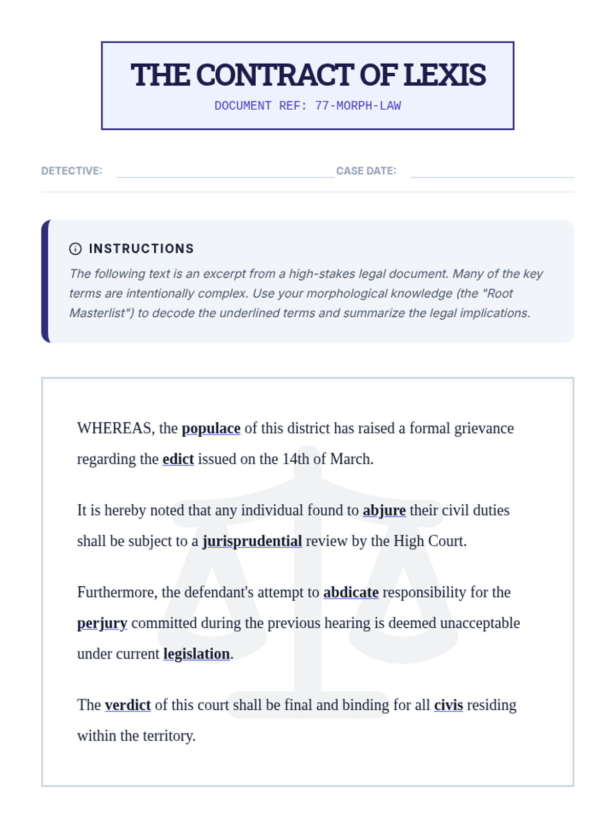 A comprehensive 11th-grade sequence focused on morphological analysis (roots, prefixes, suffixes) to decode advanced vocabulary in law, science, and academic writing. Students transition from identifying word parts to independently deconstructing complex, college-level texts.