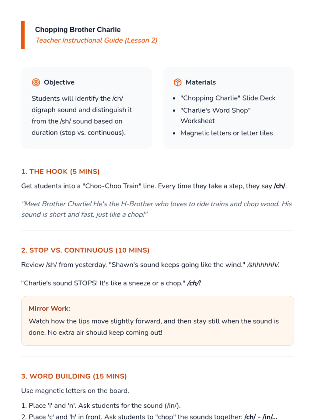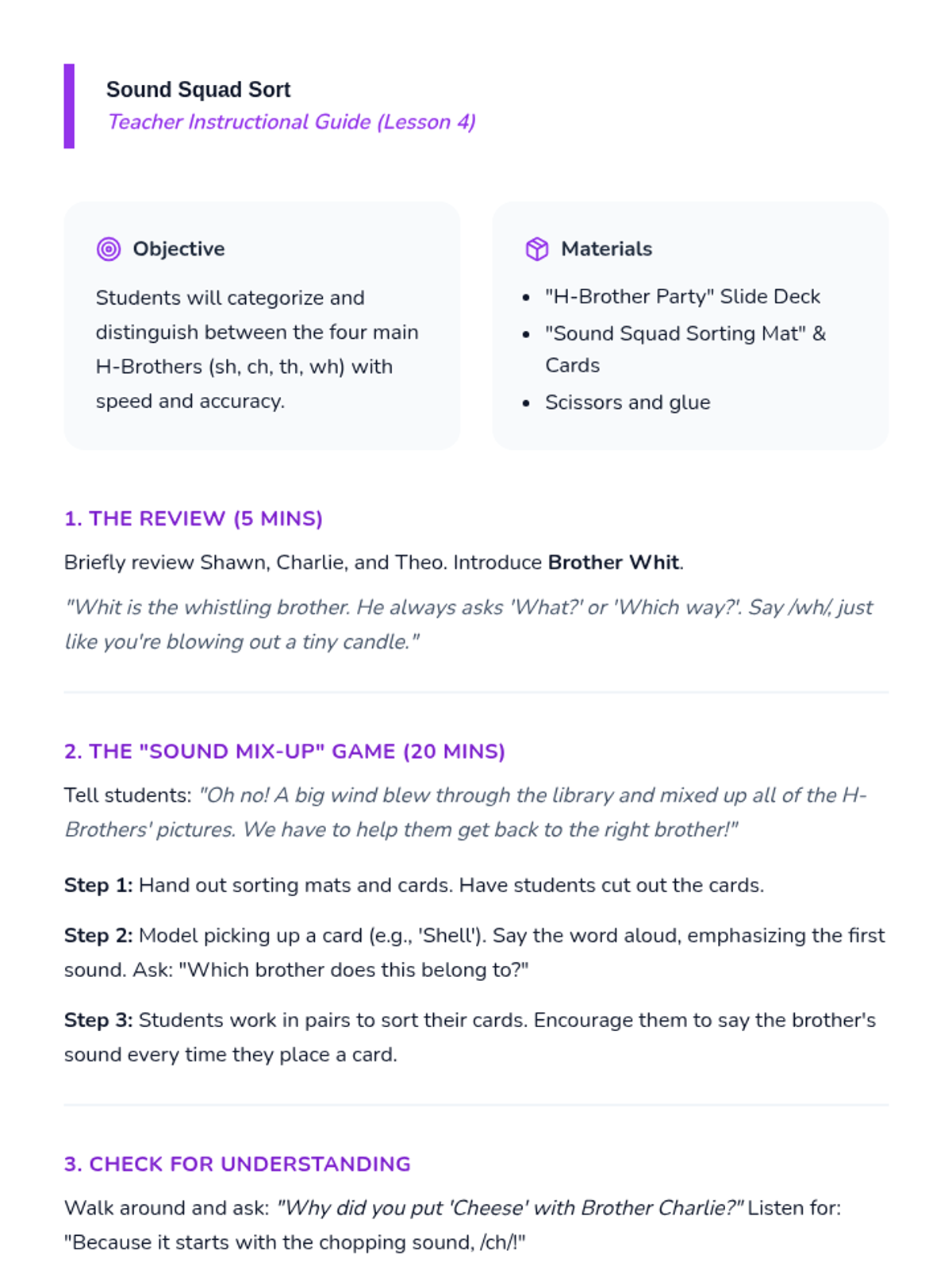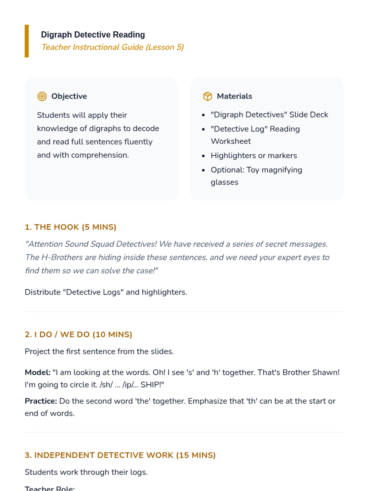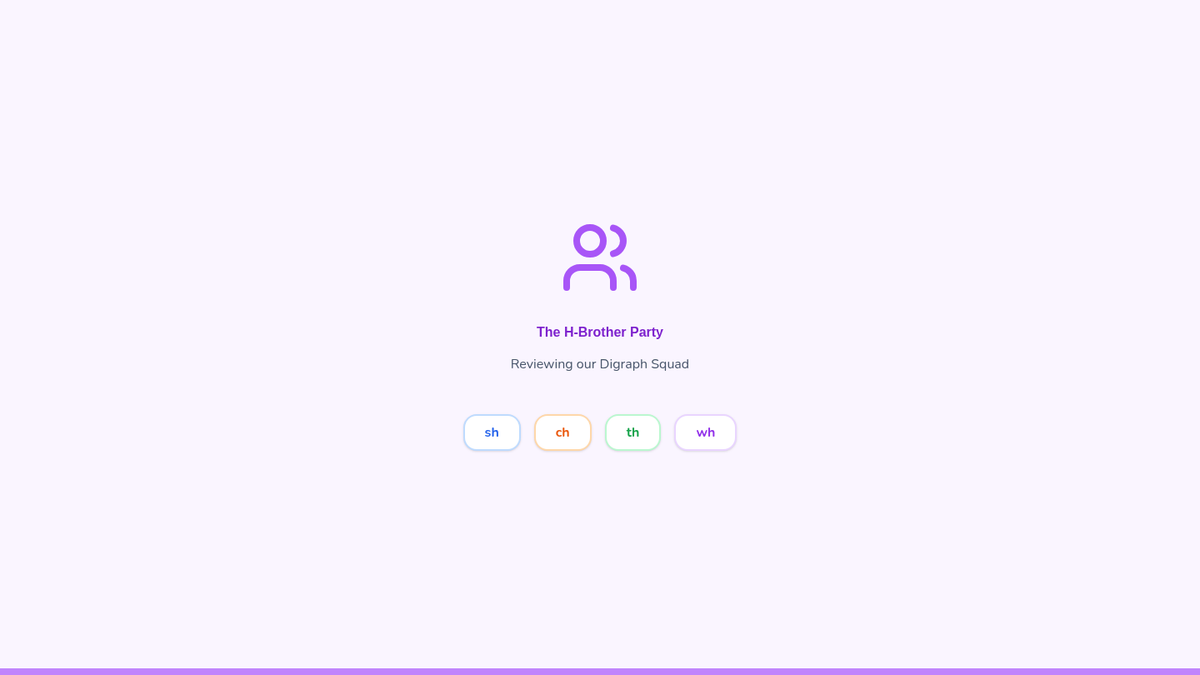 This Kindergarten ELA sequence introduces students to consonant digraphs (sh, ch, th, wh) through the 'H-Brothers' narrative. Students move from auditory awareness to visual recognition and decoding in context using multisensory activities.