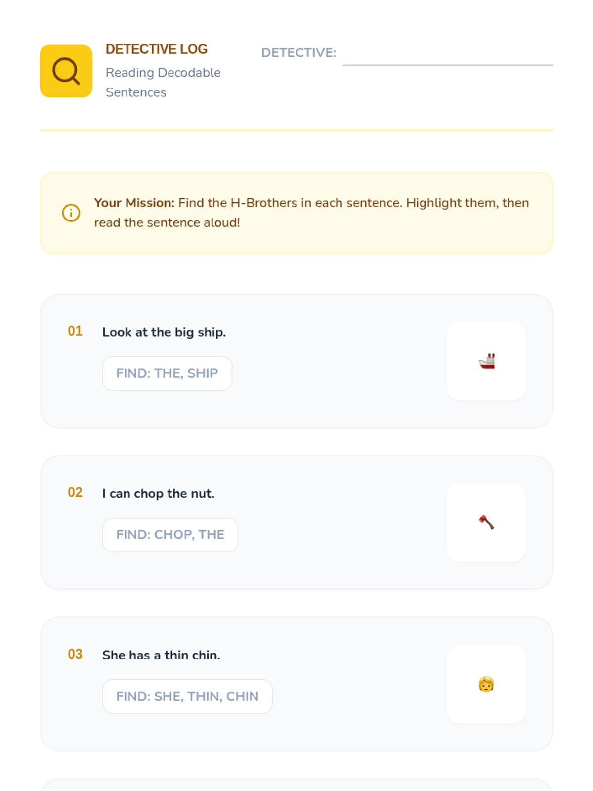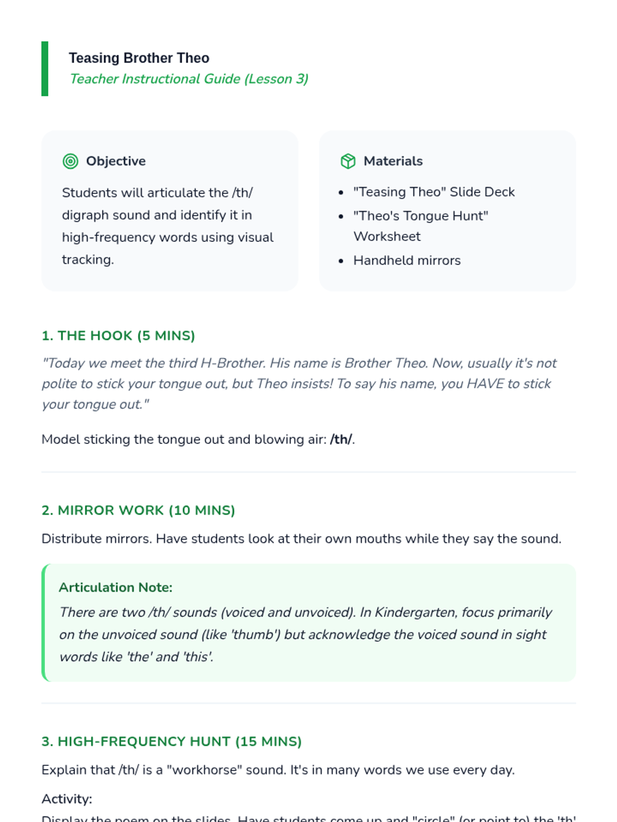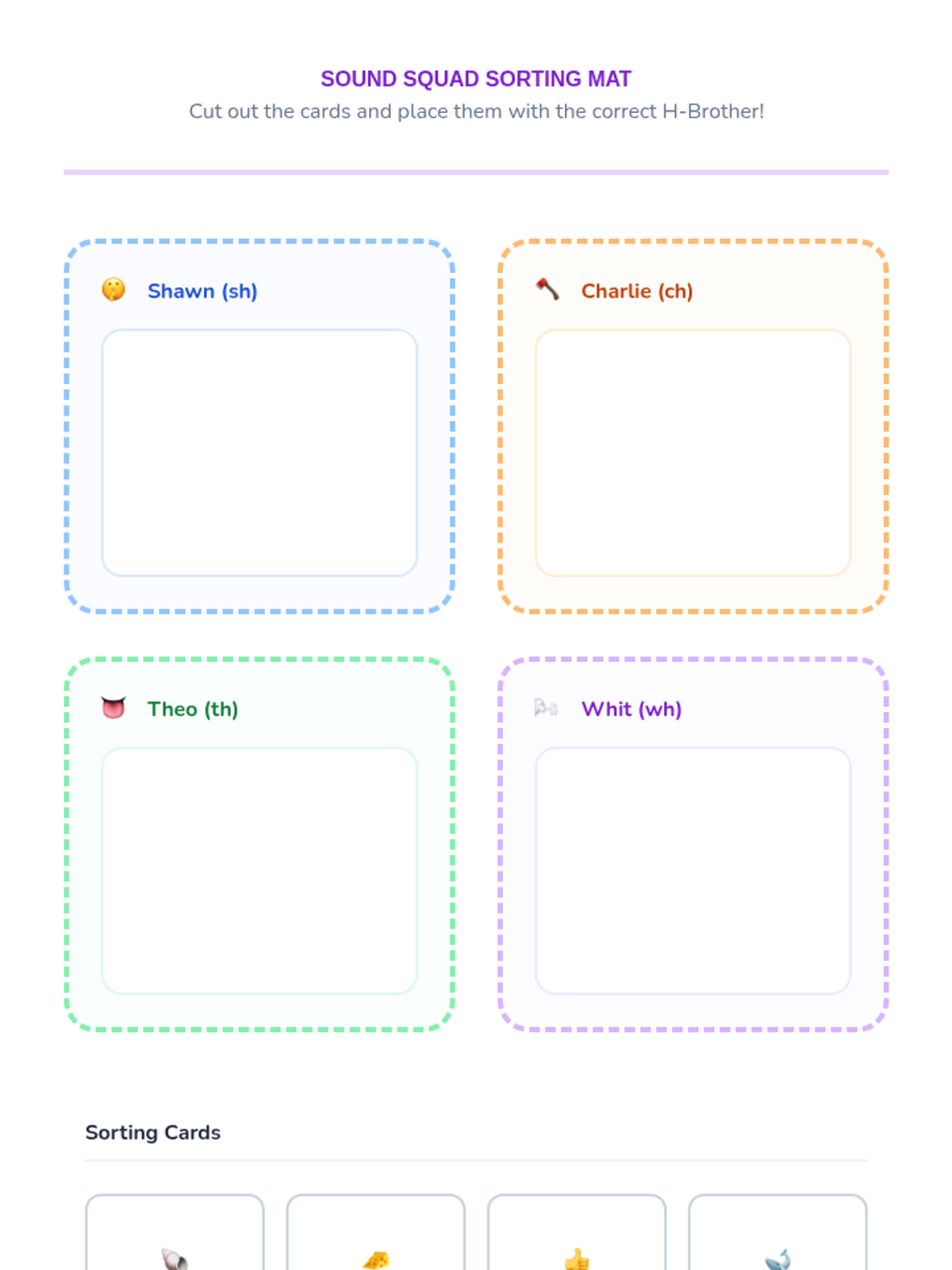 This Kindergarten ELA sequence introduces students to consonant digraphs (sh, ch, th, wh) through the 'H-Brothers' narrative. Students move from auditory awareness to visual recognition and decoding in context using multisensory activities.
