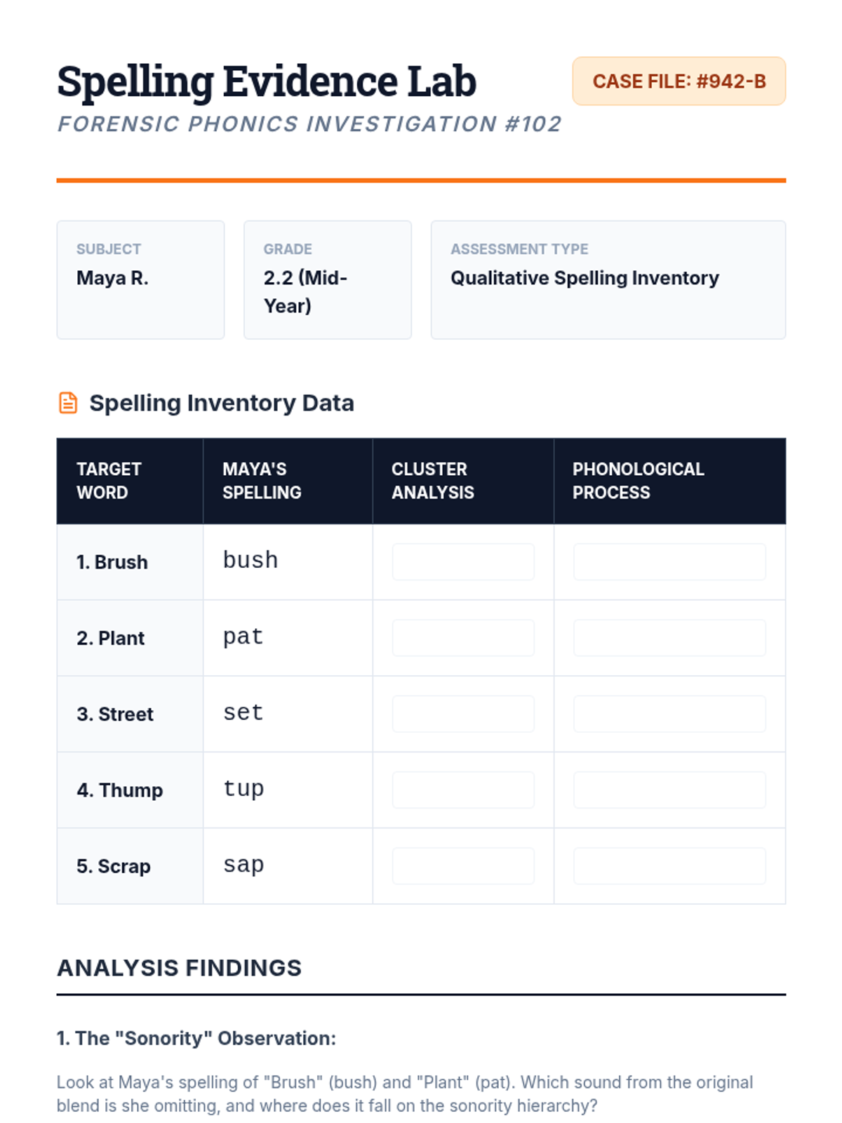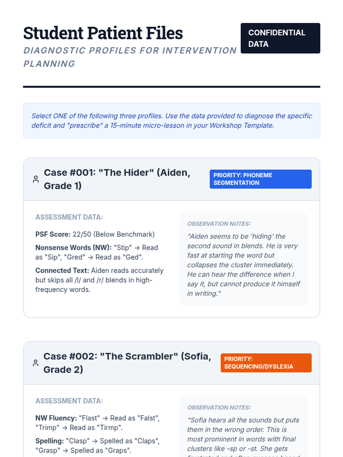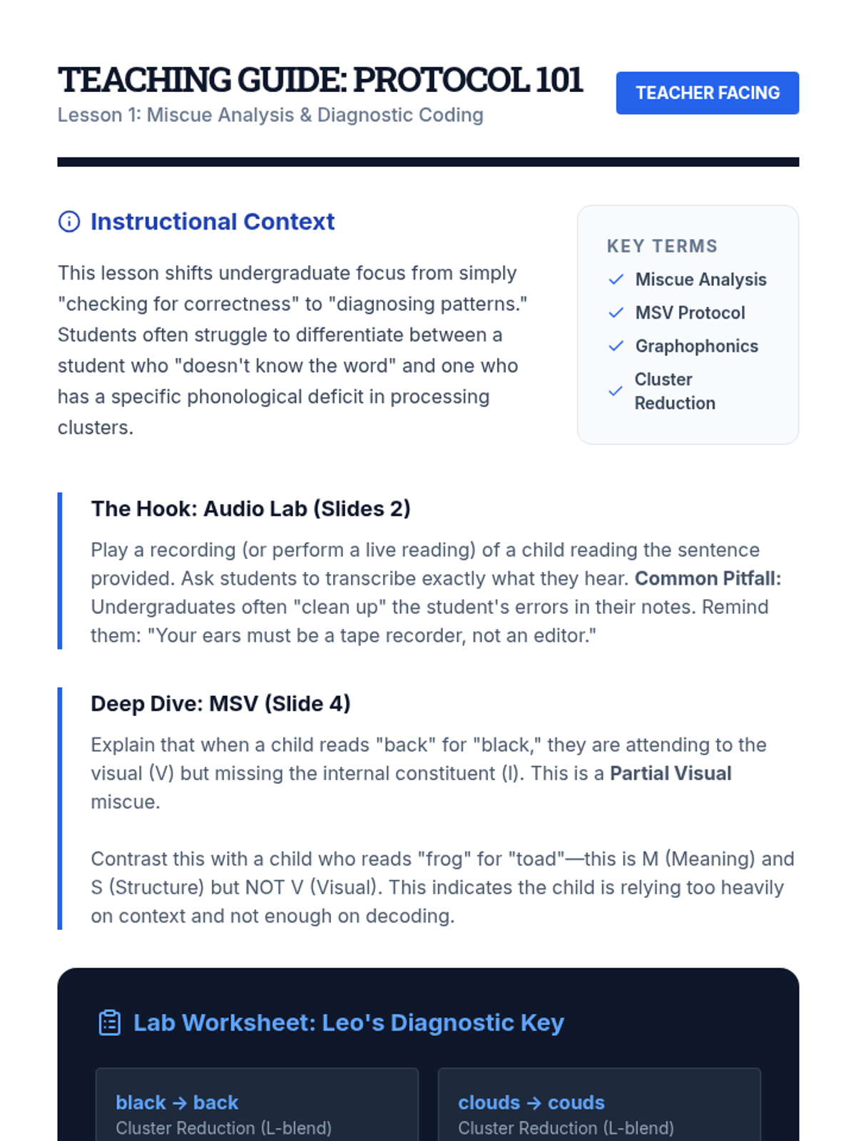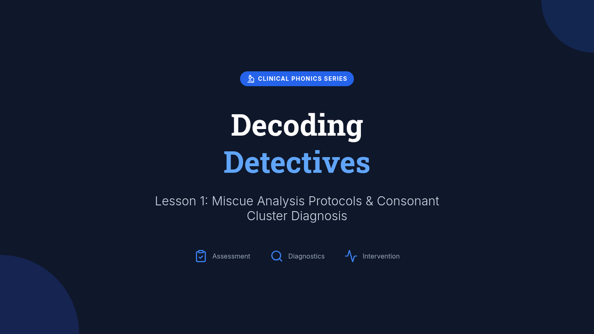 A clinical-themed sequence for undergraduate education students focusing on the diagnostic assessment and targeted intervention of decoding deficits related to blends, digraphs, and trigraphs. Students learn to use miscue analysis, identify phonological patterns like cluster reduction, and design multisensory interventions for students with dyslexia.