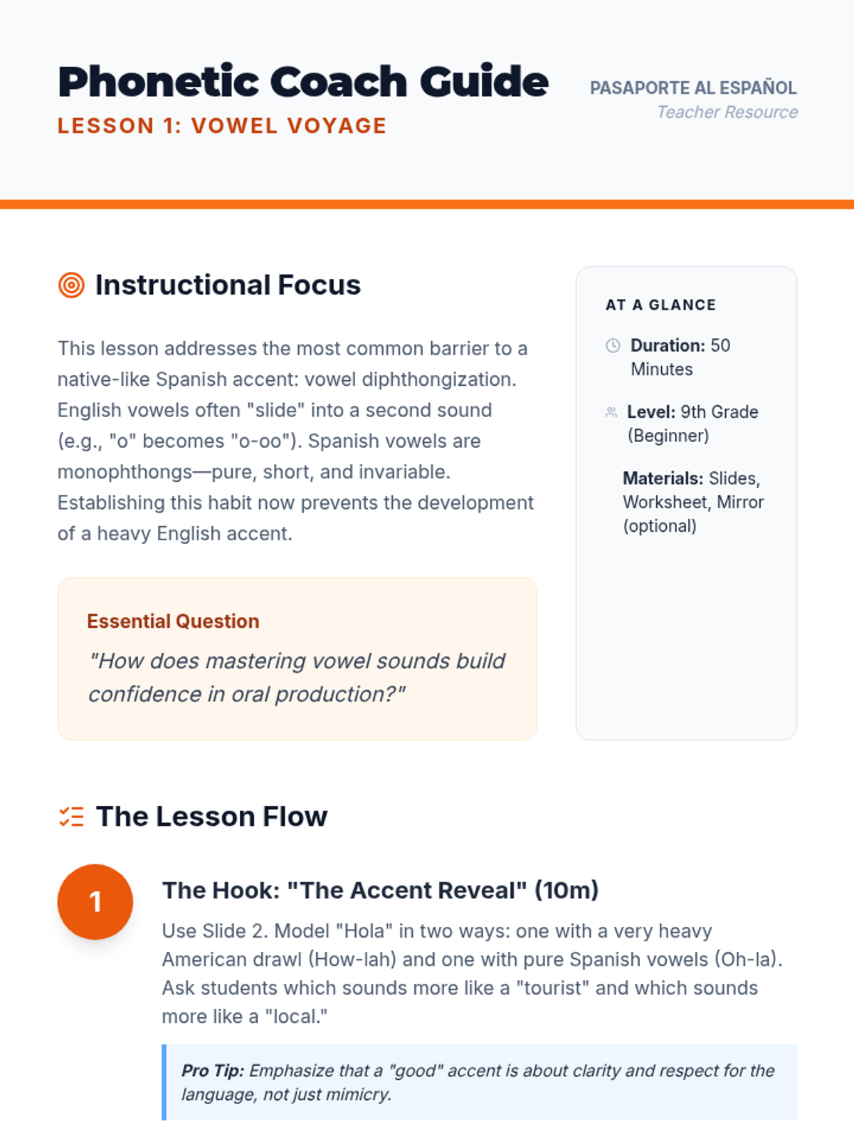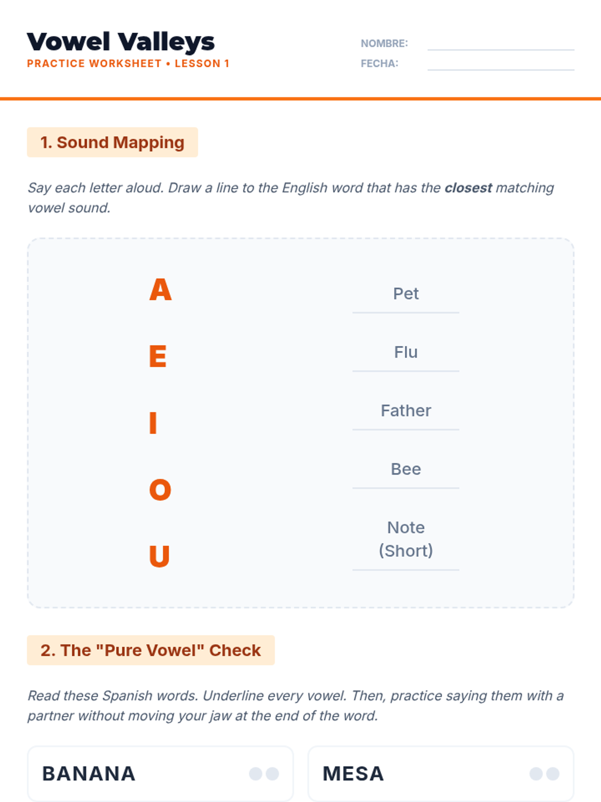 This sequence establishes foundational auditory and oral skills for Spanish fluency, focusing on vowel sounds, difficult consonants like 'rr' and 'ñ', and rules of stress and accentuation. Students transition from sound production to reading syllables and full words with accuracy.
