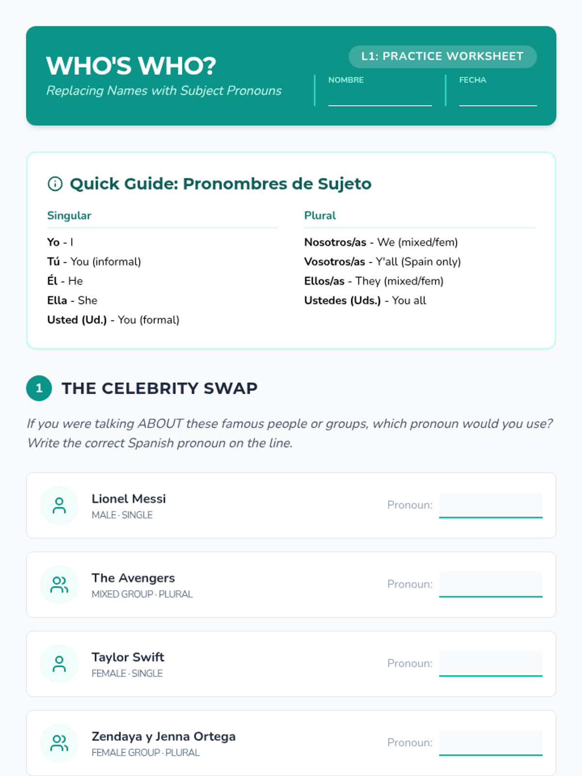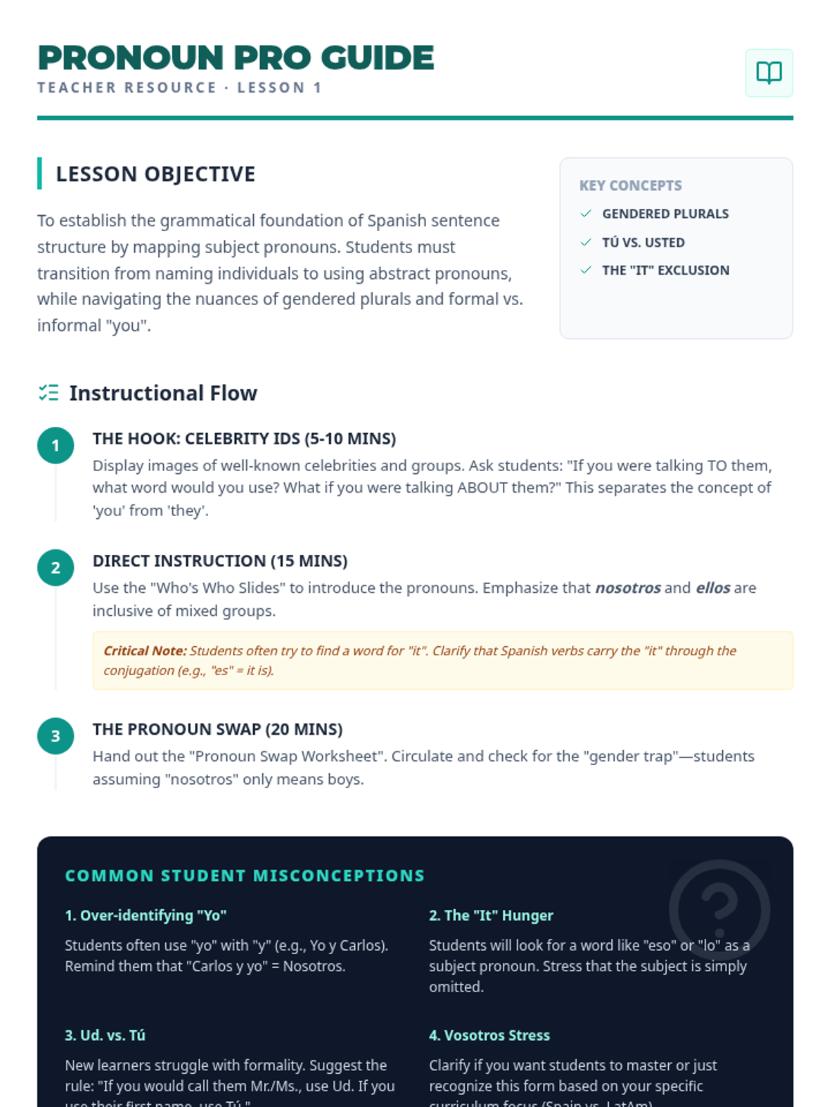 A 5-lesson sequence for 7th-grade students to master Spanish greetings, introductions, and the cultural nuances of formal vs. informal address (tú vs. usted). Students move from basic vocabulary to complex social simulations.