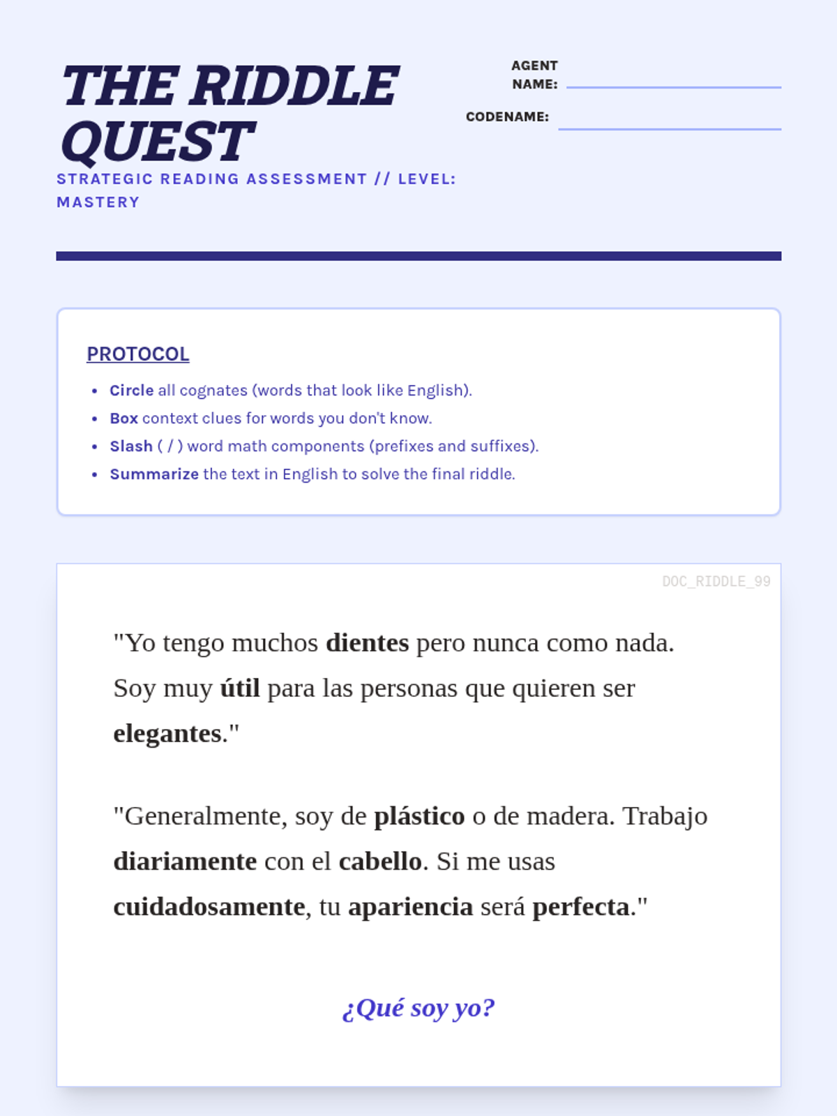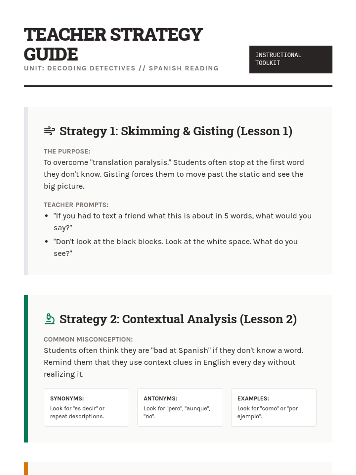 A 9th-grade Spanish reading unit focusing on metacognitive strategies for decoding unfamiliar texts. Students learn to use context clues, word morphology, and gisting to navigate ambiguity in Spanish language materials.
