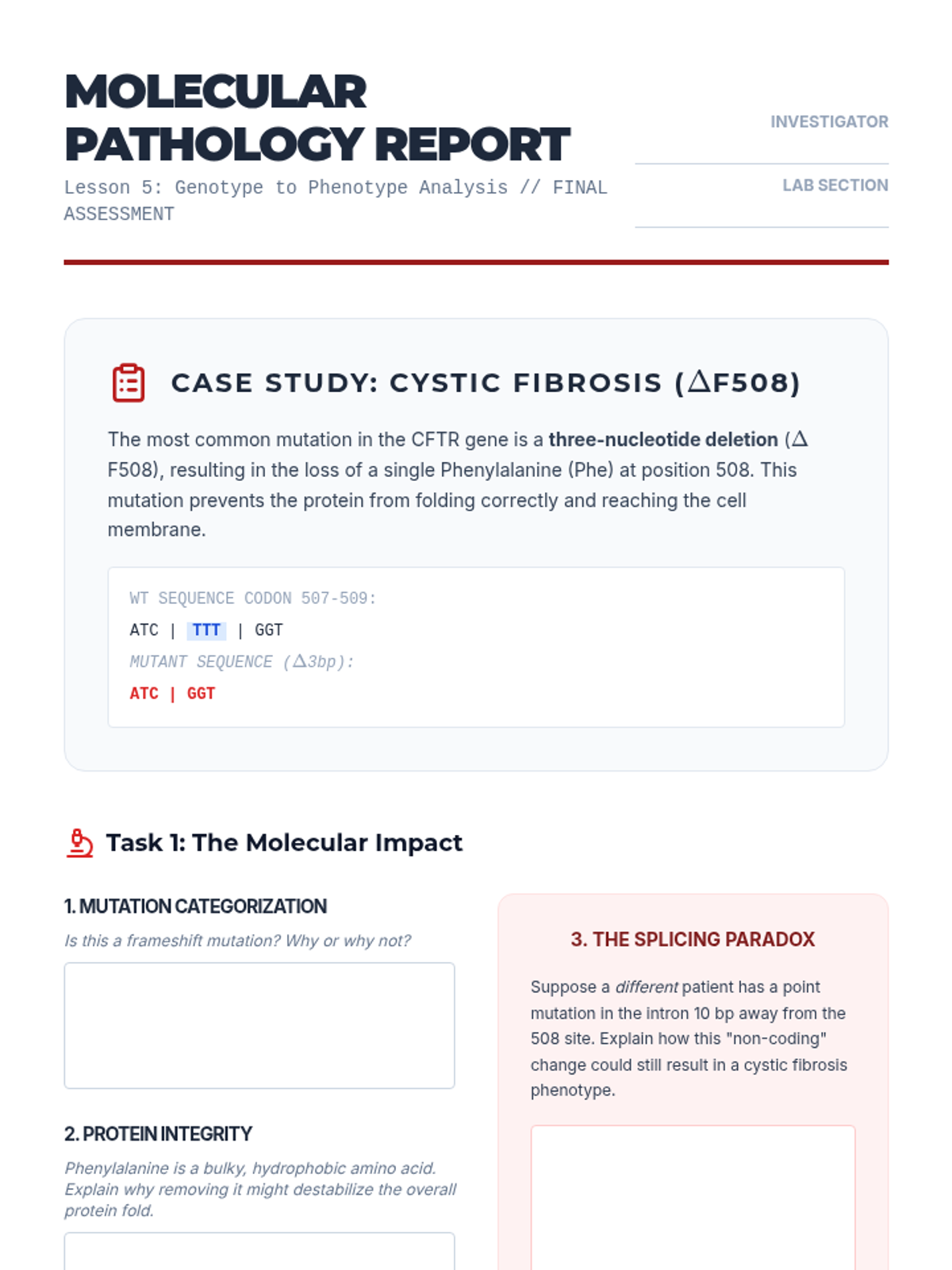 This undergraduate biology sequence explores the Central Dogma, focusing on how DNA is decoded into functional proteins. Students analyze the genetic code, transcription regulation, RNA processing, and translation mechanics to predict the effects of mutations on phenotype.