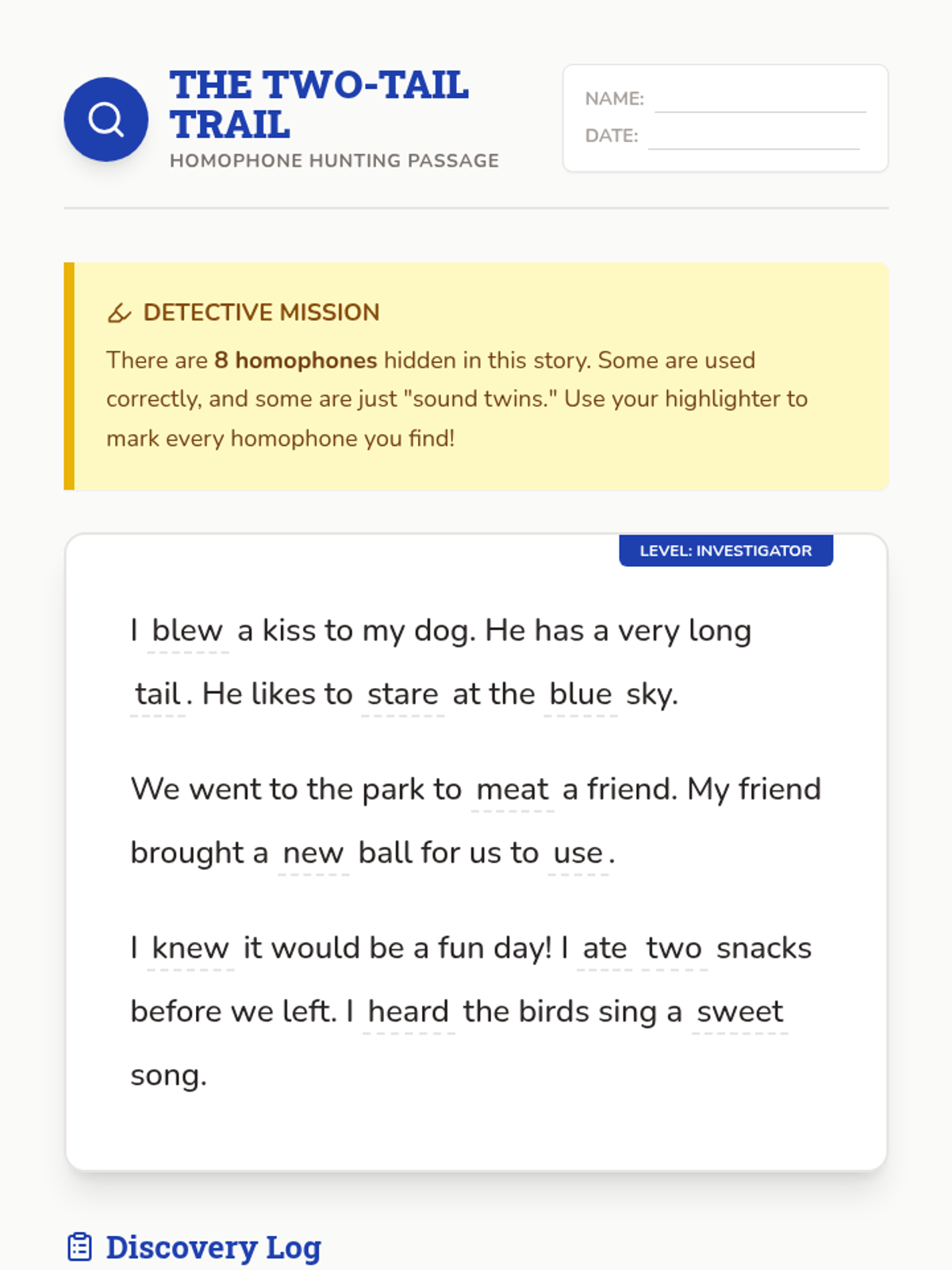 An inquiry-based English Language Arts sequence for 1st Grade students where they act as 'text detectives' to decode homophones and homonyms. Students explore how spelling affects meaning through literature, case studies, and context clue puzzles.