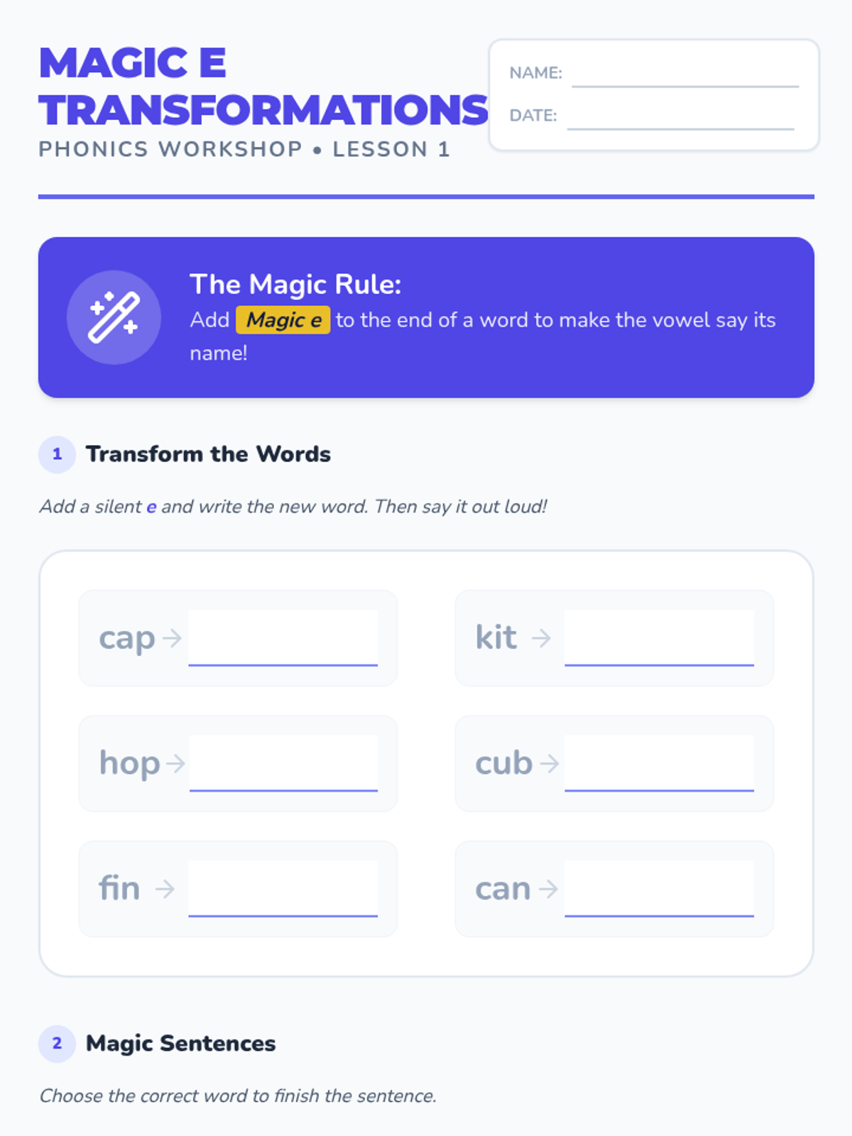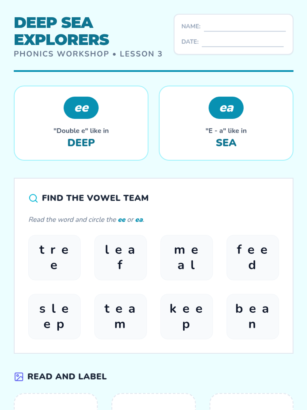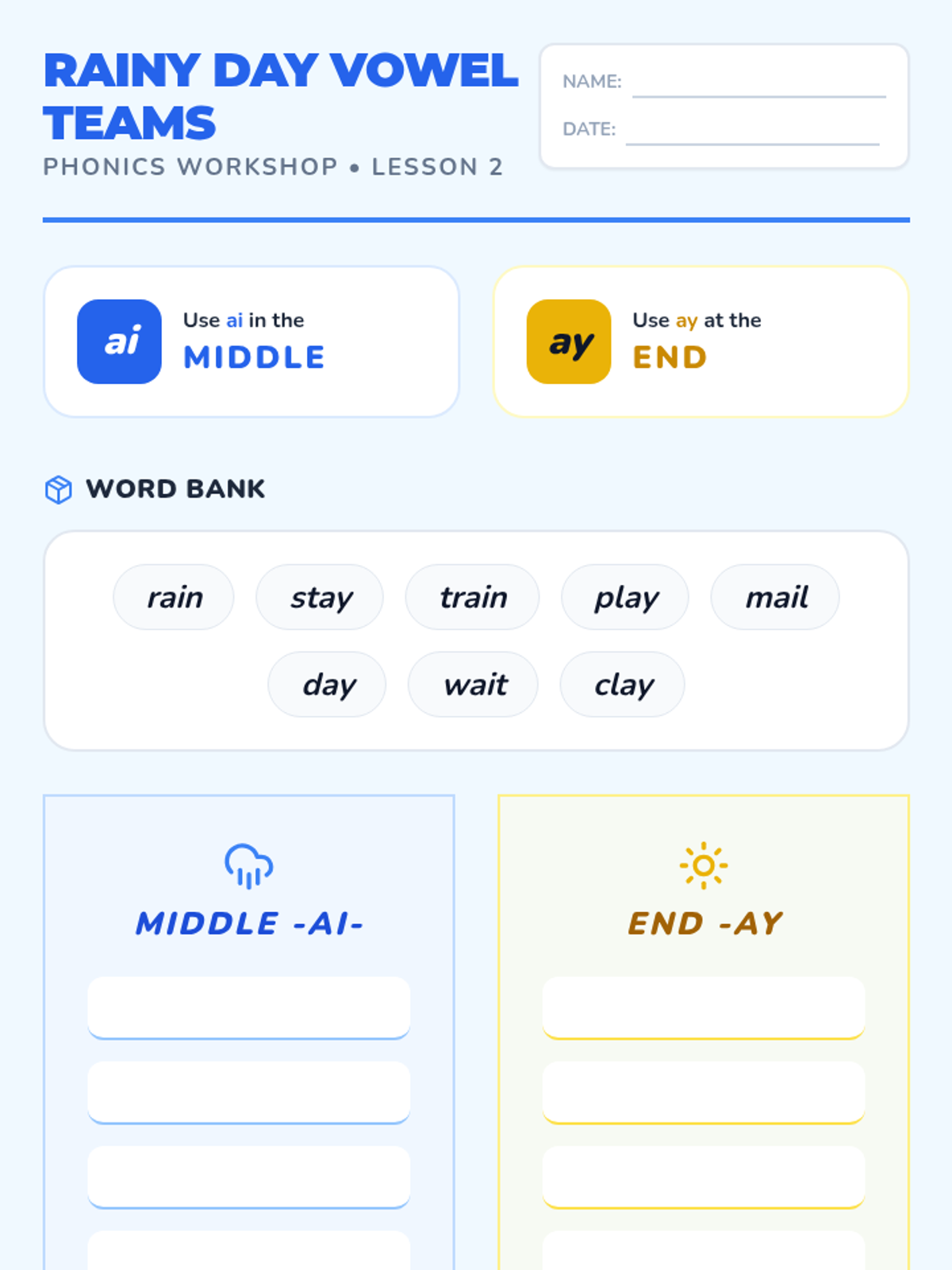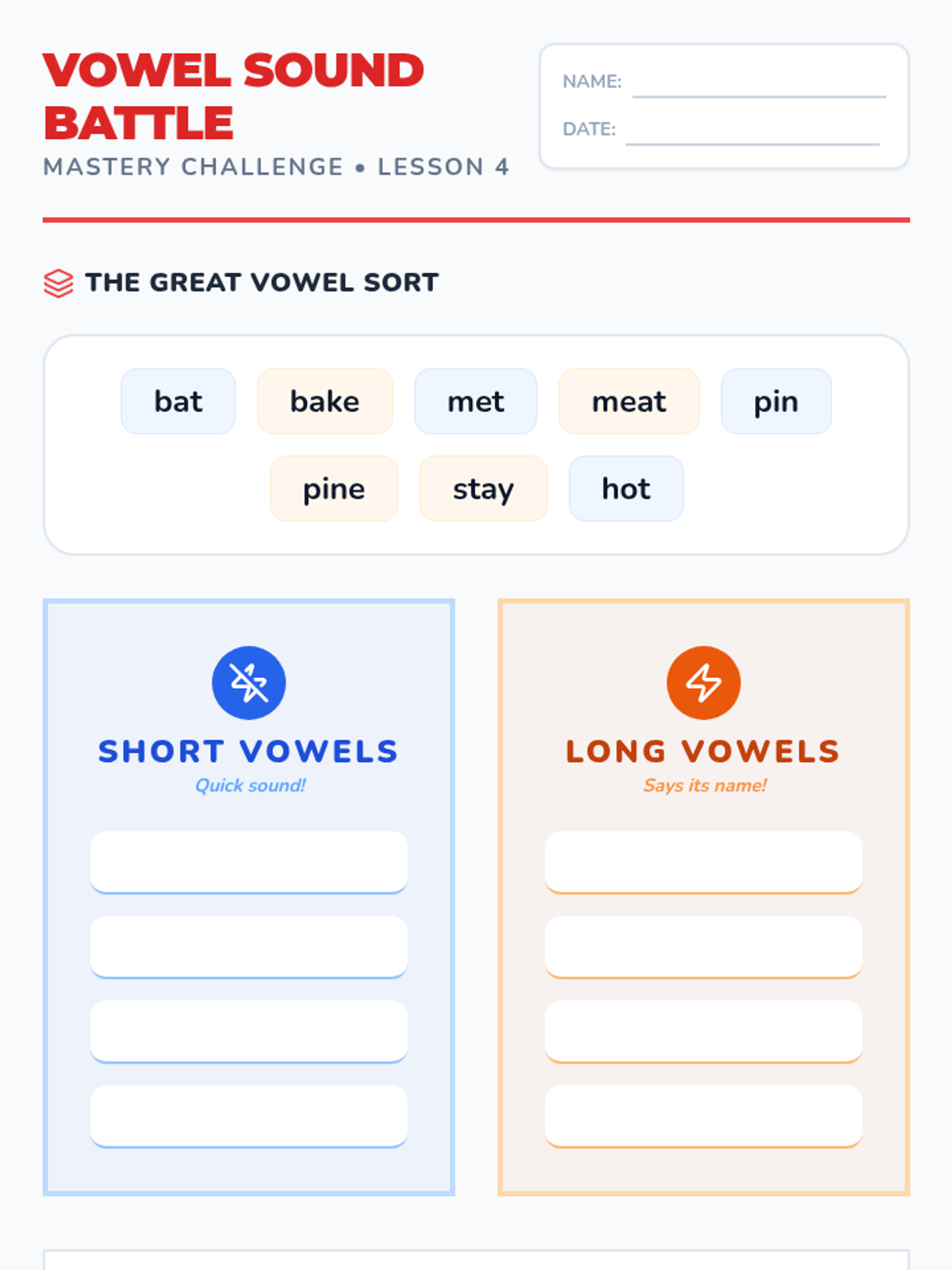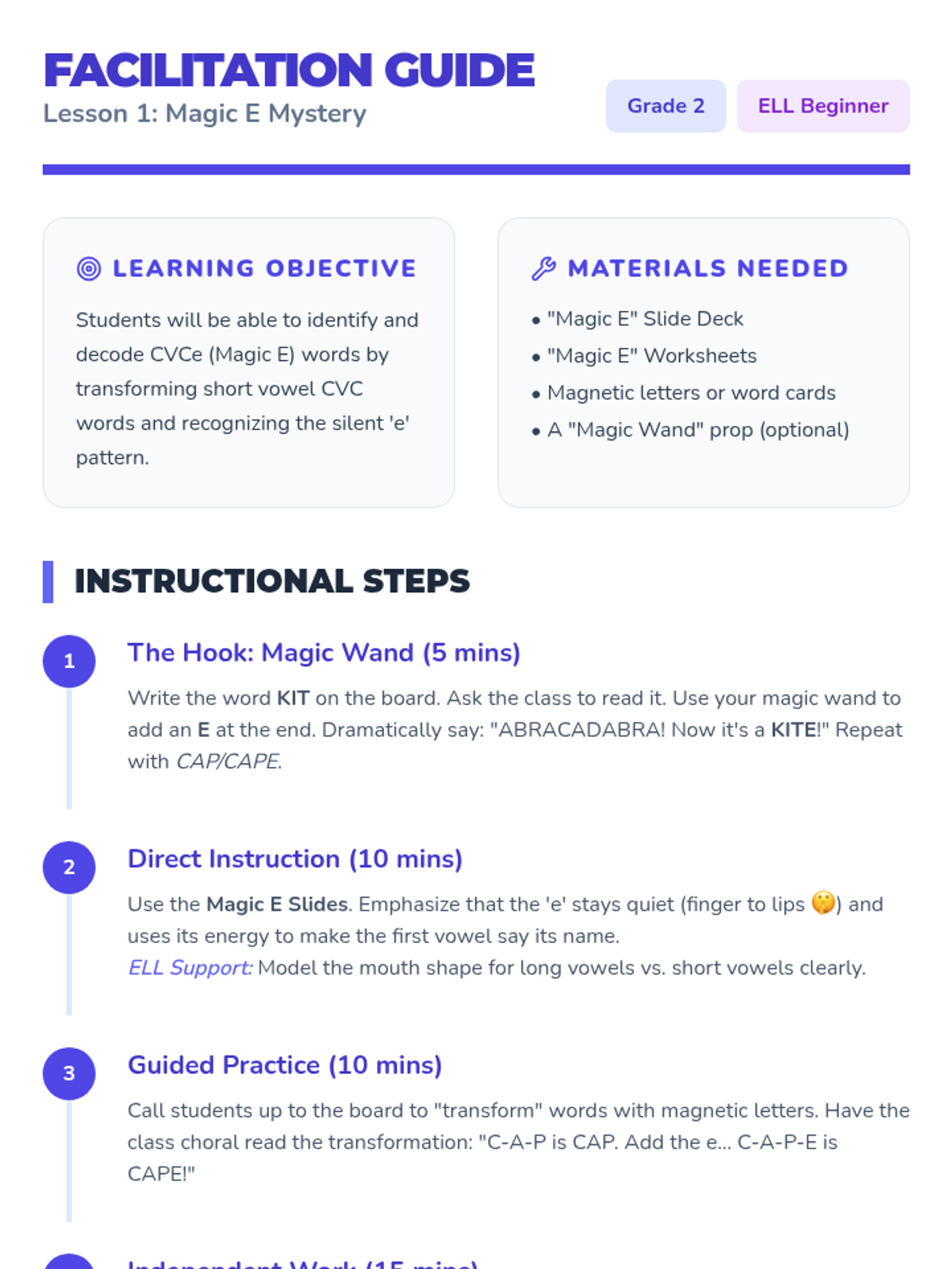 A comprehensive 2nd-grade phonics sequence designed for English Language Learners, focusing on the transition from short to long vowel sounds. Students will master the 'silent e' rule and common vowel teams (ai, ay, ee, ea) through interactive workshops, sorting activities, and decodable texts.