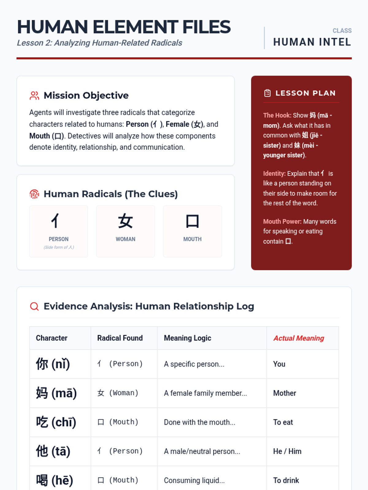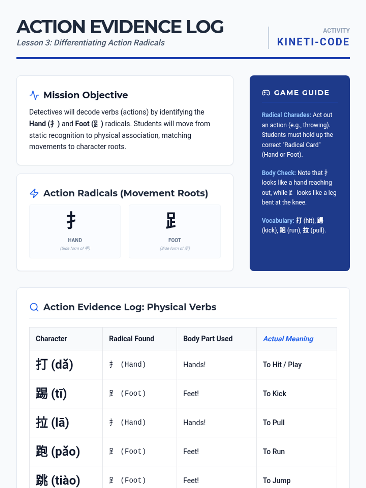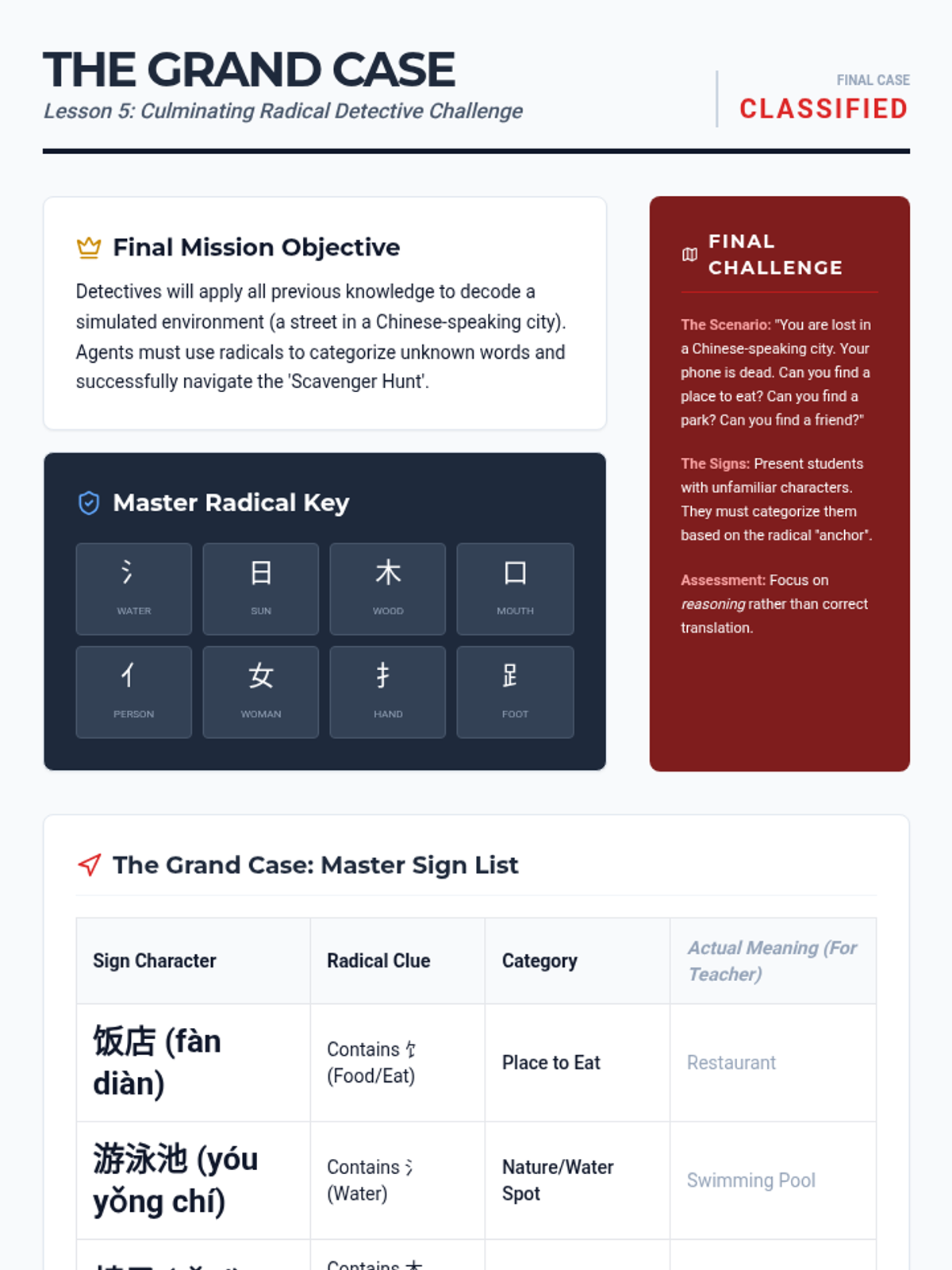 A 5-lesson inquiry-based sequence where 5th-grade students become 'Linguistic Detectives' to decode Mandarin Chinese characters by analyzing their radicals. Students move from simple nature-based radicals to complex compound characters, culminating in a real-world decoding challenge.