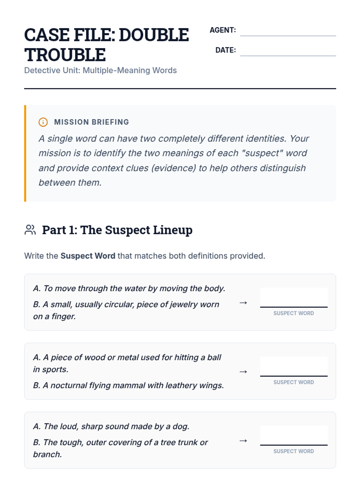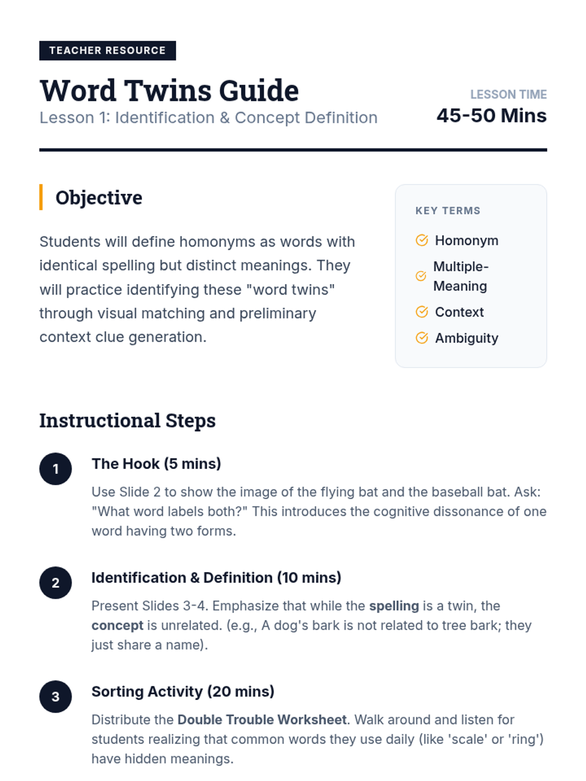 This sequence focuses on the critical reading skill of using context clues to determine the meaning of homonyms (words with the same spelling but different meanings). Students progress from identifying simple multiple-meaning words to analyzing heteronyms and using dictionary entries to navigate linguistic ambiguity.