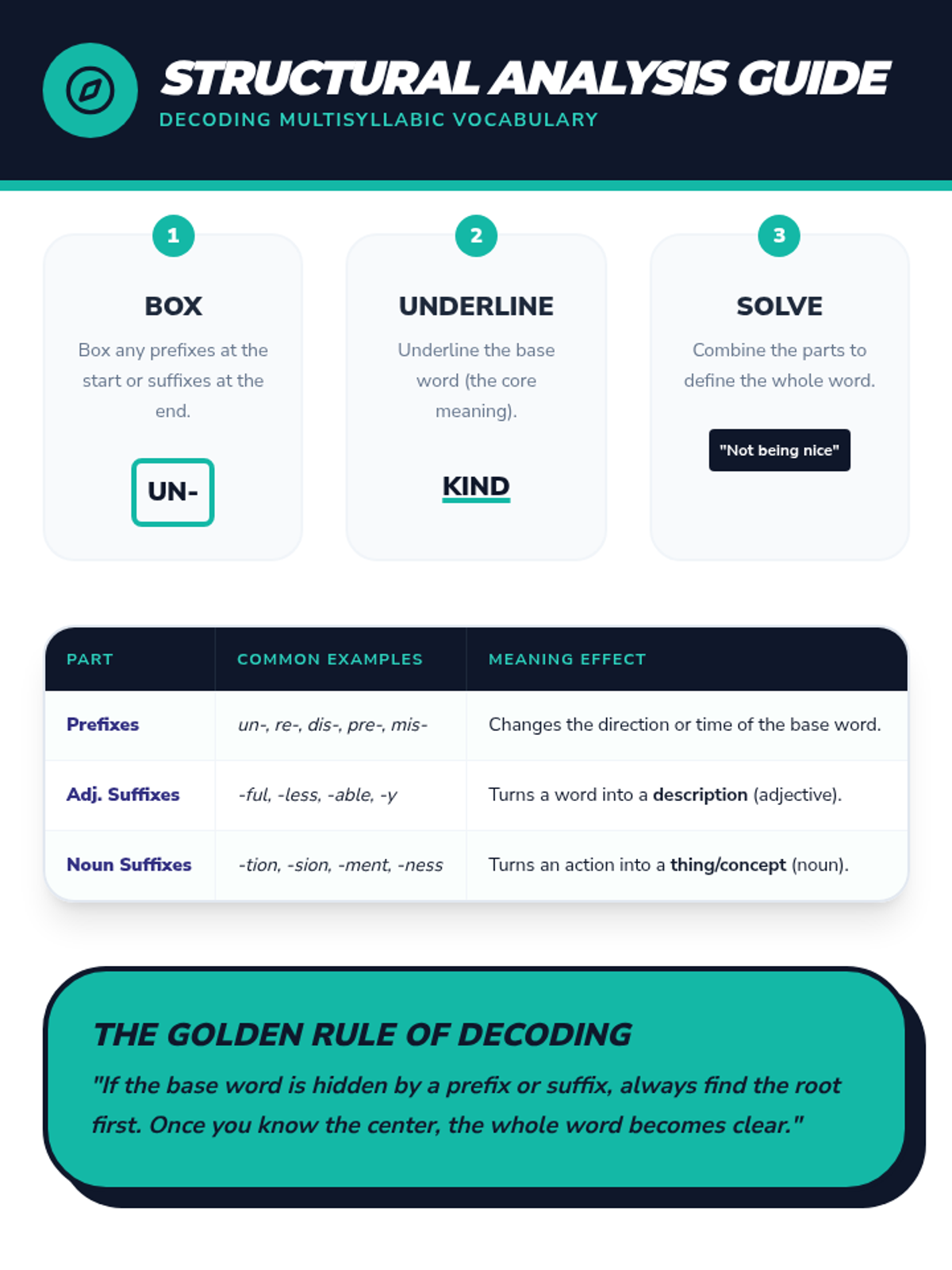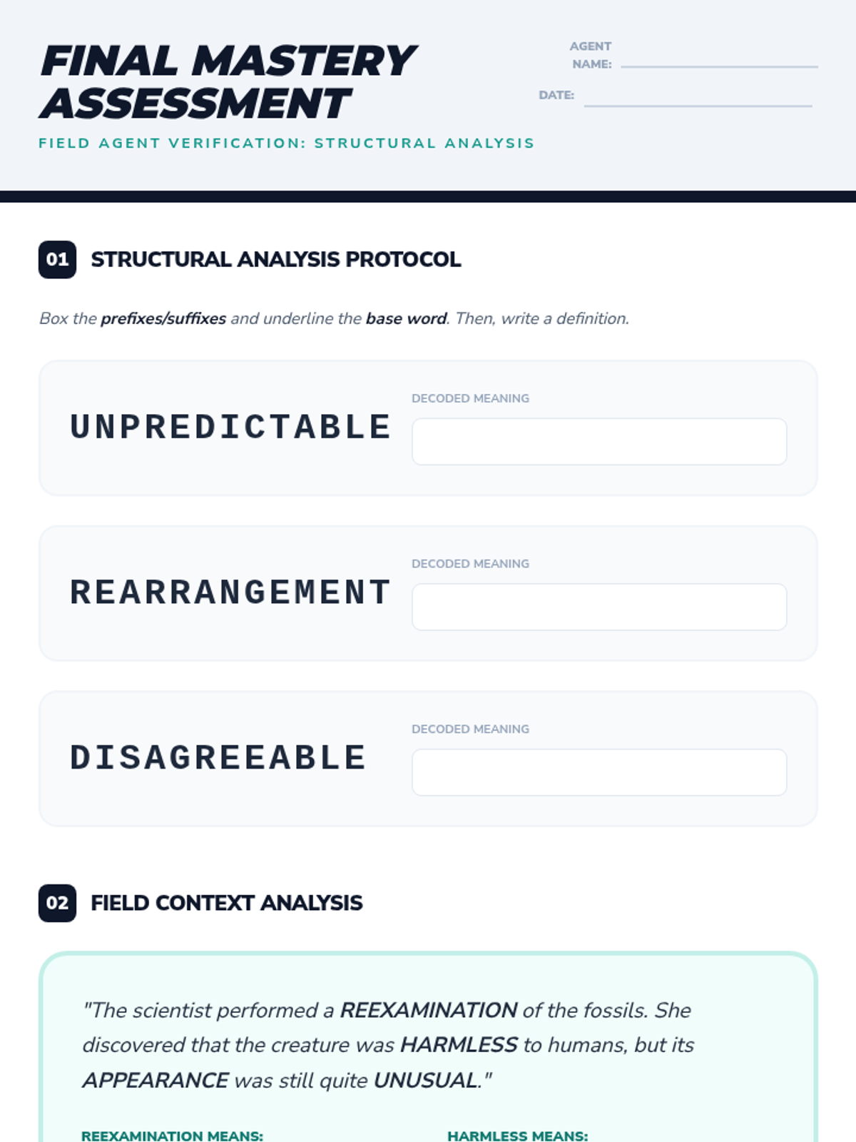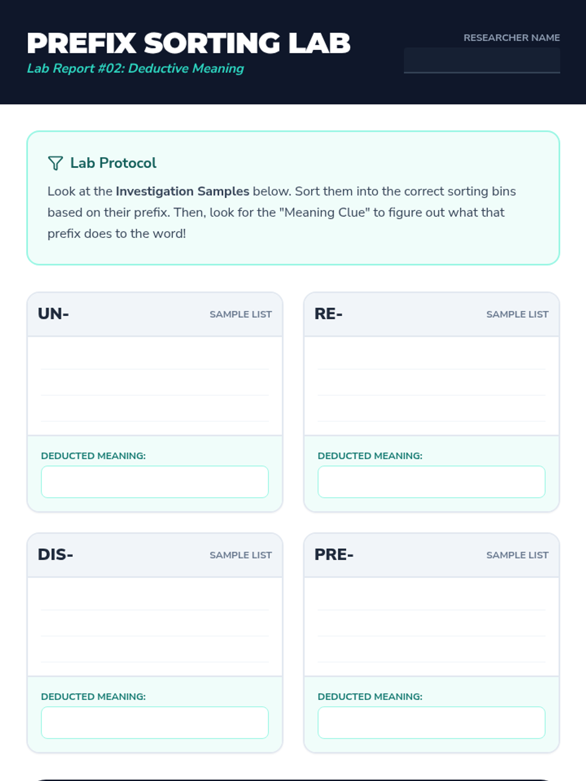 This inquiry-based sequence empowers students to dismantle complex vocabulary by analyzing prefixes, suffixes, and base words. Students progress from identifying root words to applying structural analysis strategies to decode unfamiliar words in context.