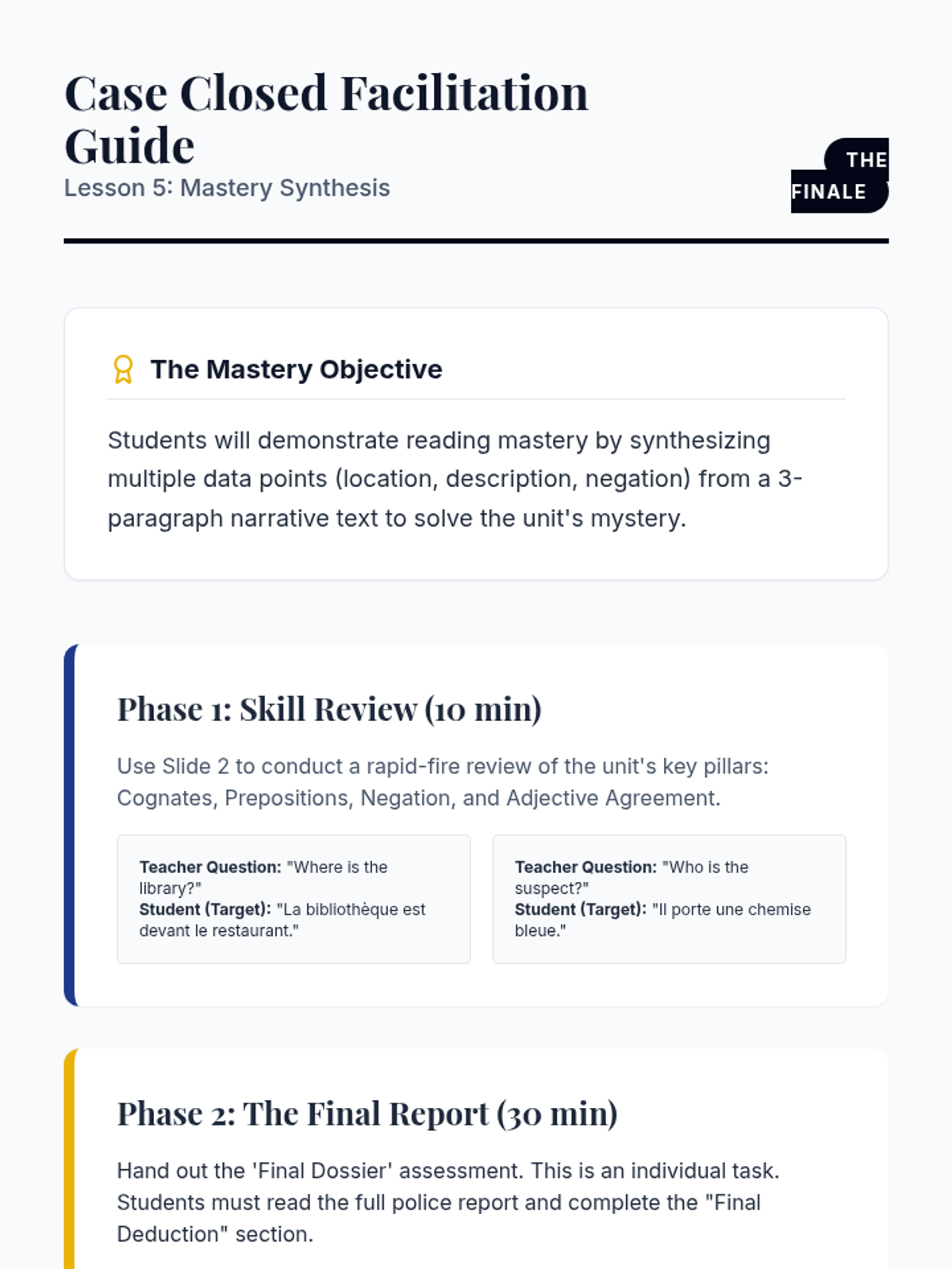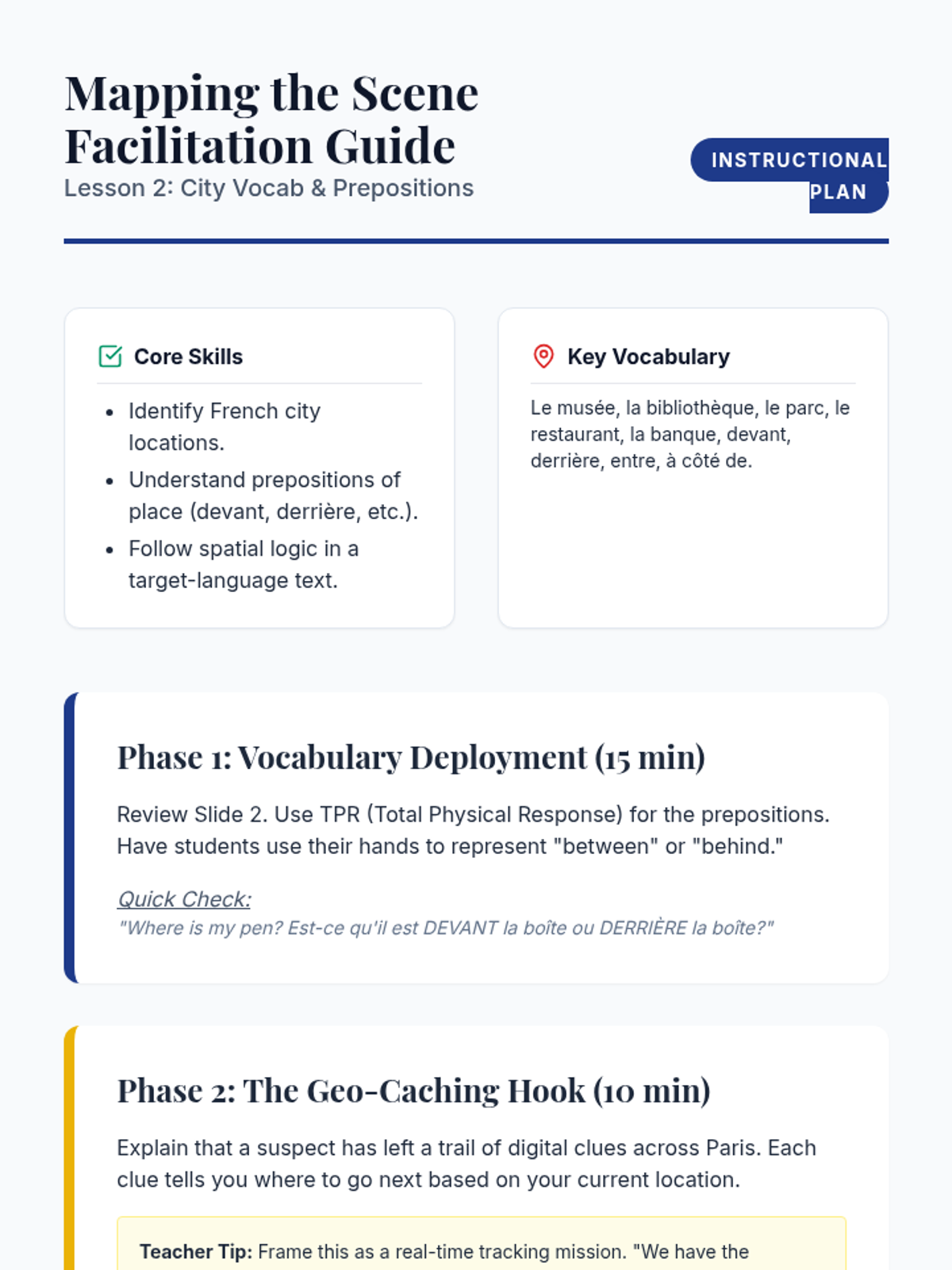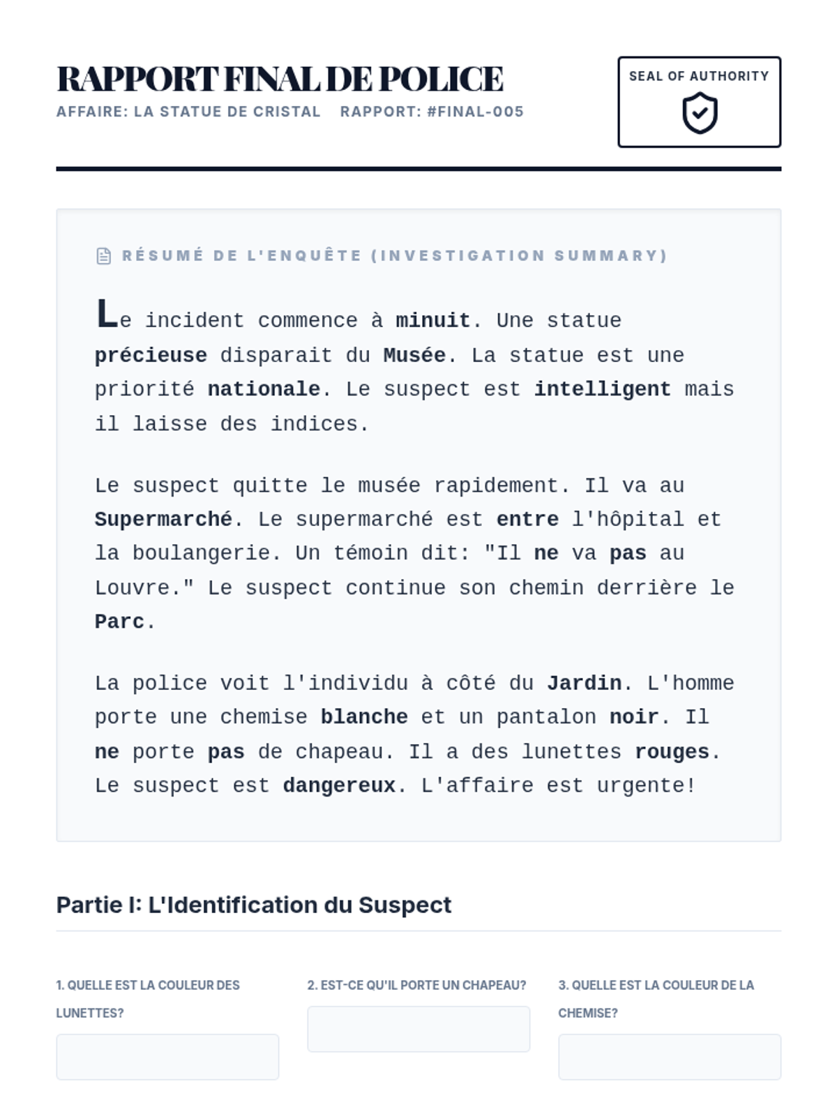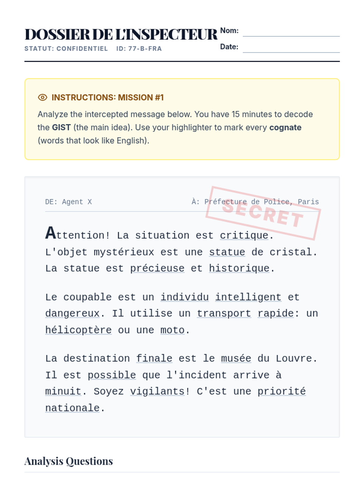 A gamified French reading unit for 11th graders using a detective narrative to teach cognates, city vocabulary, negation, and physical descriptions. Students act as 'inspecteurs' to solve a mystery while building linguistic resilience and decoding skills.