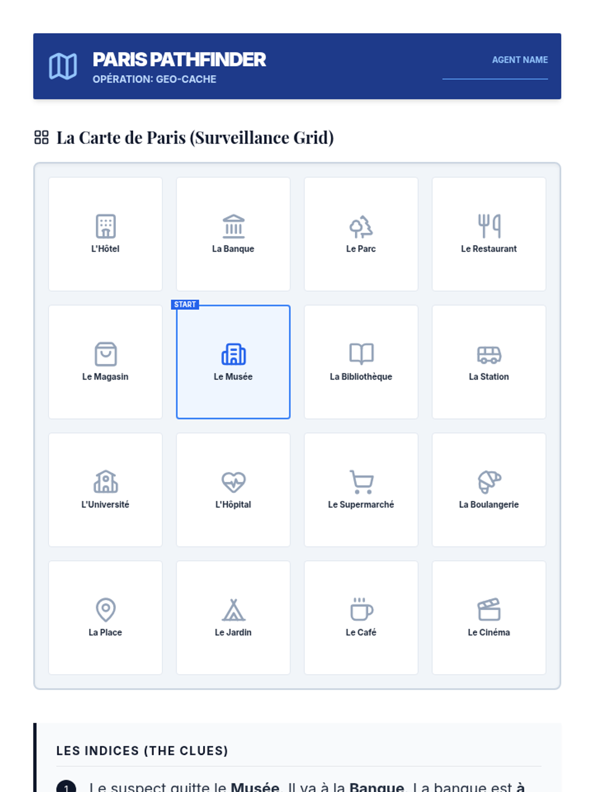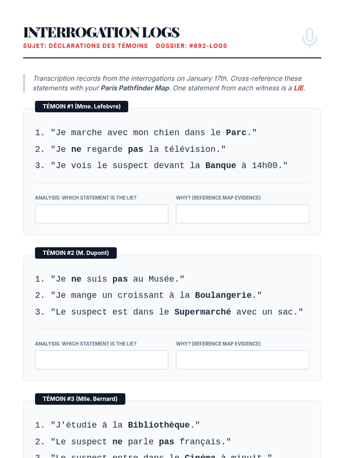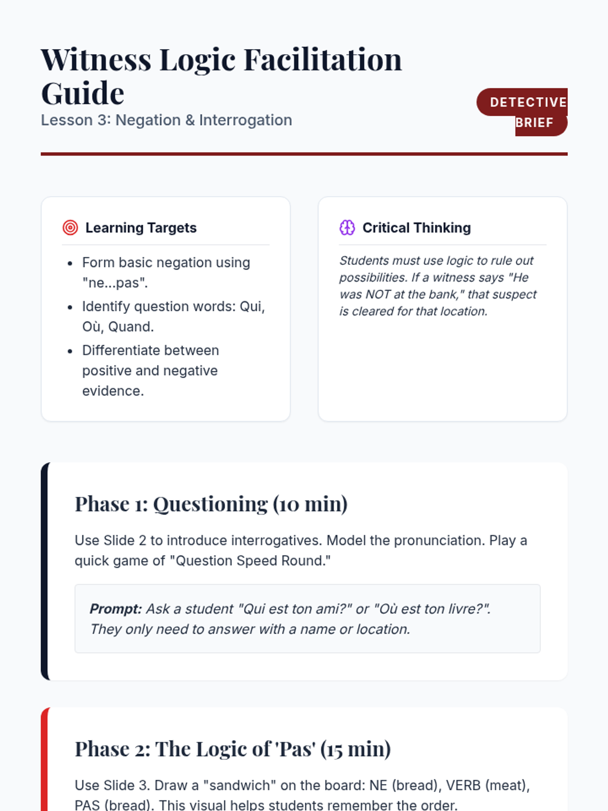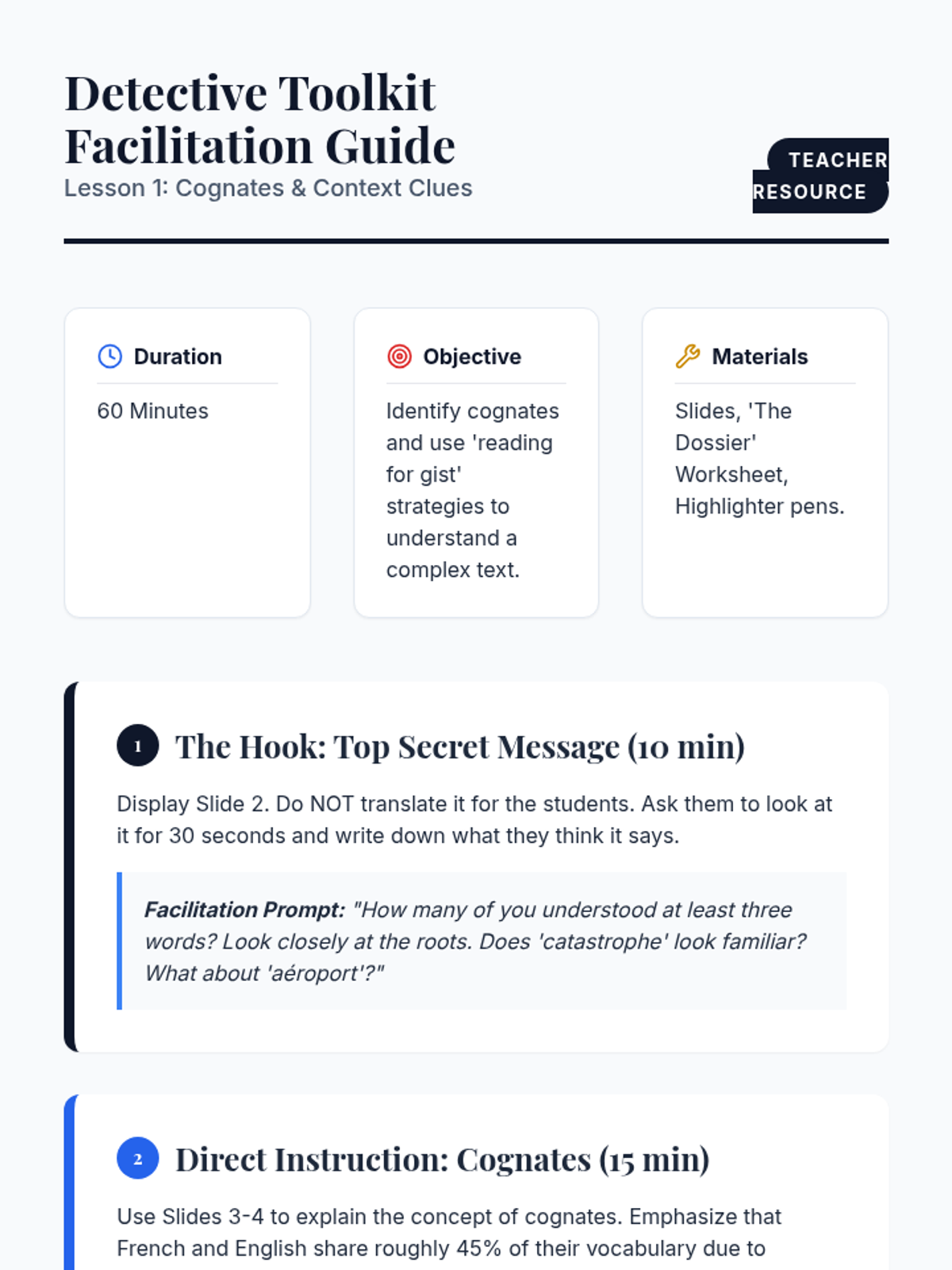 A gamified French reading unit for 11th graders using a detective narrative to teach cognates, city vocabulary, negation, and physical descriptions. Students act as 'inspecteurs' to solve a mystery while building linguistic resilience and decoding skills.