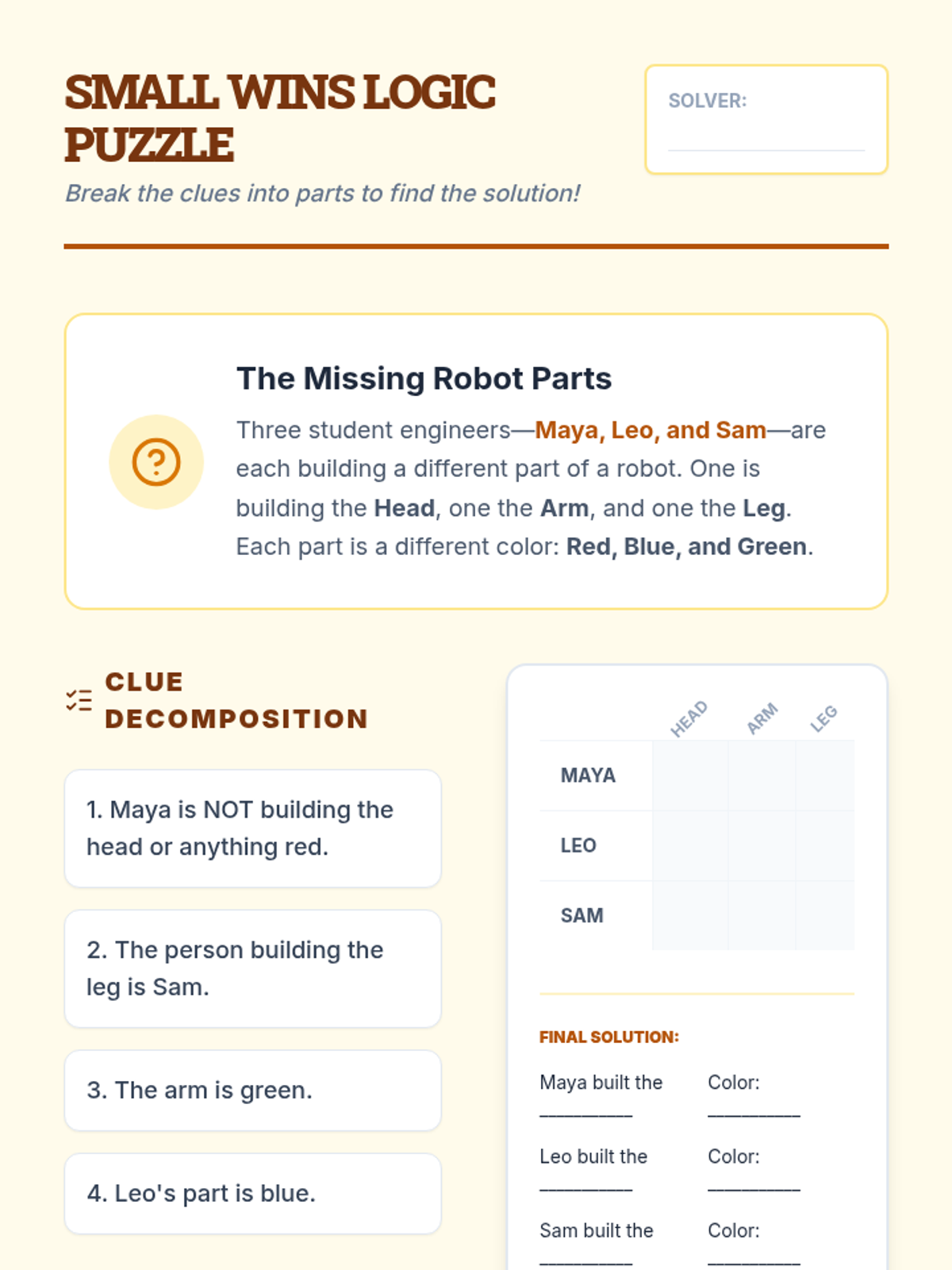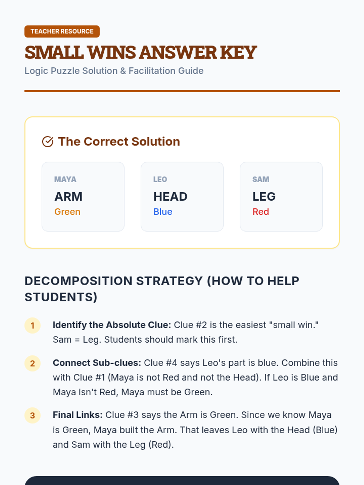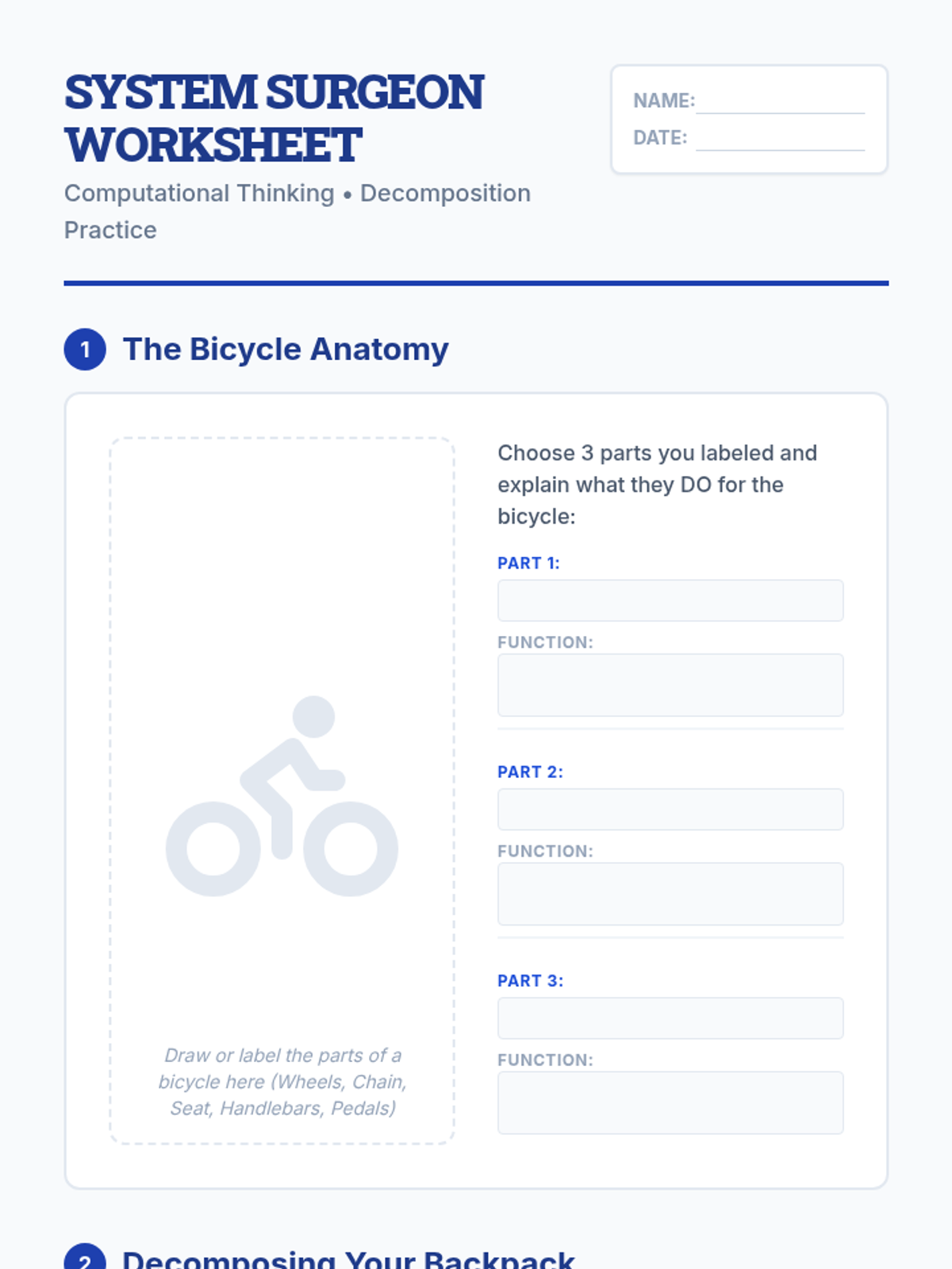 A computer science sequence for 3rd graders focused on decomposition—the process of breaking down complex objects, tasks, and narratives into manageable parts to solve problems effectively.