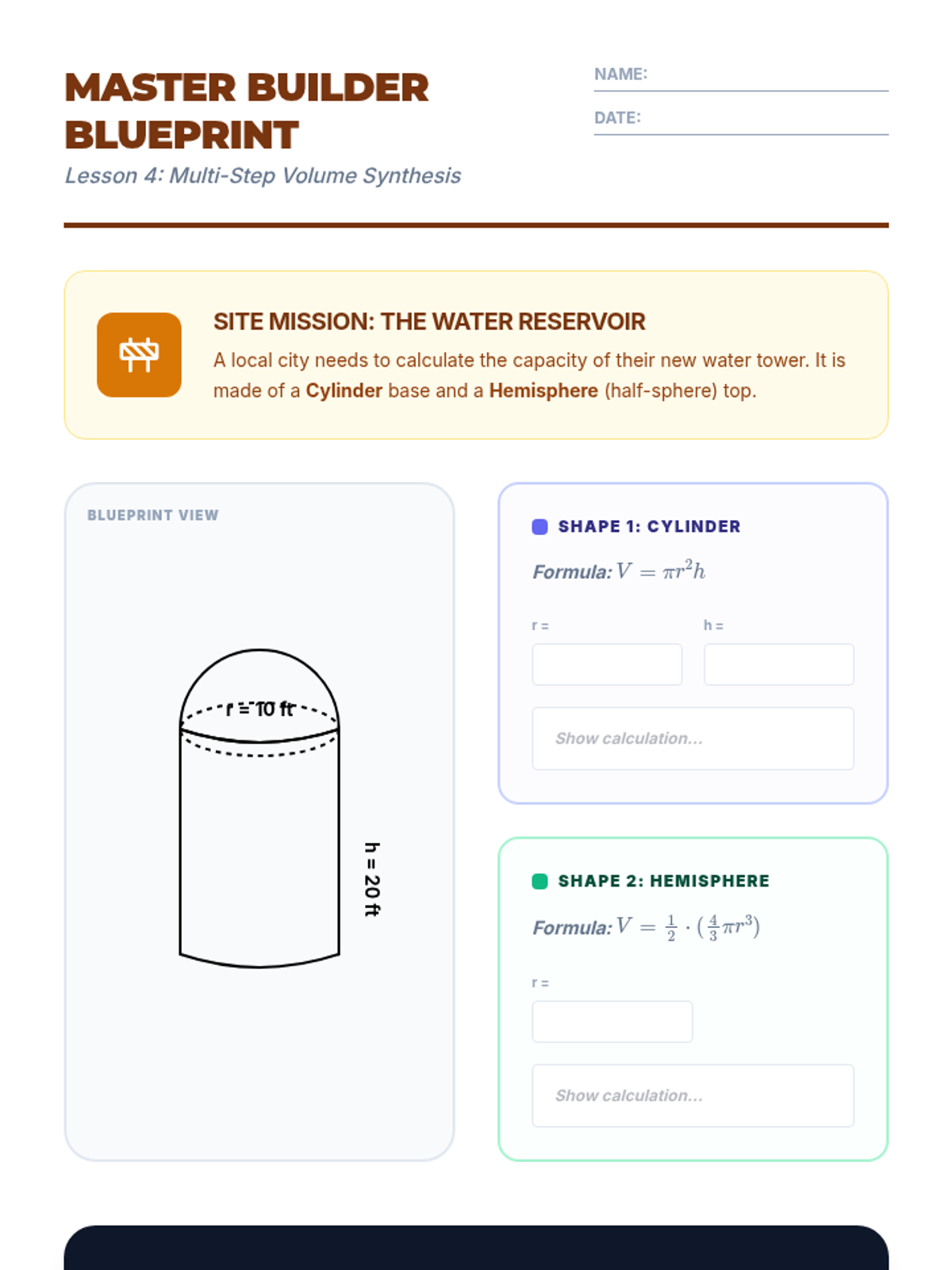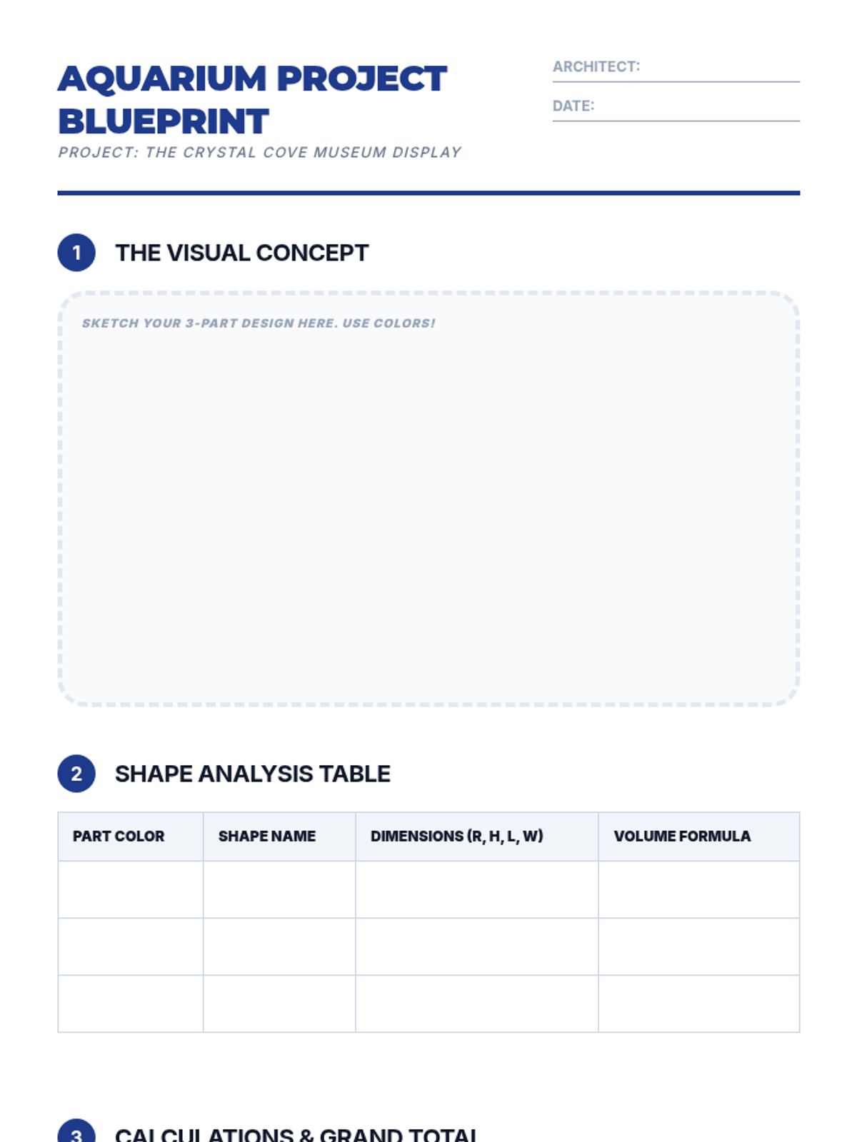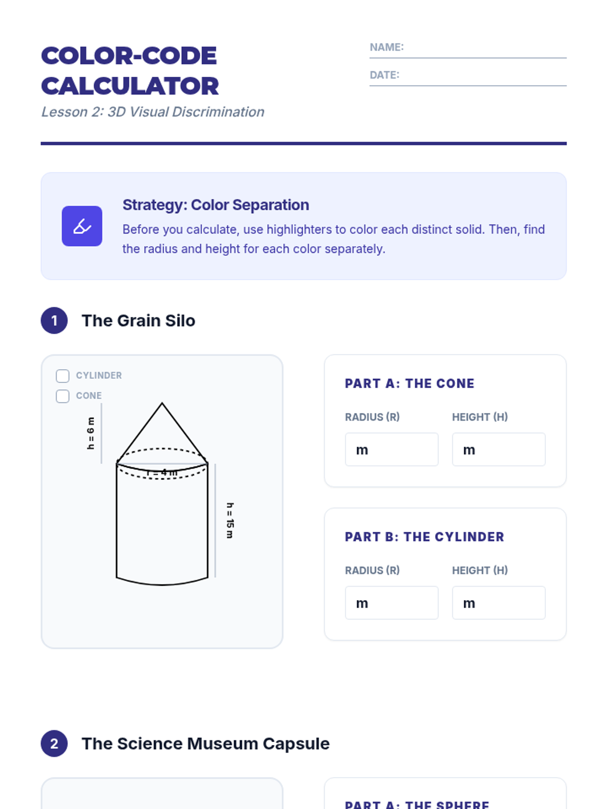 A sequence focused on breaking down complex geometric shapes into manageable parts. Students use color-coding, physical manipulation, and organized calculations to solve 2D area and 3D volume problems, culminating in a design challenge.
