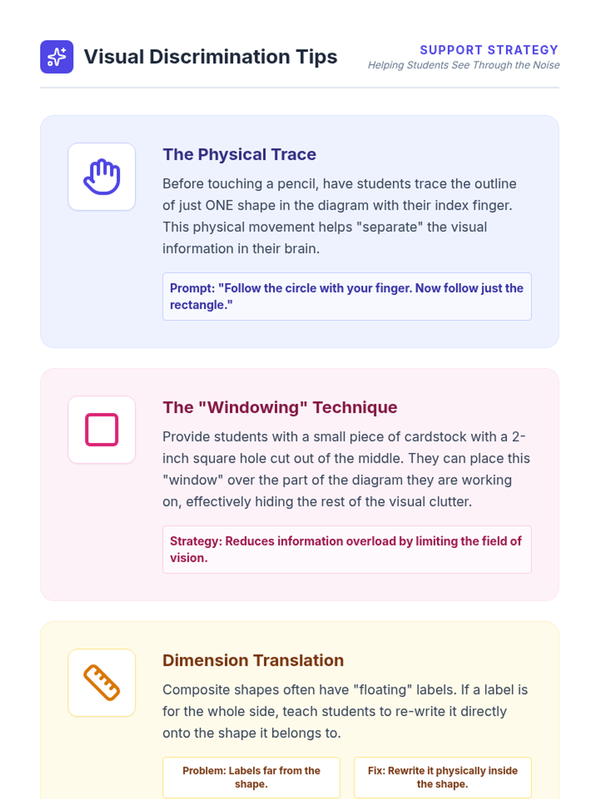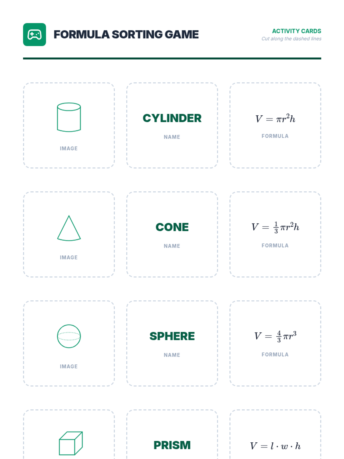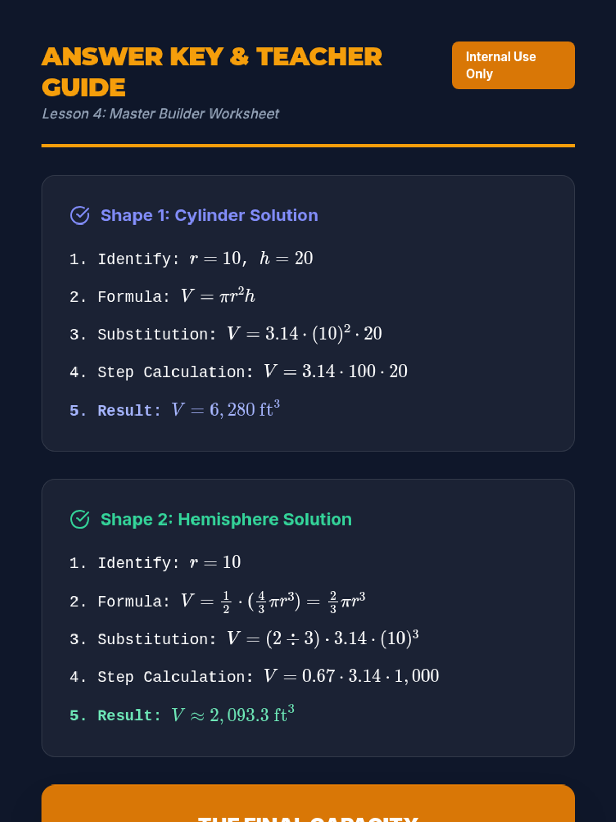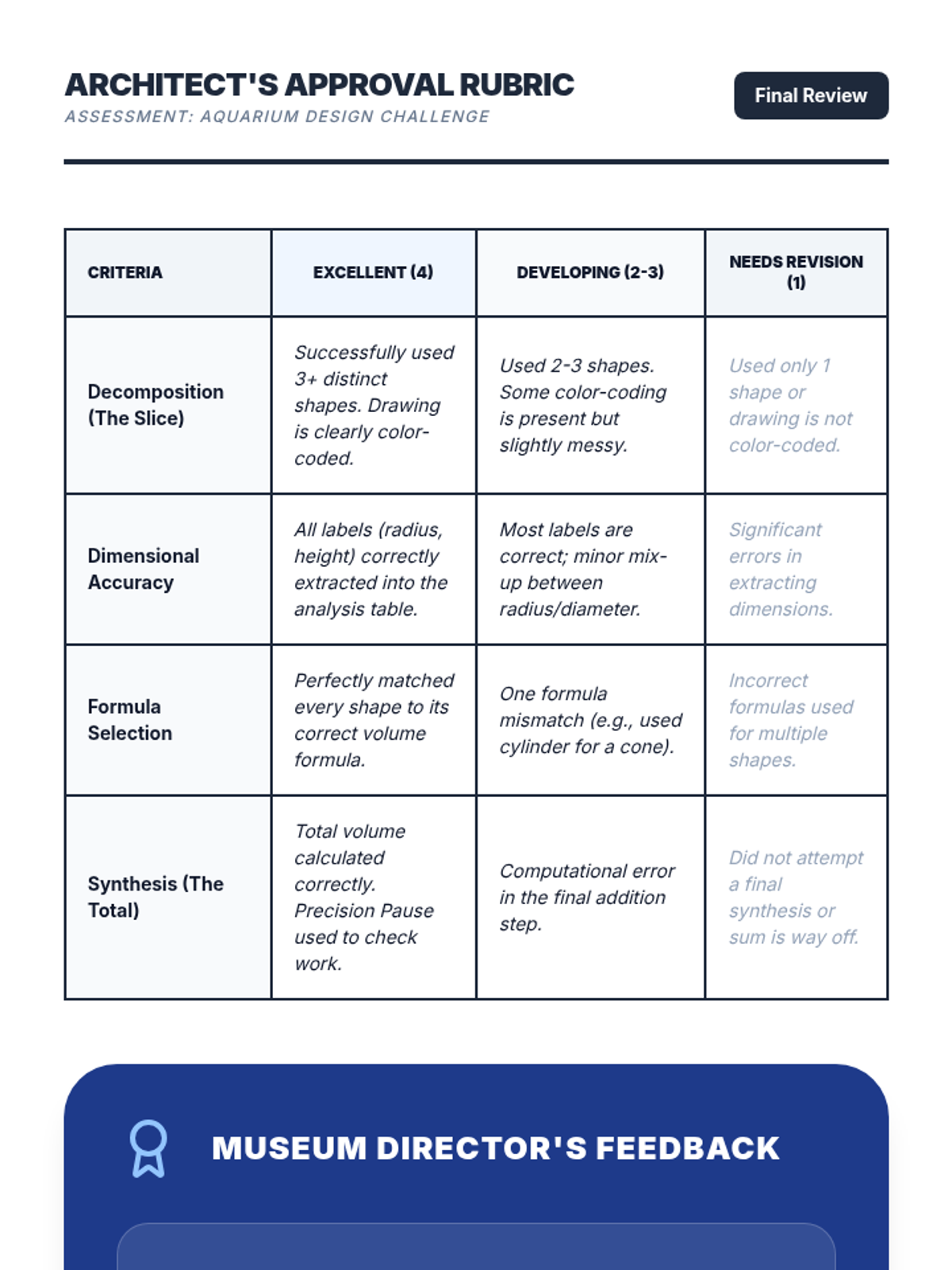 A sequence focused on breaking down complex geometric shapes into manageable parts. Students use color-coding, physical manipulation, and organized calculations to solve 2D area and 3D volume problems, culminating in a design challenge.