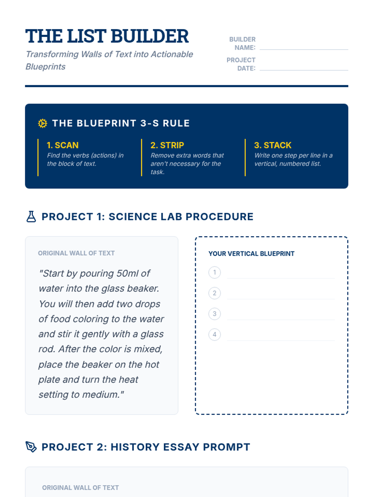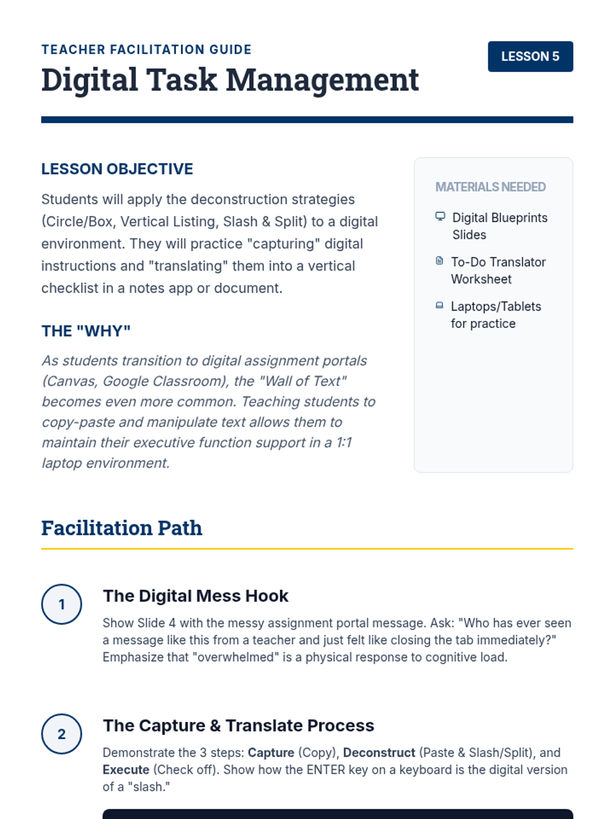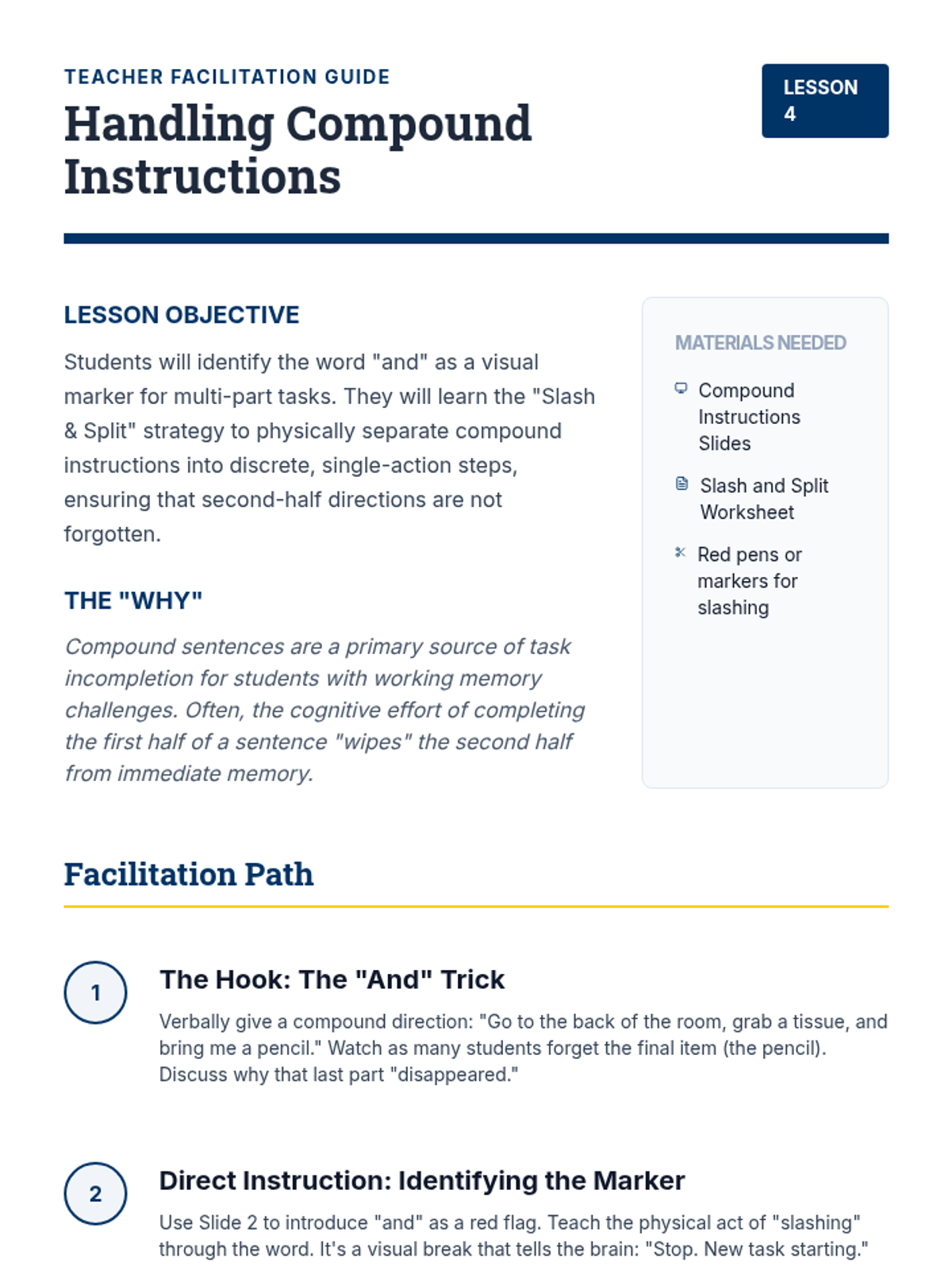 A 5-lesson sequence for 7th-grade students to support working memory by teaching them how to deconstruct complex academic instructions into actionable, single-step checklists. Students learn markup strategies, vertical listing, and compound task decomposition.