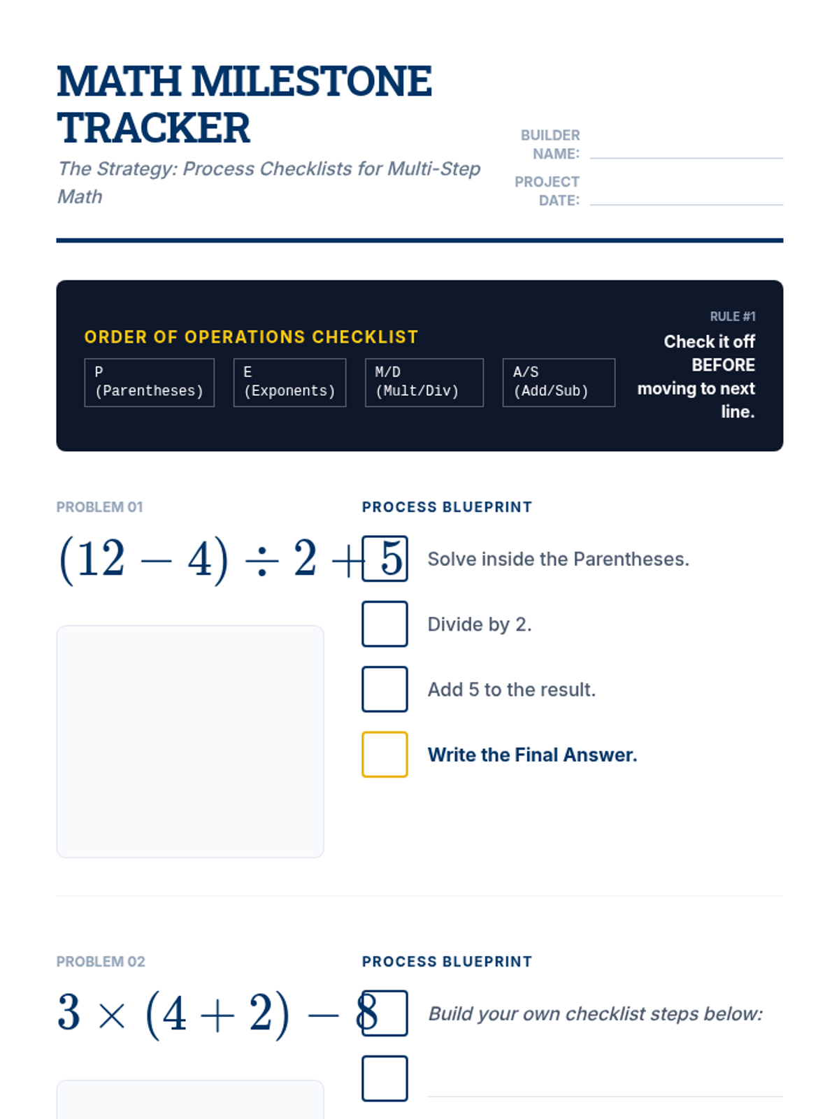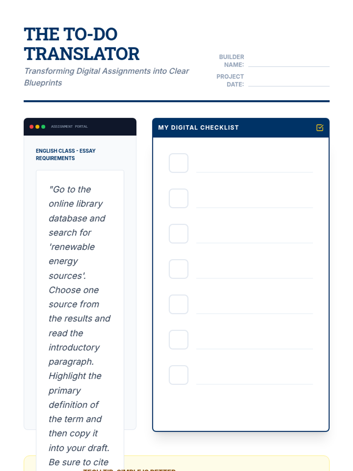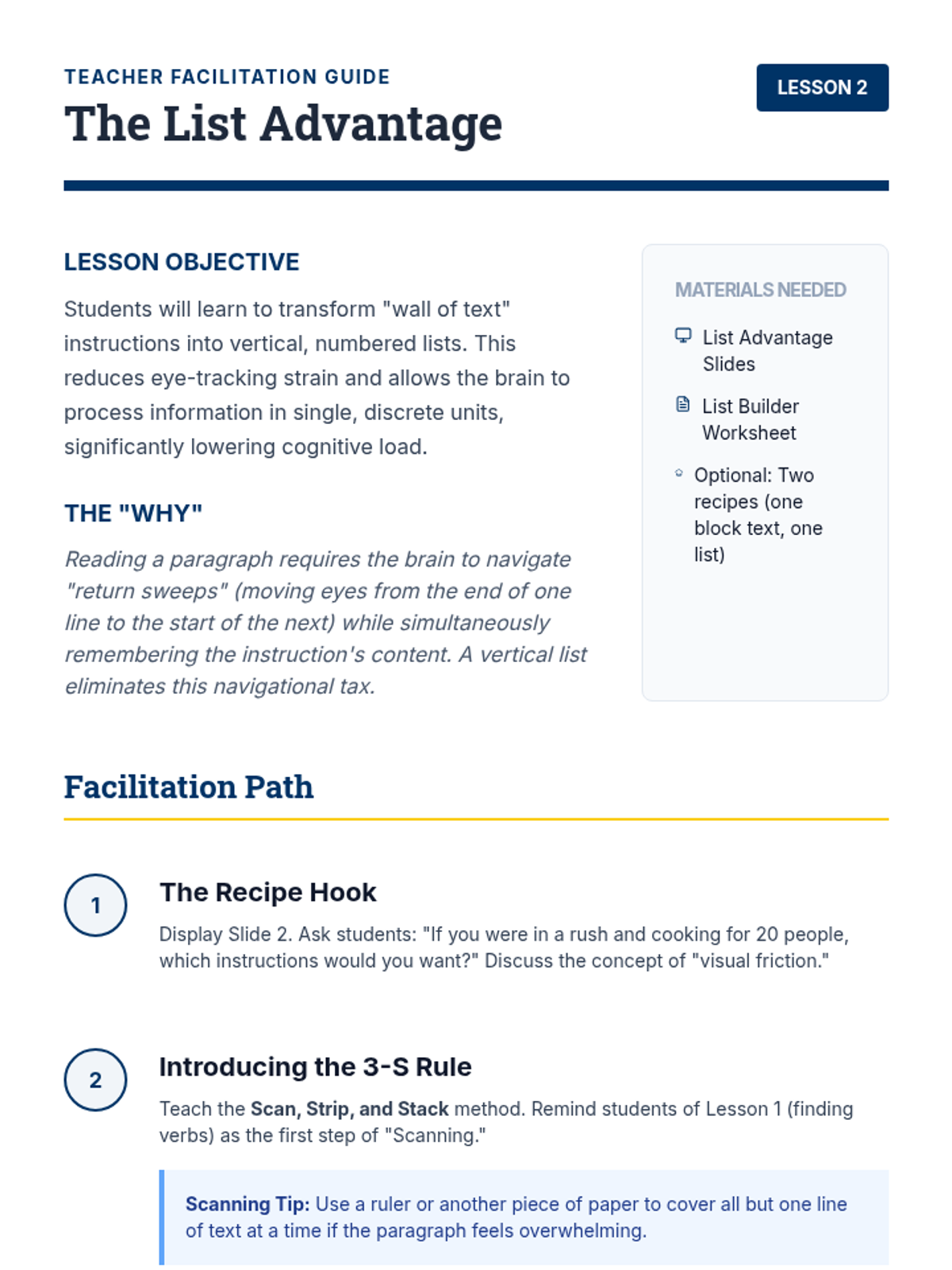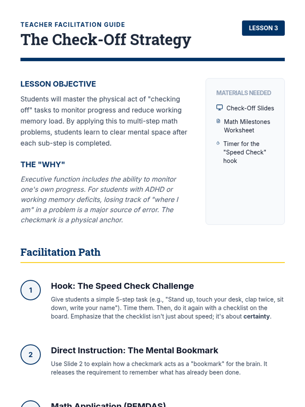 A 5-lesson sequence for 7th-grade students to support working memory by teaching them how to deconstruct complex academic instructions into actionable, single-step checklists. Students learn markup strategies, vertical listing, and compound task decomposition.