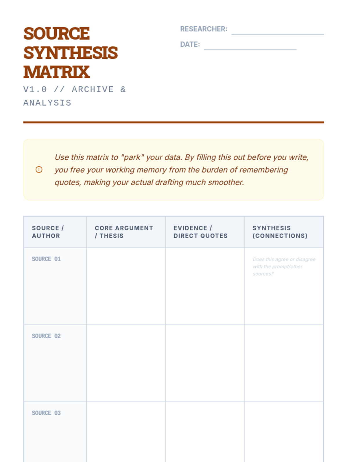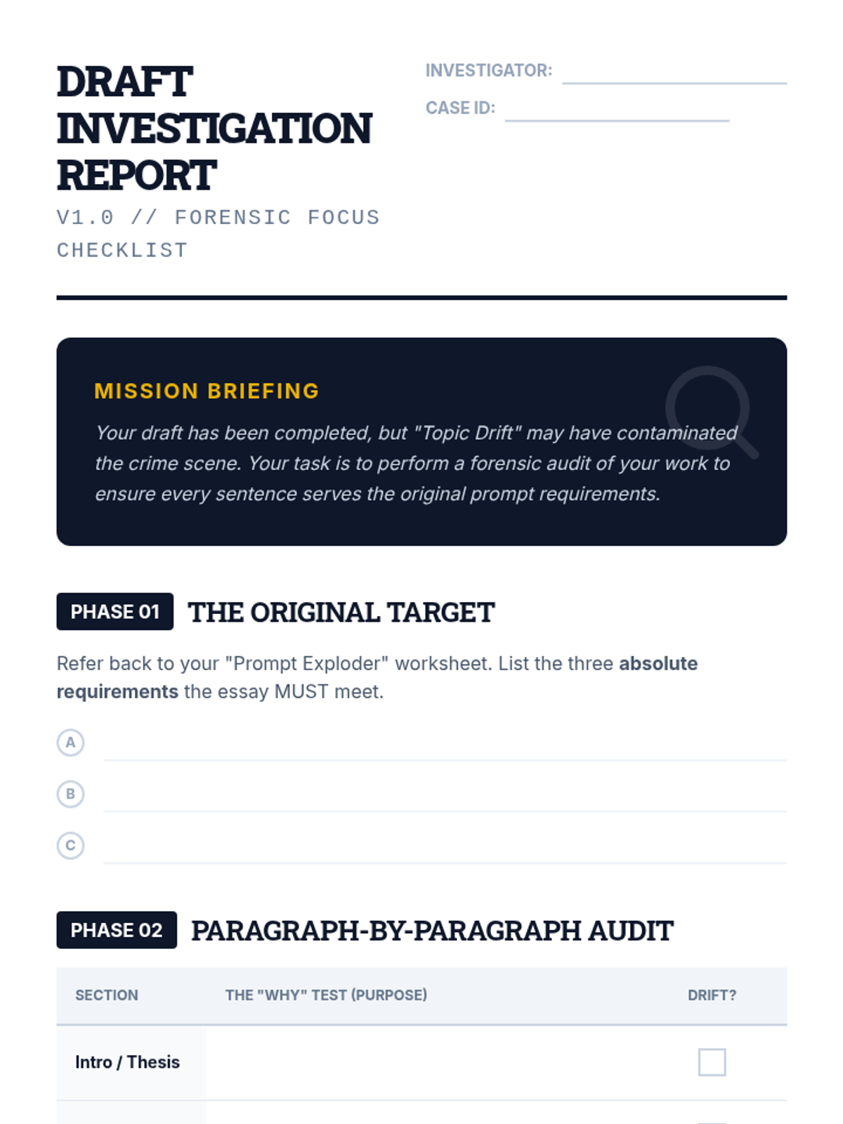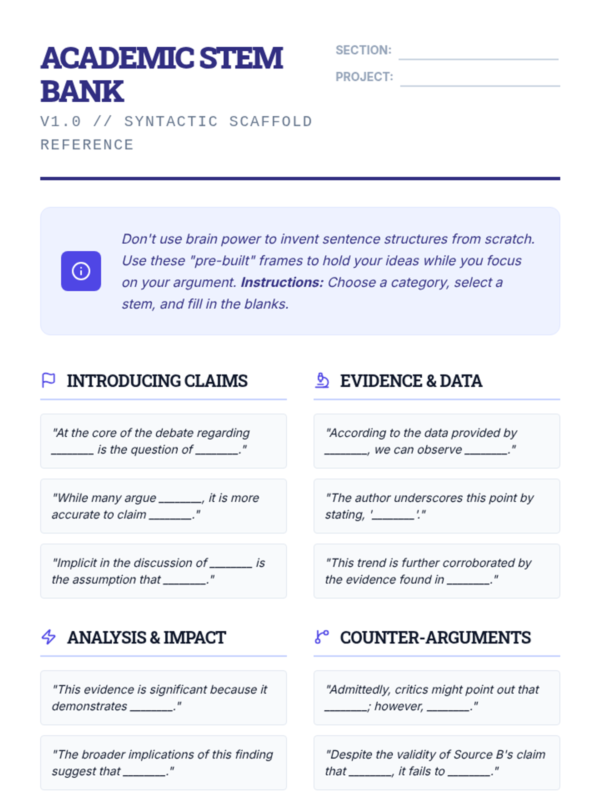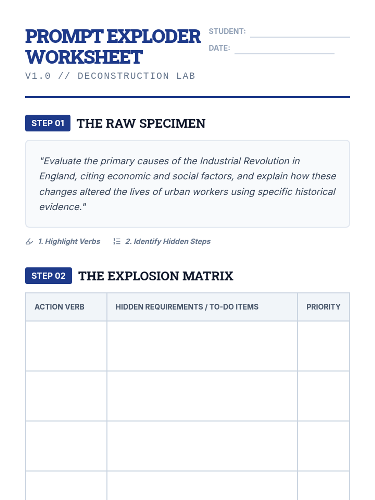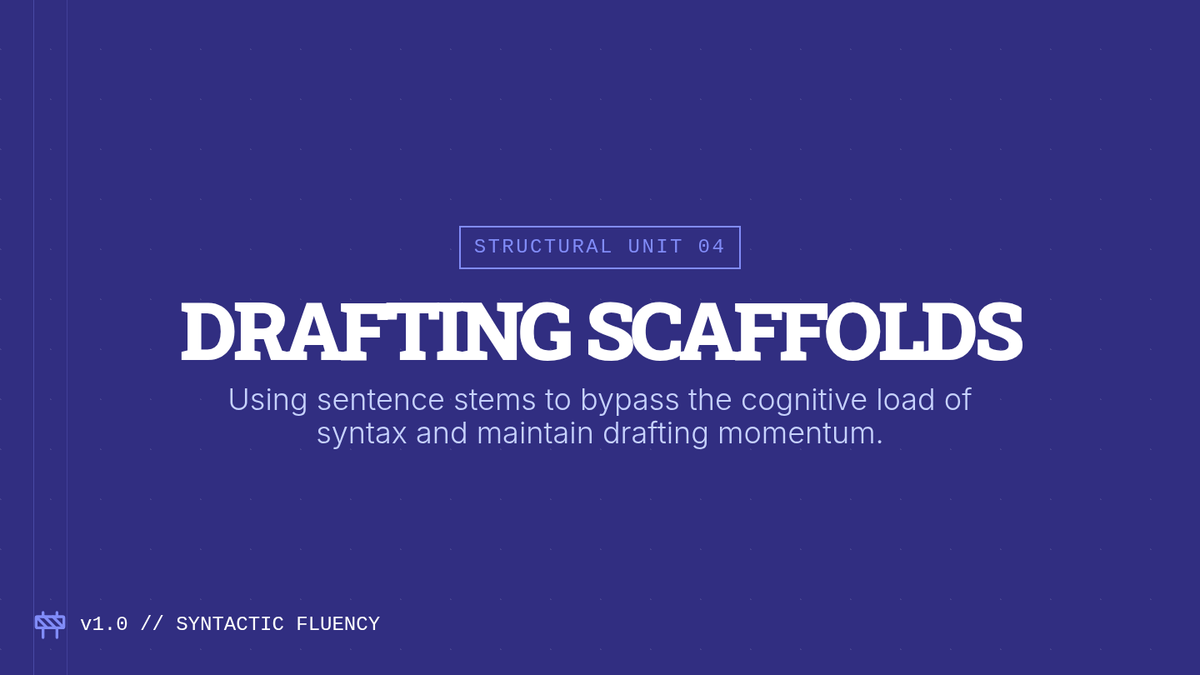 A specialized sequence for 11th-grade students focused on externalizing working memory during complex writing tasks. Through five lessons, students learn to 'explode' prompts, visualize project timelines, use source matrices, leverage sentence stems, and apply self-monitoring checklists to sustain attention and prevent cognitive overload.