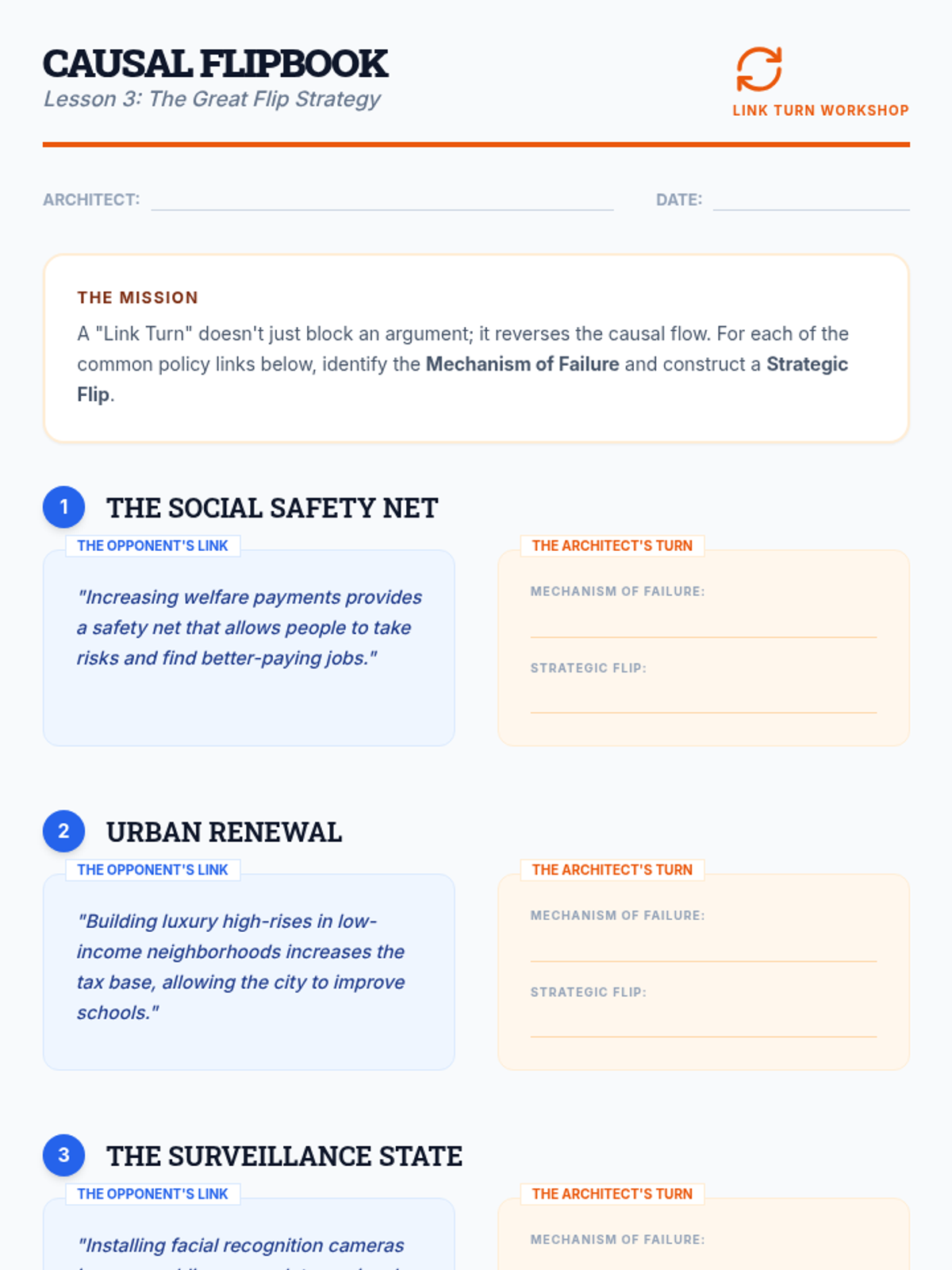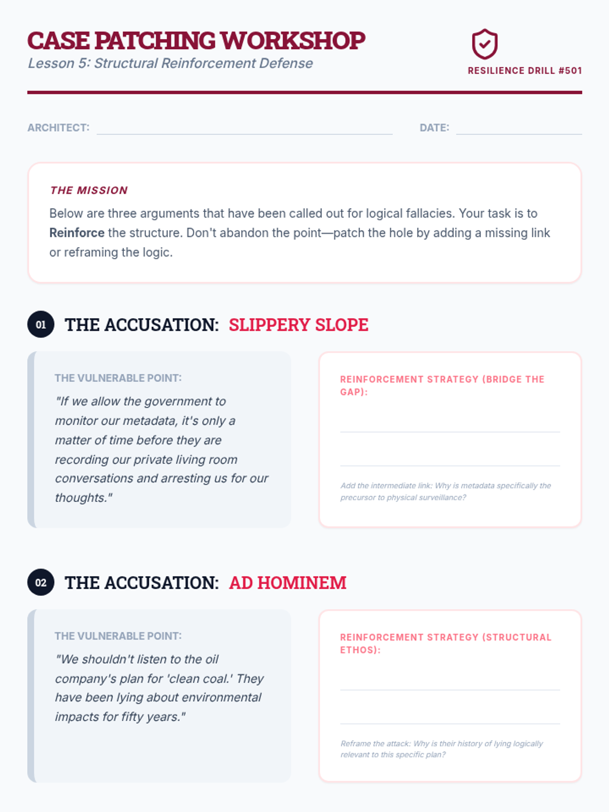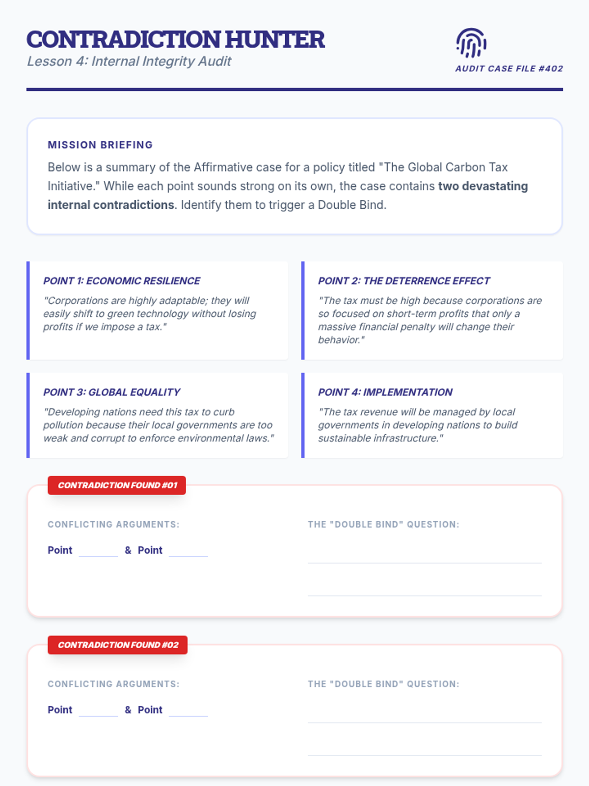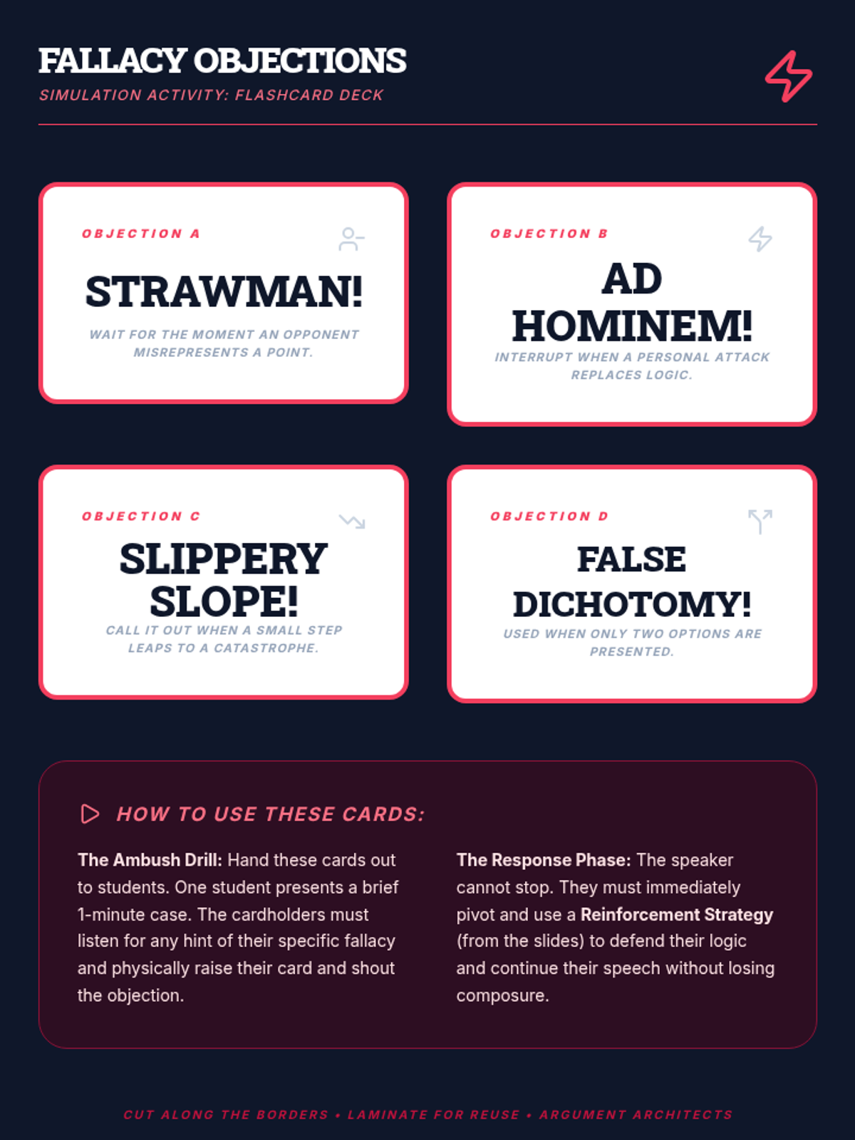 This 12th-grade sequence teaches students to deconstruct and weaponize logical flaws in debate. Moving from basic fallacy identification to complex structural critiques like link turns and internal contradictions, students learn to view arguments as architectural structures that can be dismantled through rigorous logic and strategic engagement.