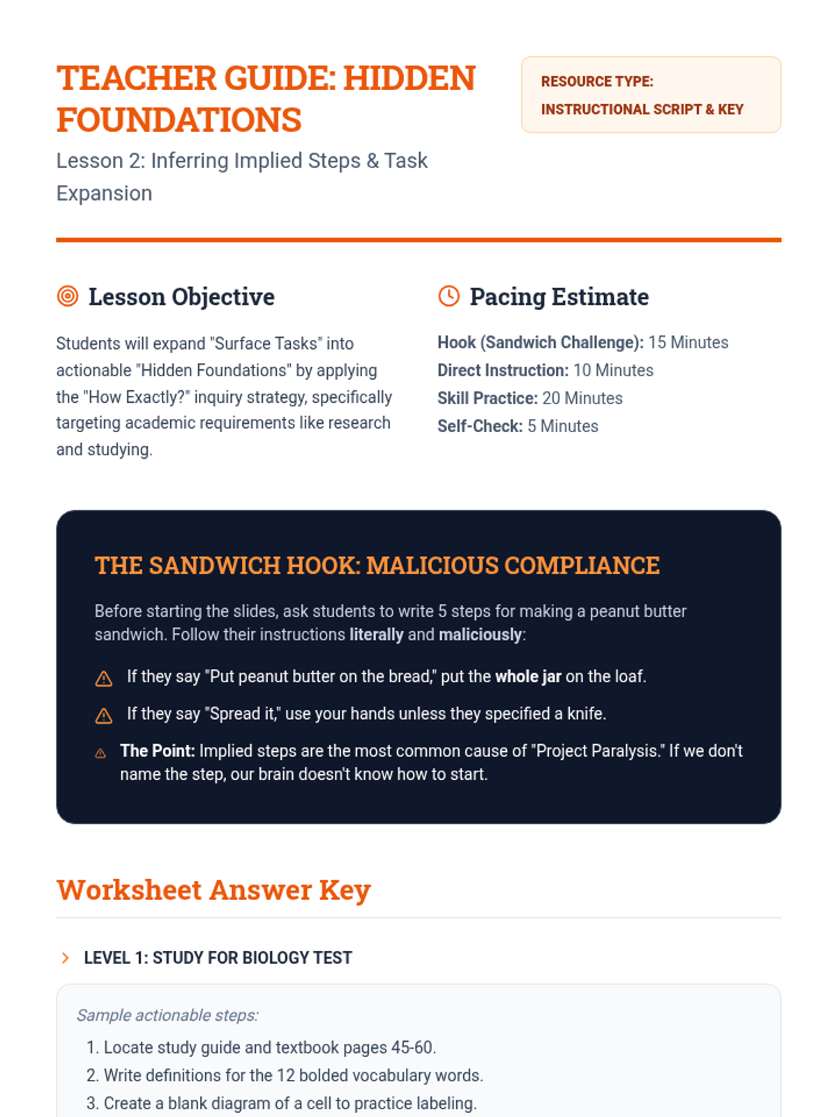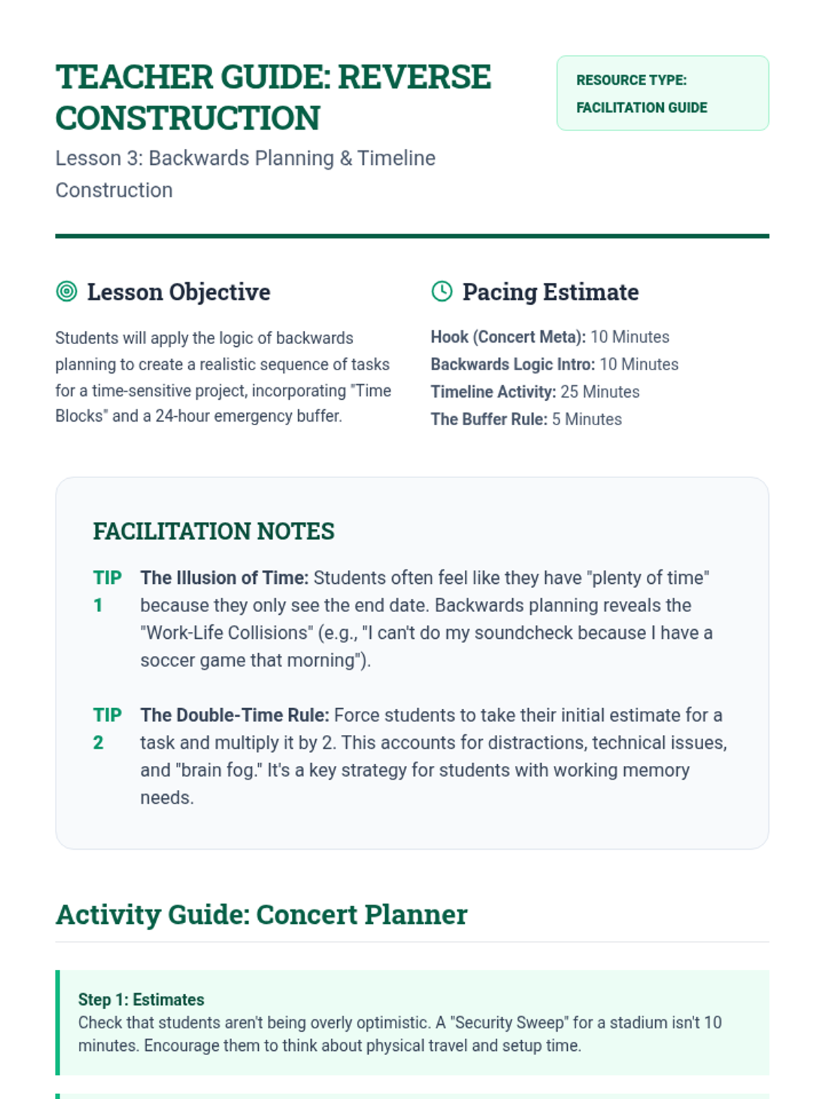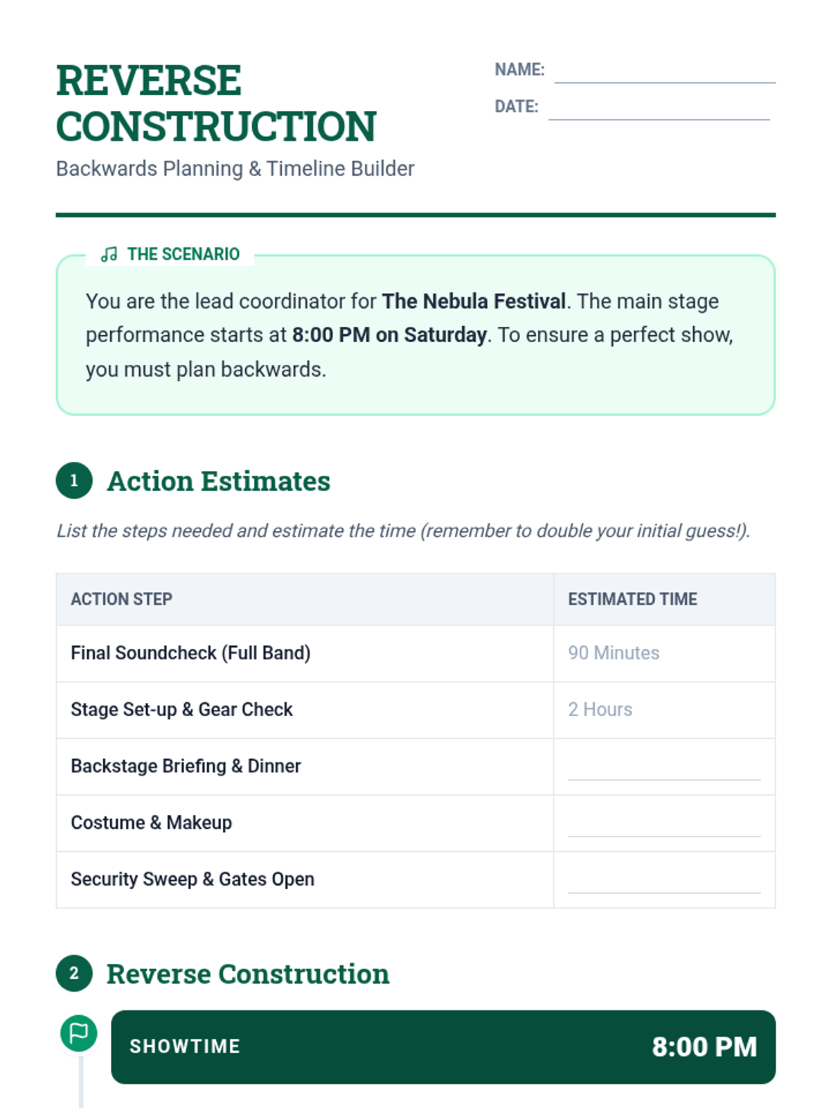 This sequence teaches students to deconstruct complex academic assignments by identifying hidden requirements, expanding tasks into manageable actions, and using backwards planning to create realistic timelines for completion.