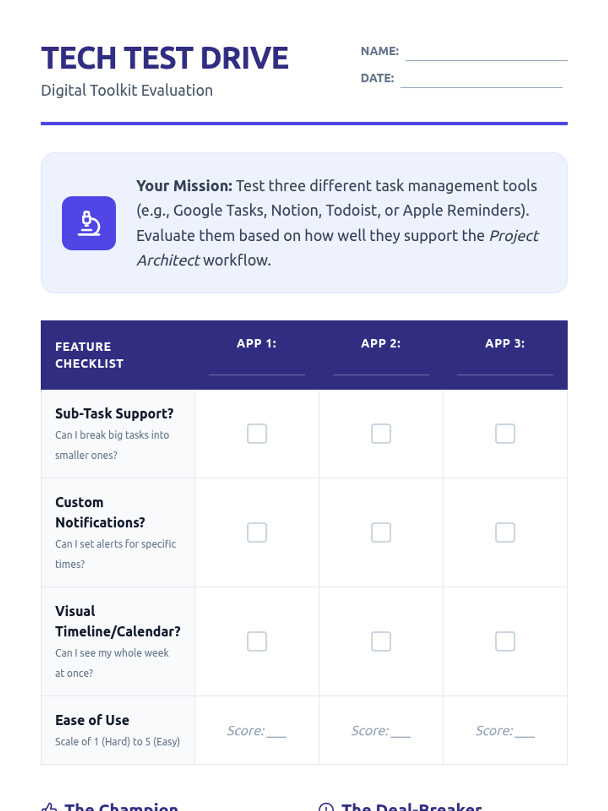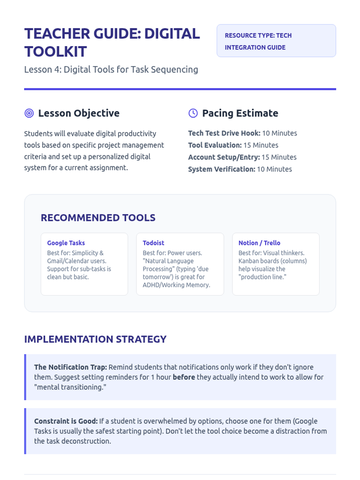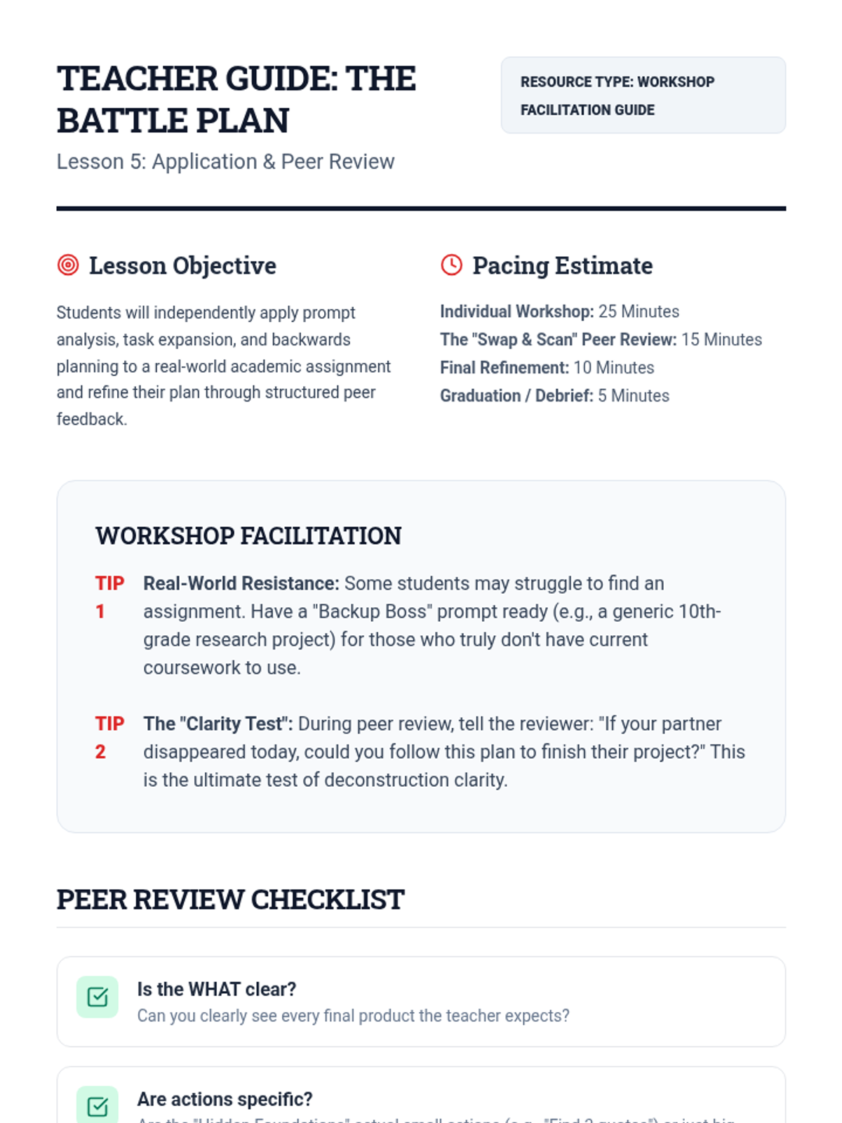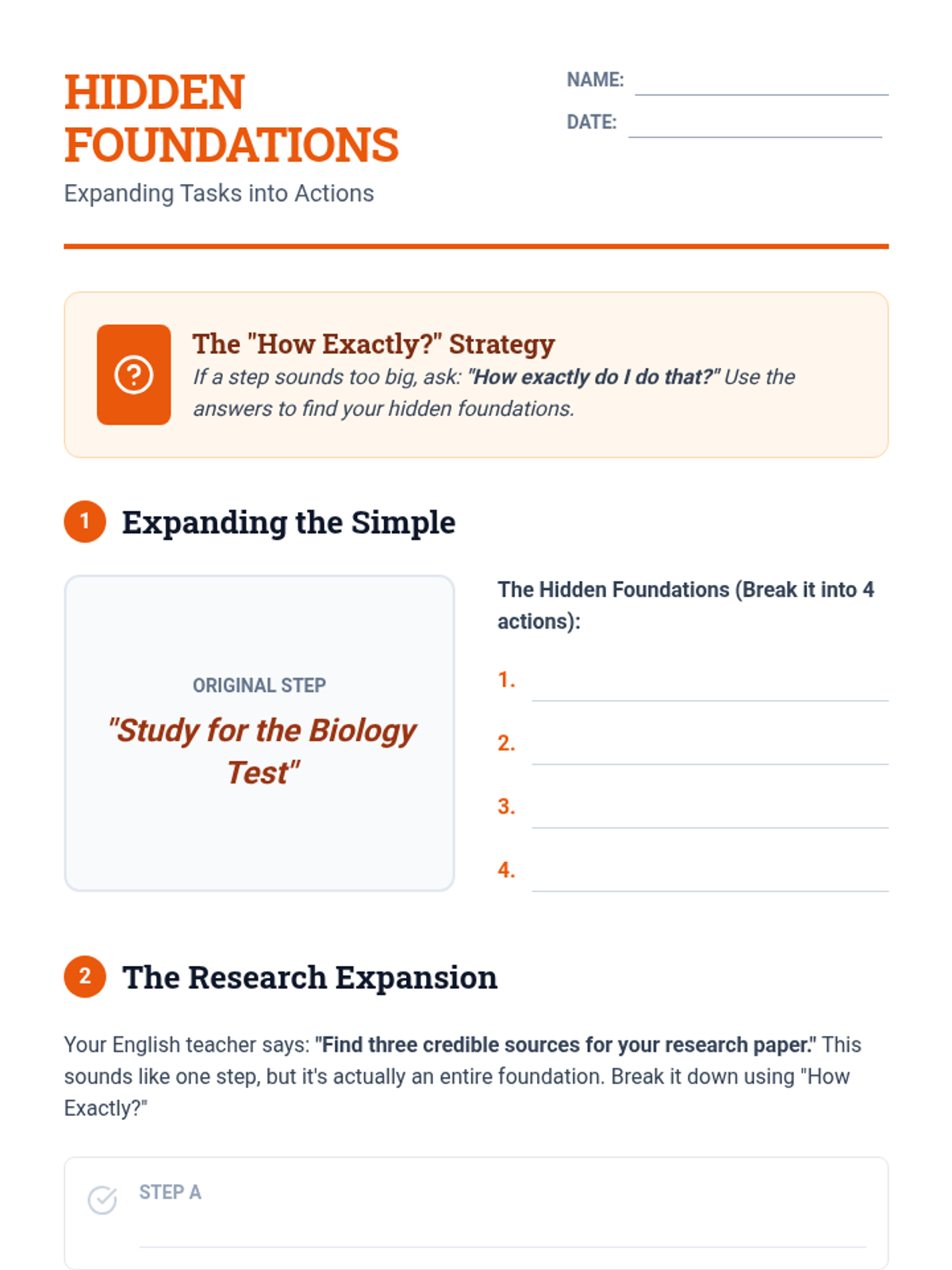 This sequence teaches students to deconstruct complex academic assignments by identifying hidden requirements, expanding tasks into manageable actions, and using backwards planning to create realistic timelines for completion.