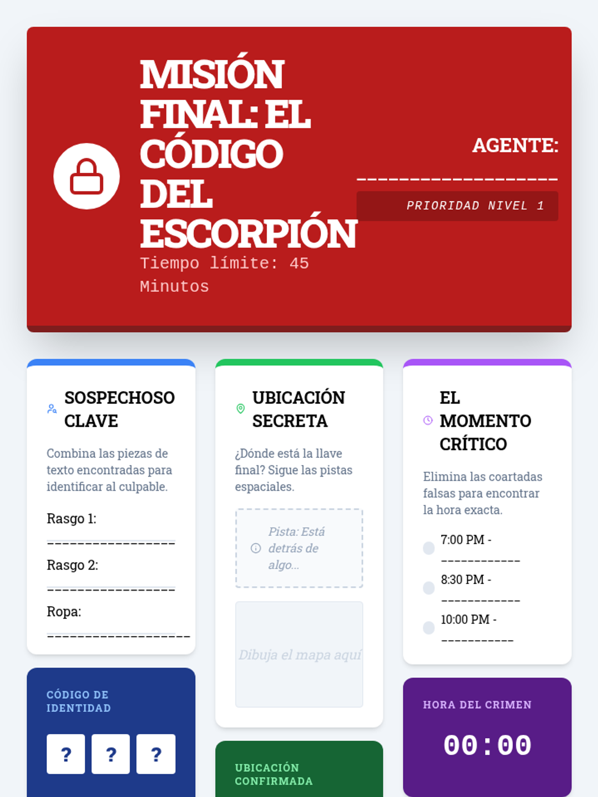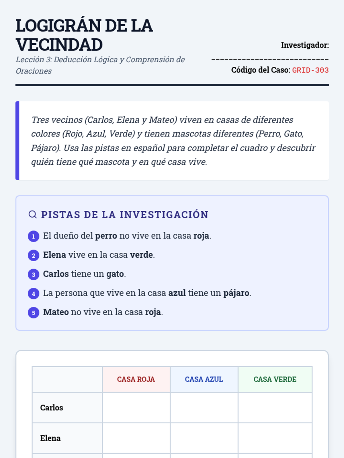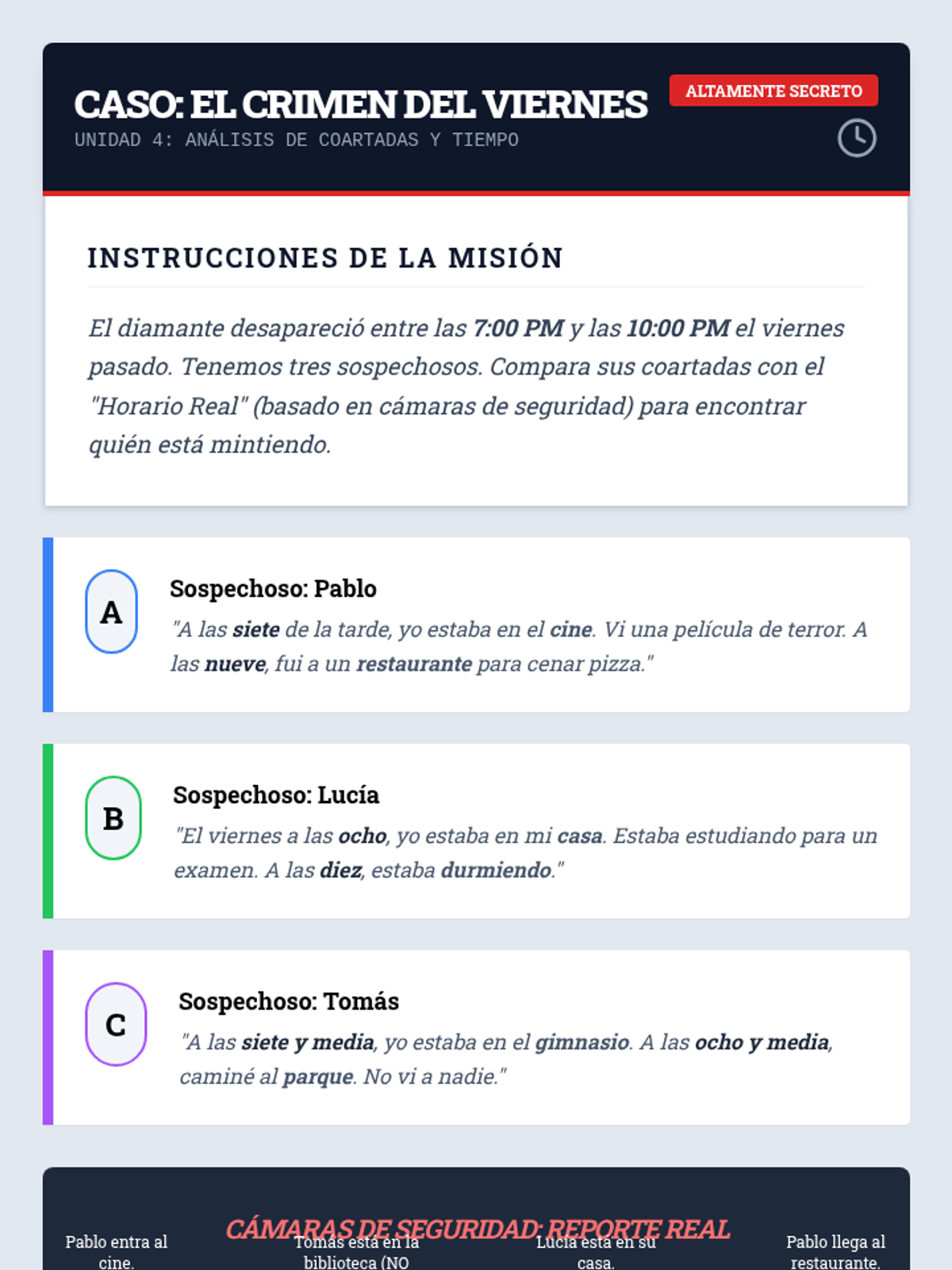 A Spanish reading sequence where students act as detectives, using physical descriptions, prepositions of place, and temporal logic to solve mysteries and puzzles.