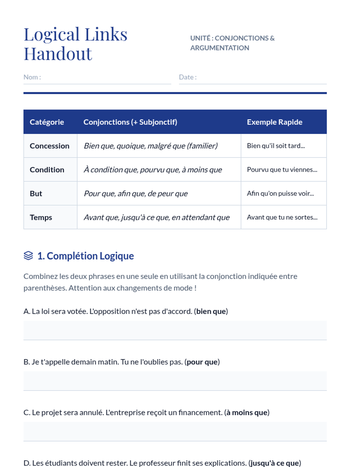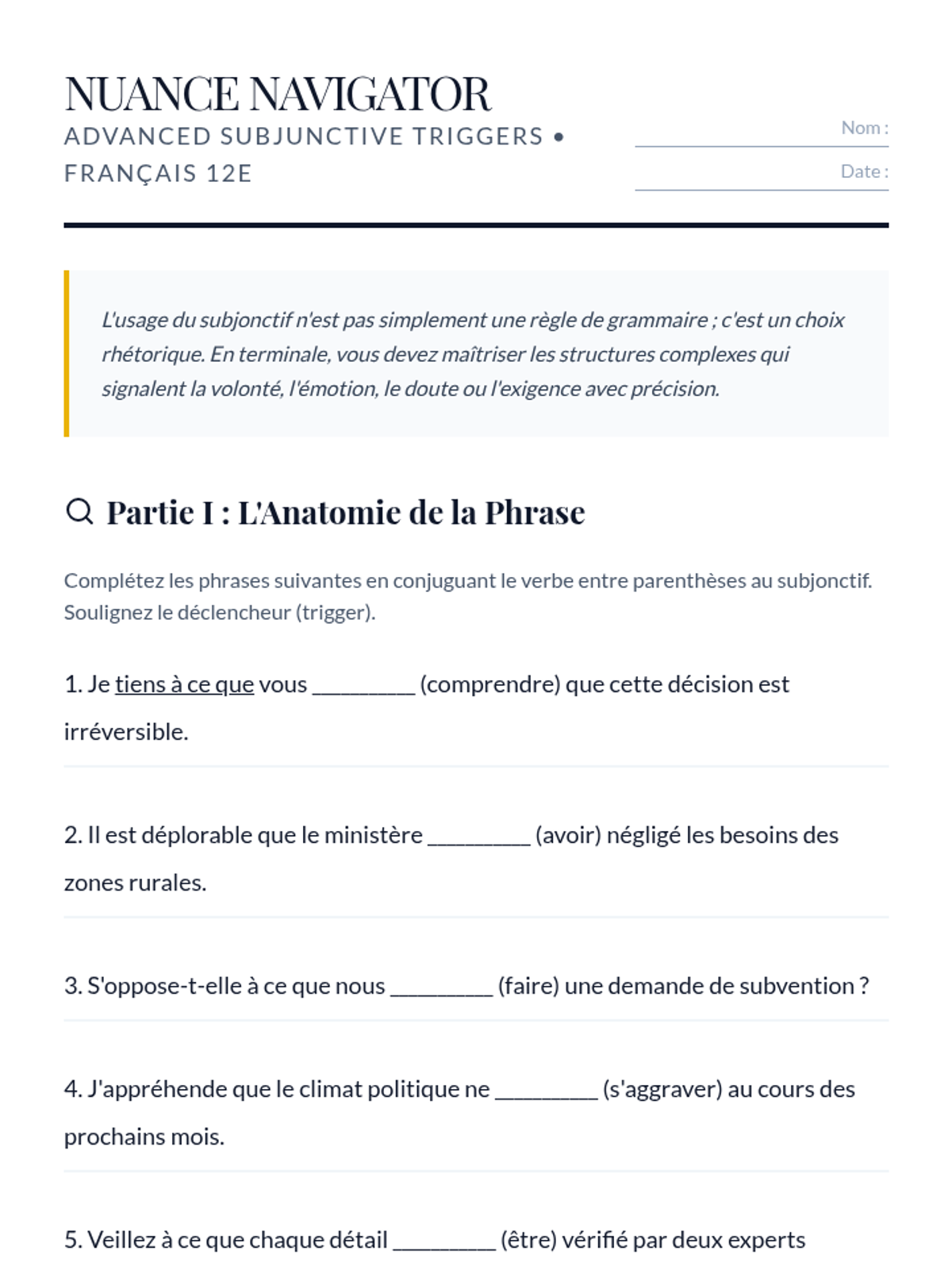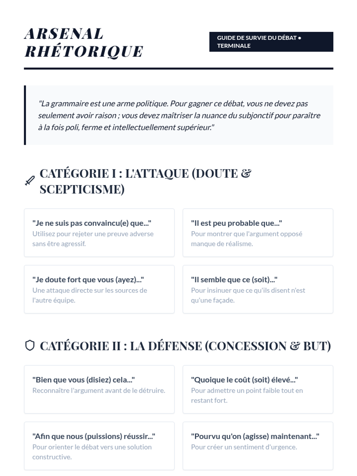 A high-level French grammar sequence for 12th-grade students focusing on the rhetorical and argumentative use of the subjunctive mood. Students move from reviewing advanced triggers to using the subjunctive to express doubt, concession, and hypothesis in professional and debate contexts.