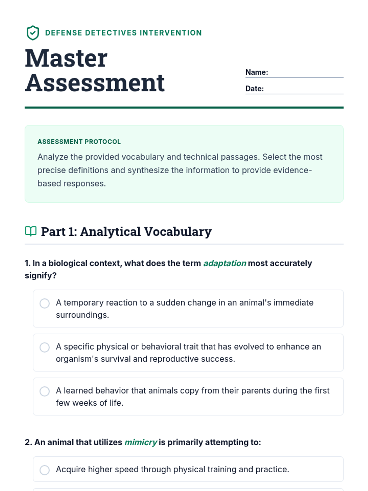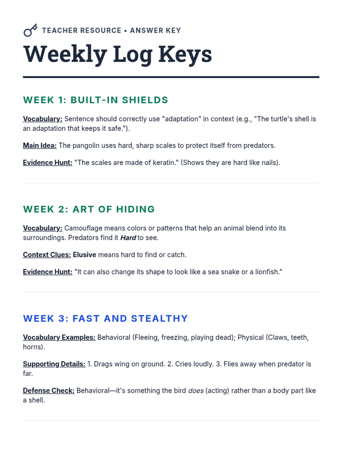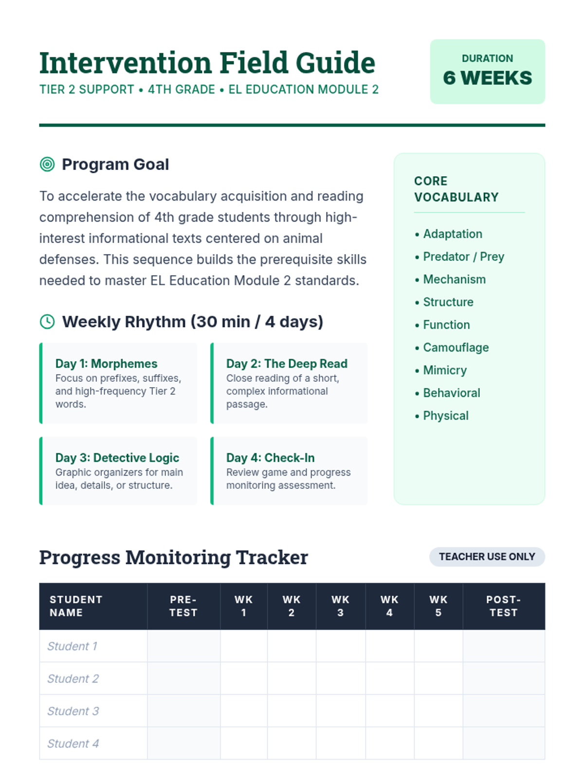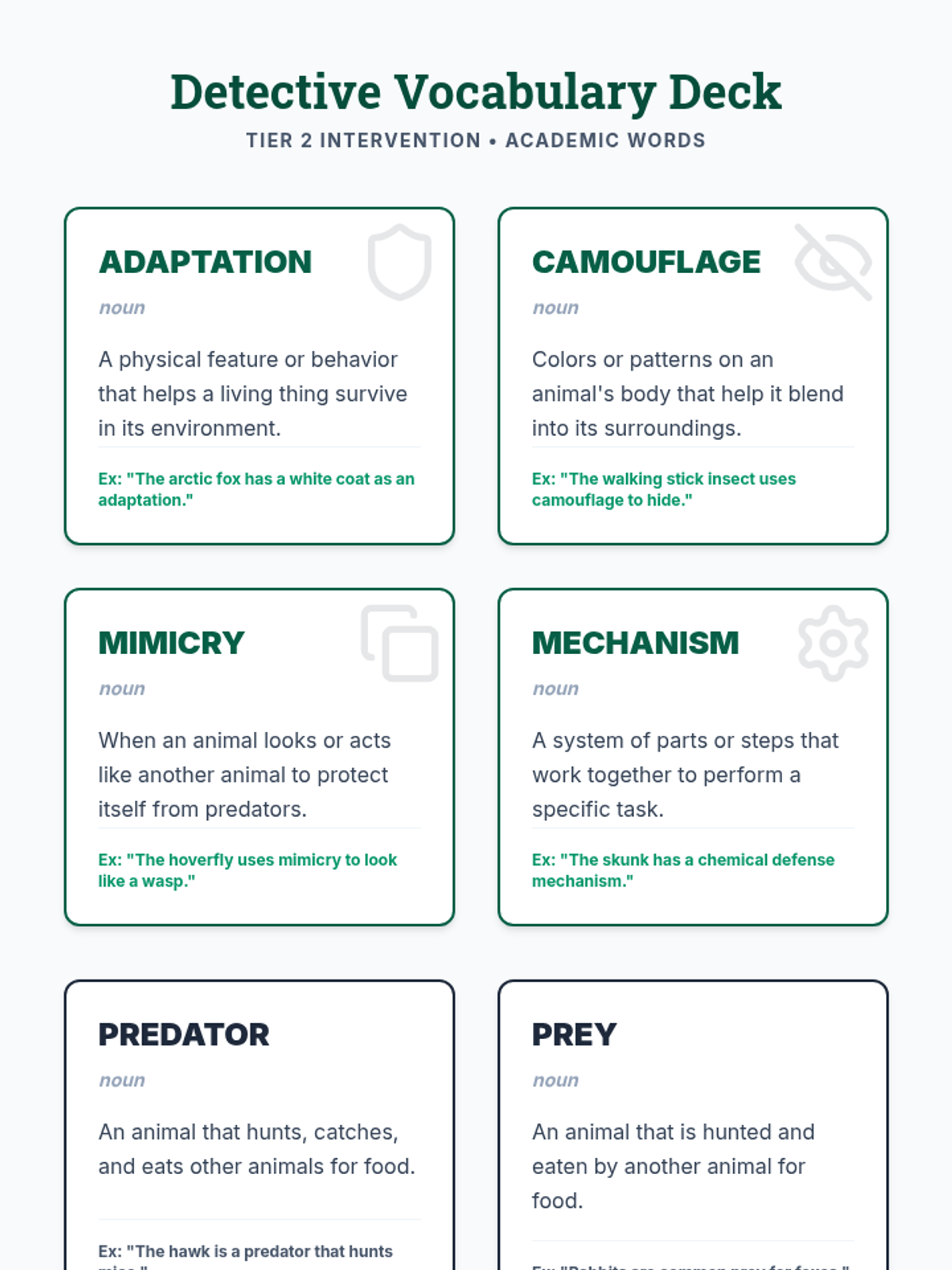 A 6-week Tier 2 intervention for 4th grade students focused on vocabulary and comprehension, aligned with EL Education Module 2 (Animal Defenses). Students act as 'Defense Detectives' to explore how animals survive in the wild while building academic language skills.