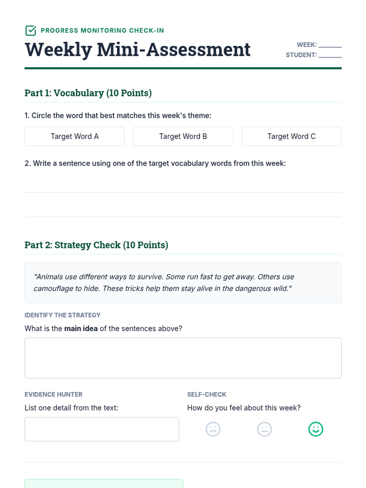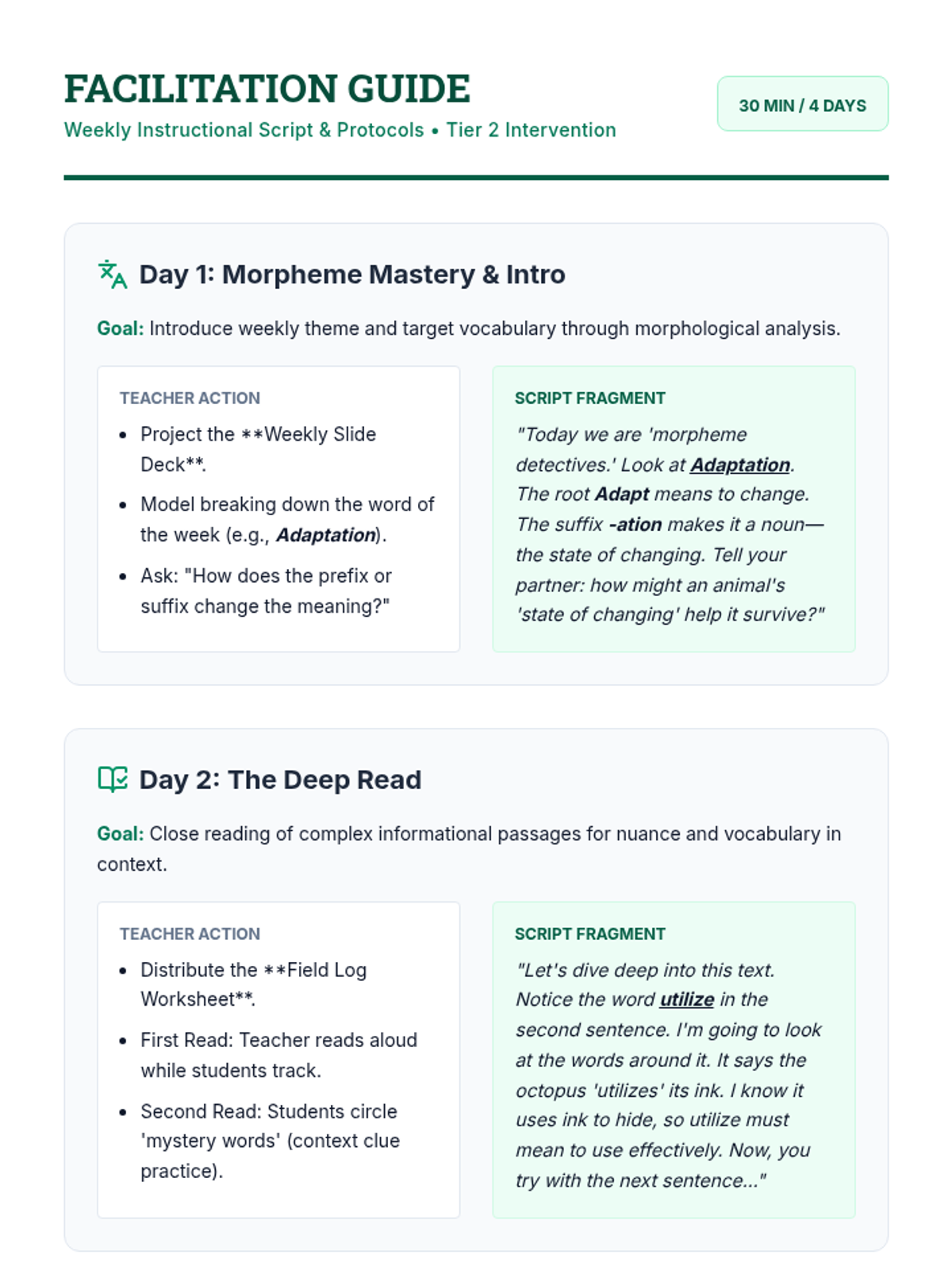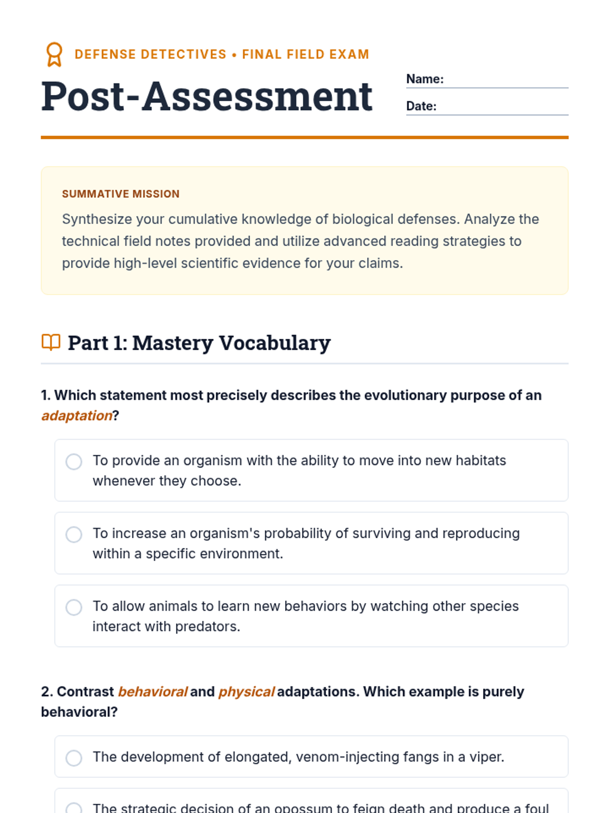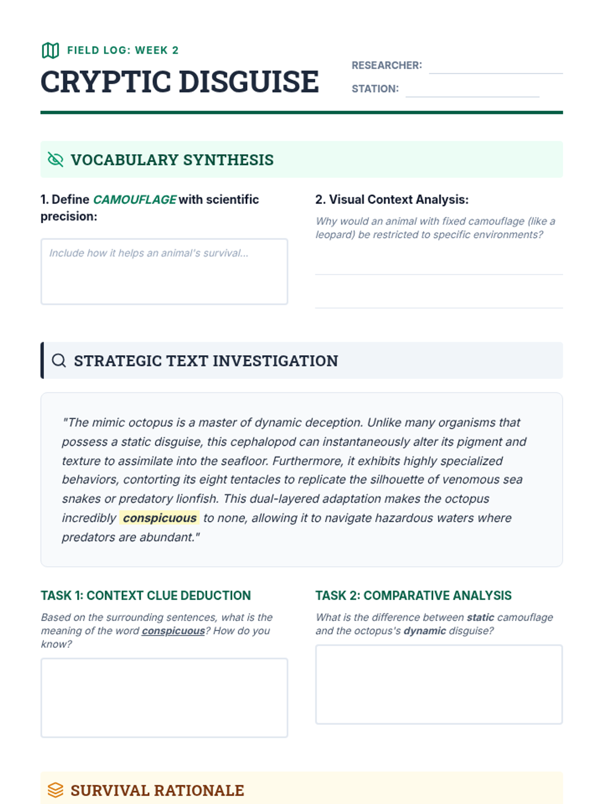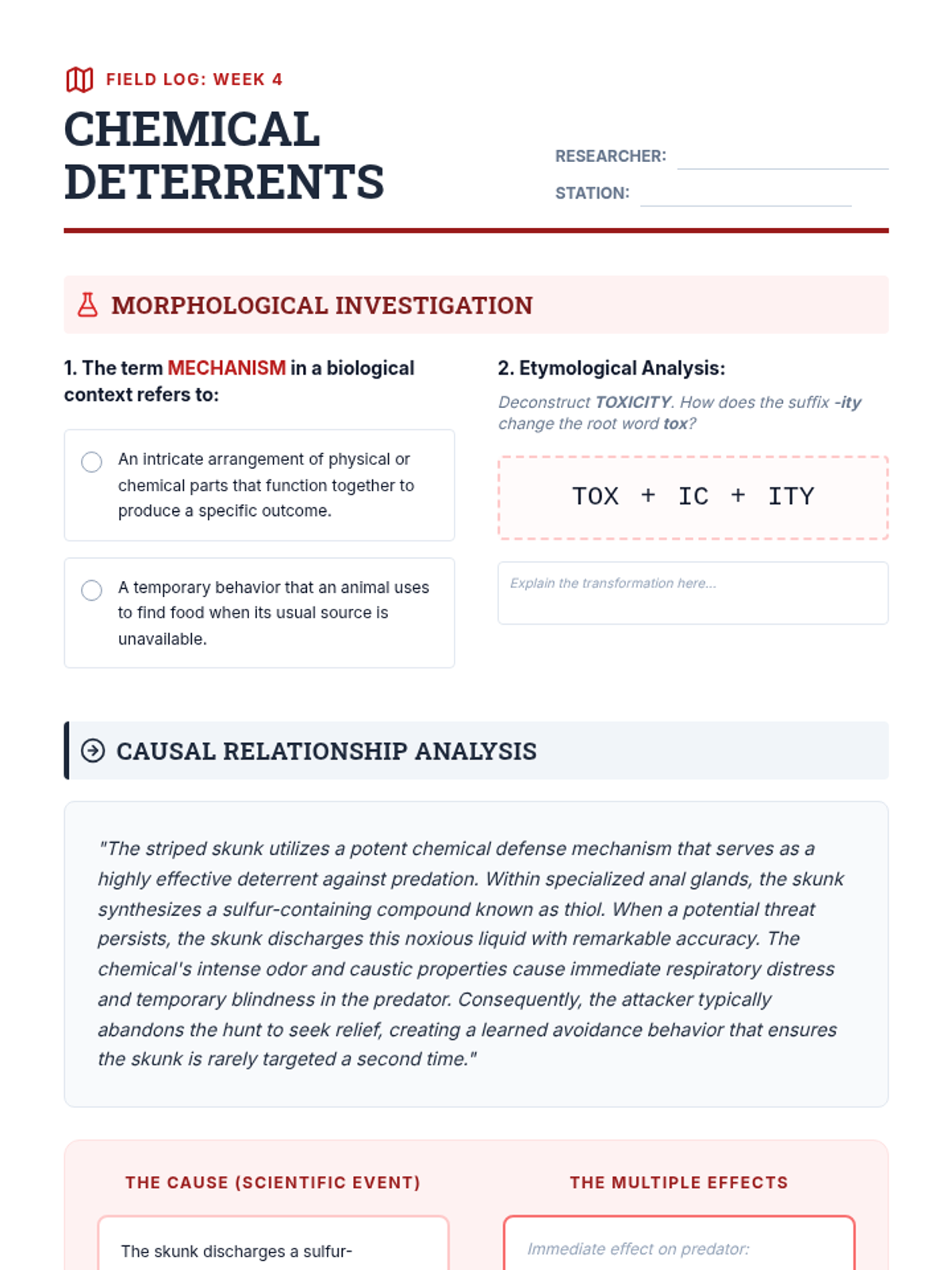 A 6-week Tier 2 intervention for 4th grade students focused on vocabulary and comprehension, aligned with EL Education Module 2 (Animal Defenses). Students act as 'Defense Detectives' to explore how animals survive in the wild while building academic language skills.