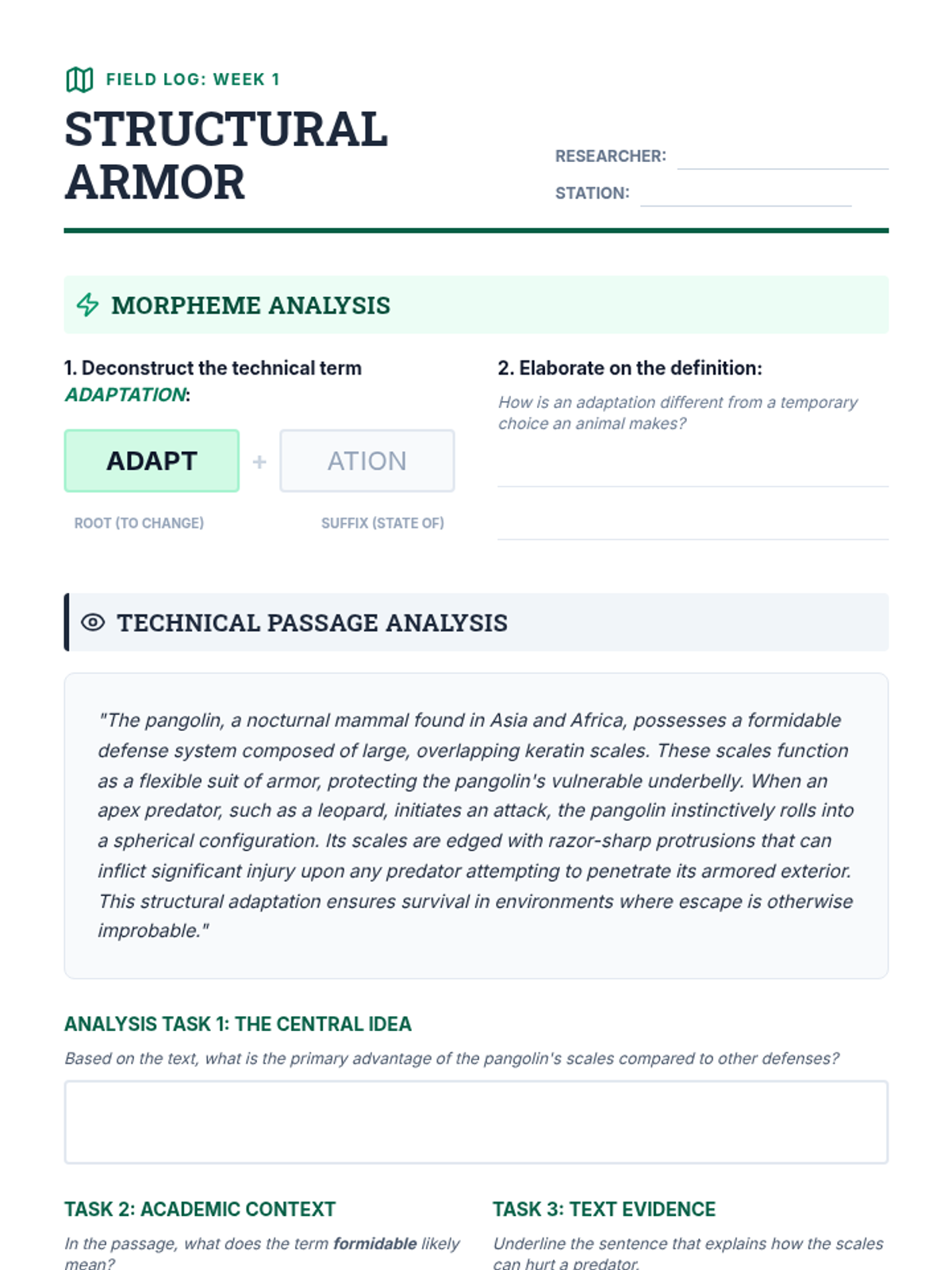 A 6-week Tier 2 intervention for 4th grade students focused on vocabulary and comprehension, aligned with EL Education Module 2 (Animal Defenses). Students act as 'Defense Detectives' to explore how animals survive in the wild while building academic language skills.