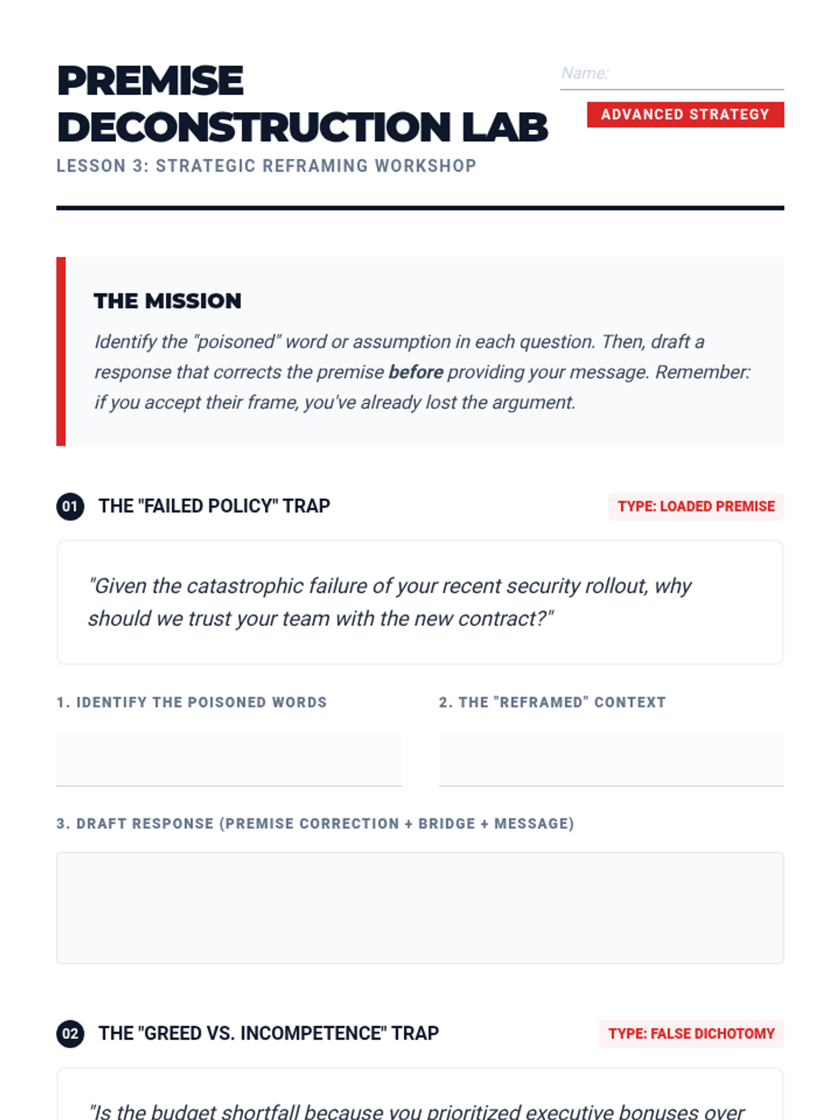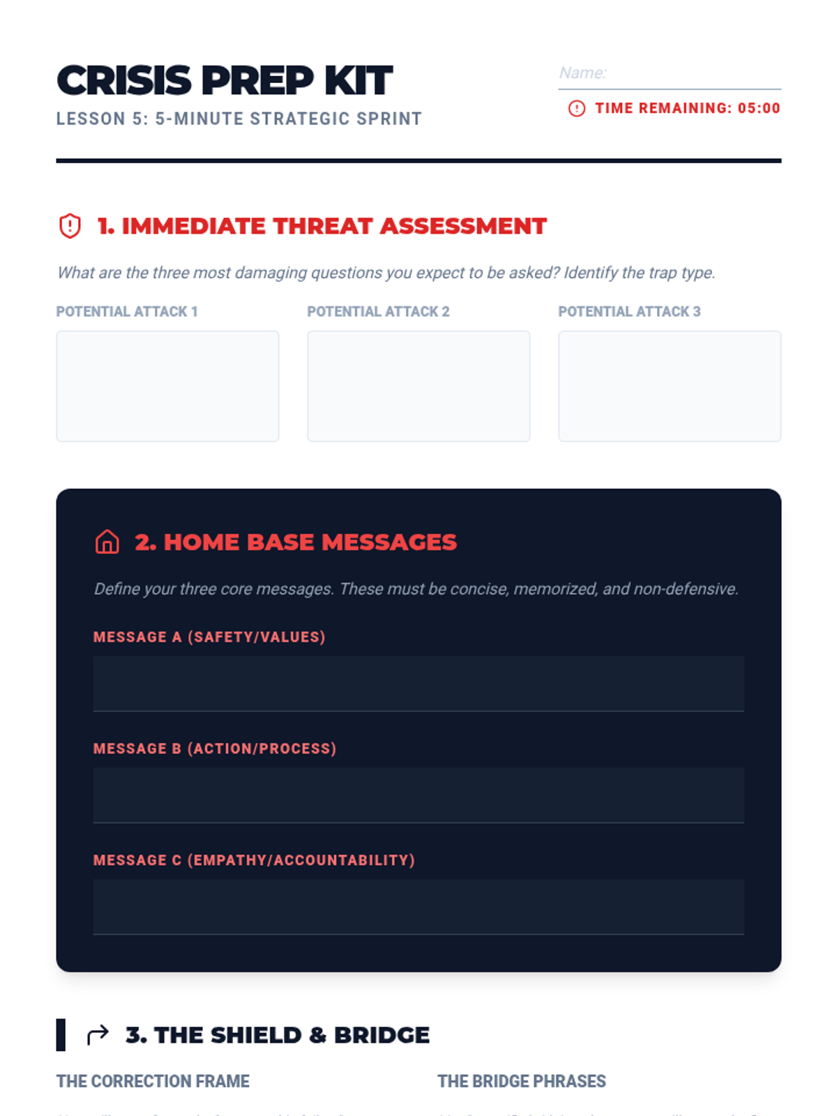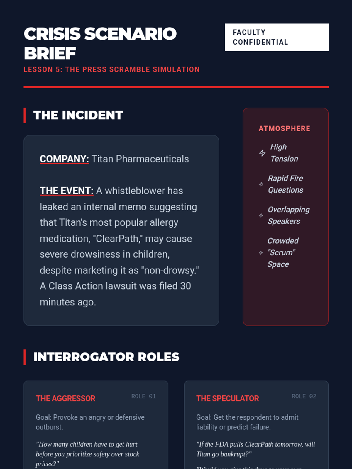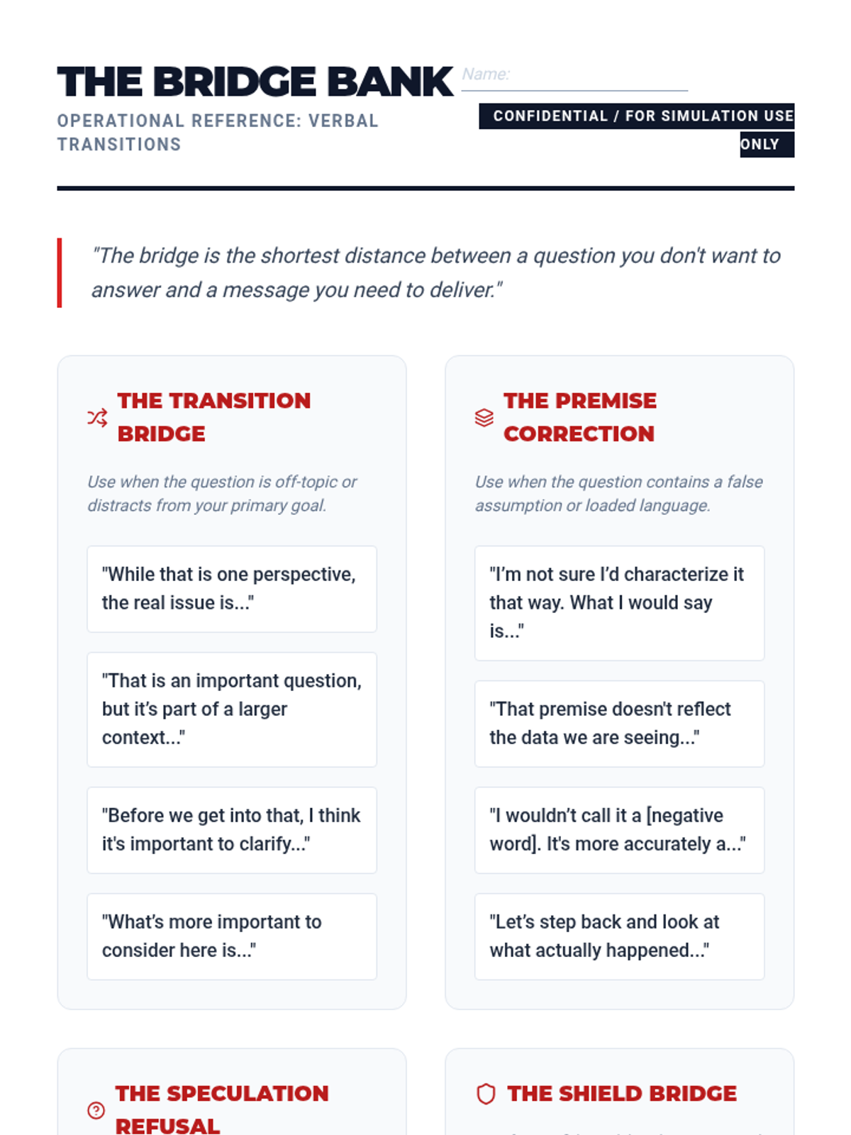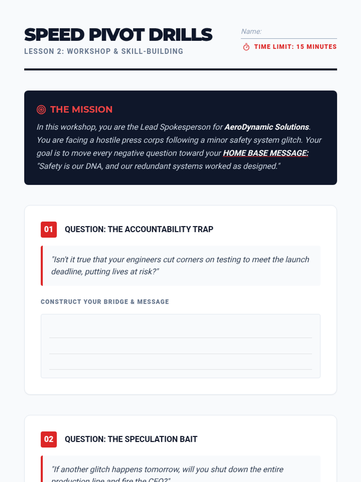 A graduate-level sequence focused on defensive communication strategies, pivoting, and maintaining message integrity during hostile questioning and high-pressure media environments.