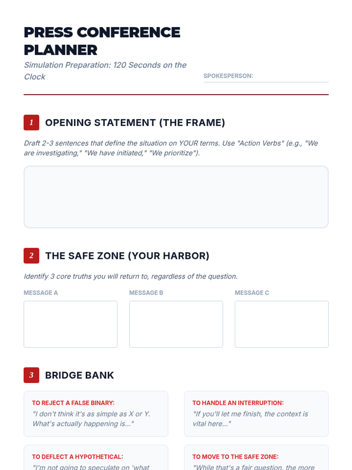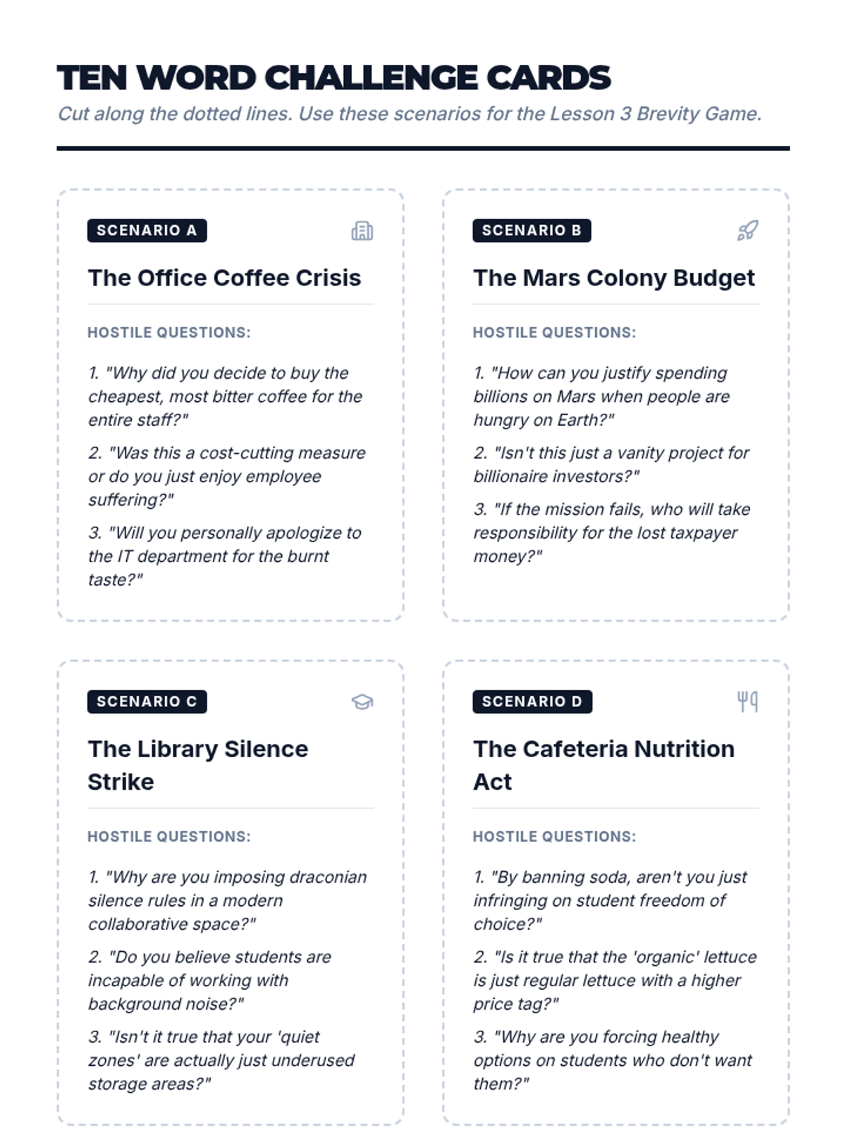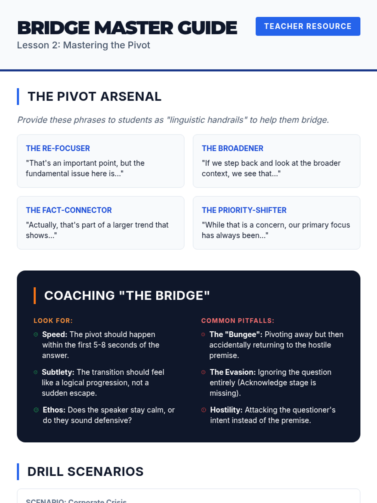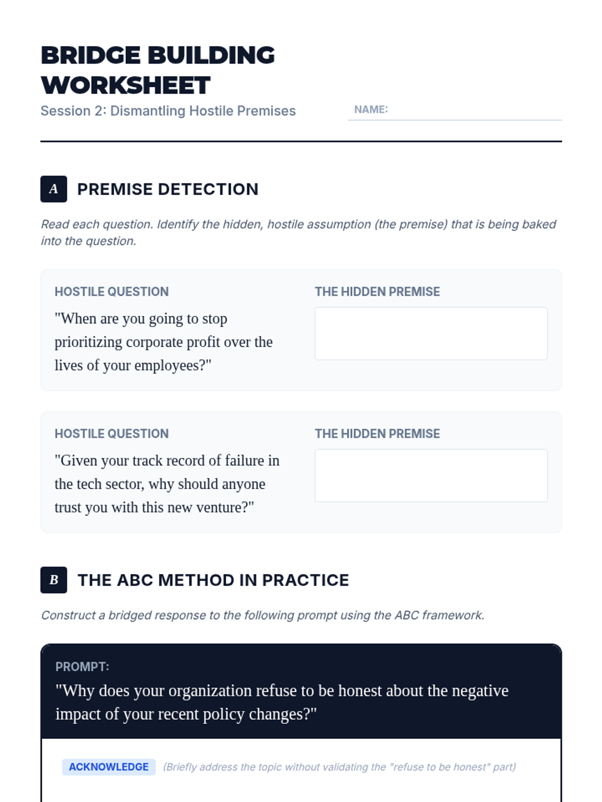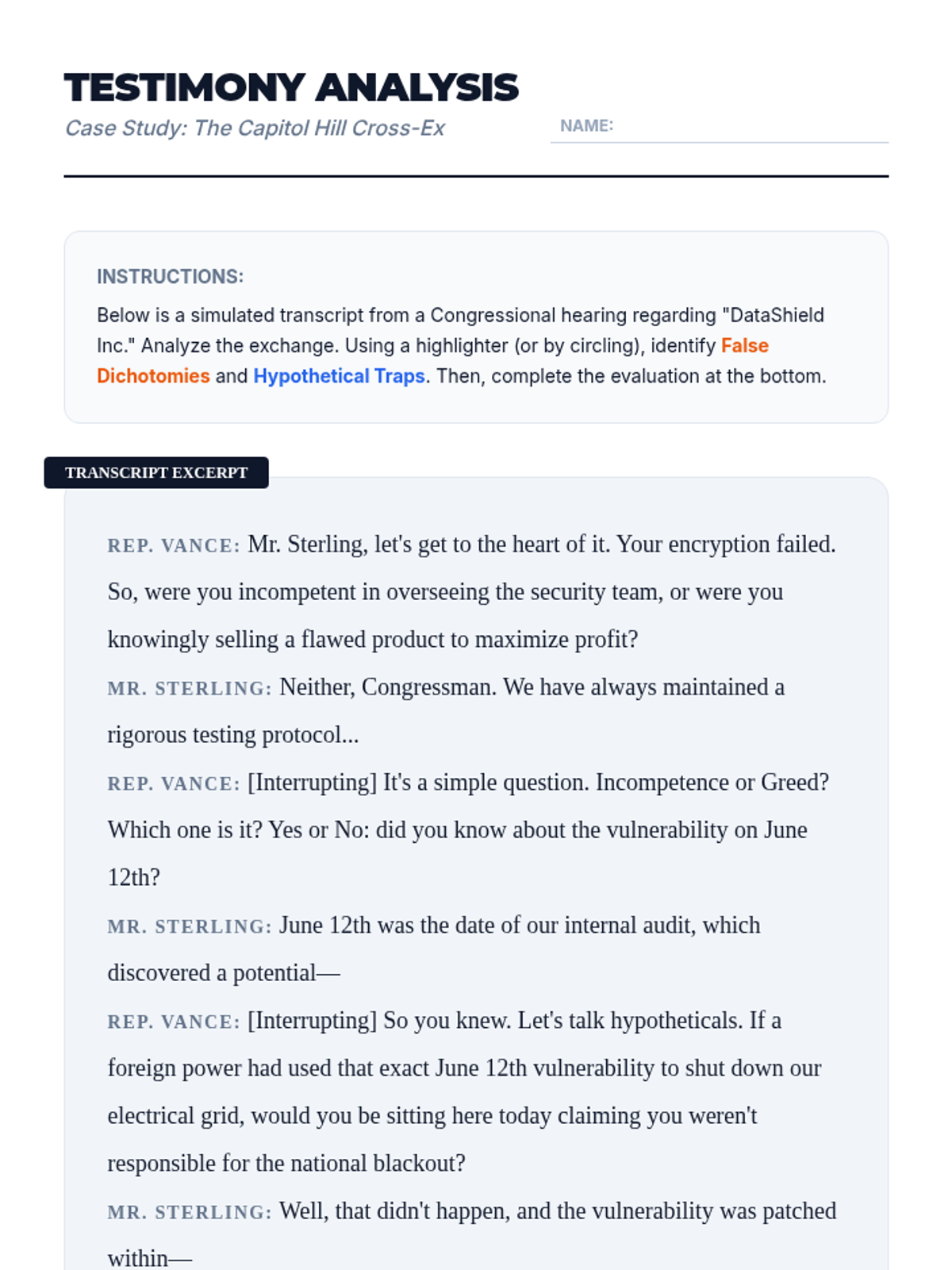 This sequence focuses on maintaining ethos and composure under aggressive cross-examination. Students learn techniques to pivot, reframe, and bridge away from hostile premises, progressing from physiological self-regulation to high-intensity crisis management simulations.