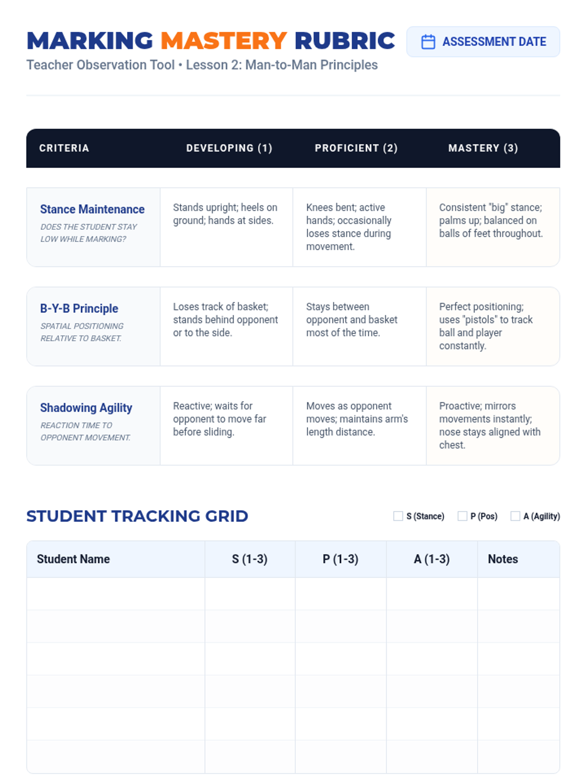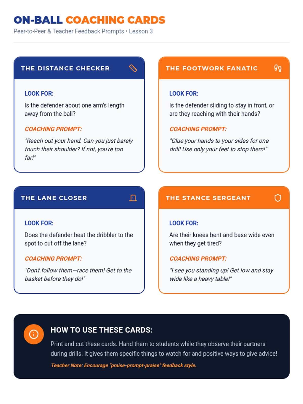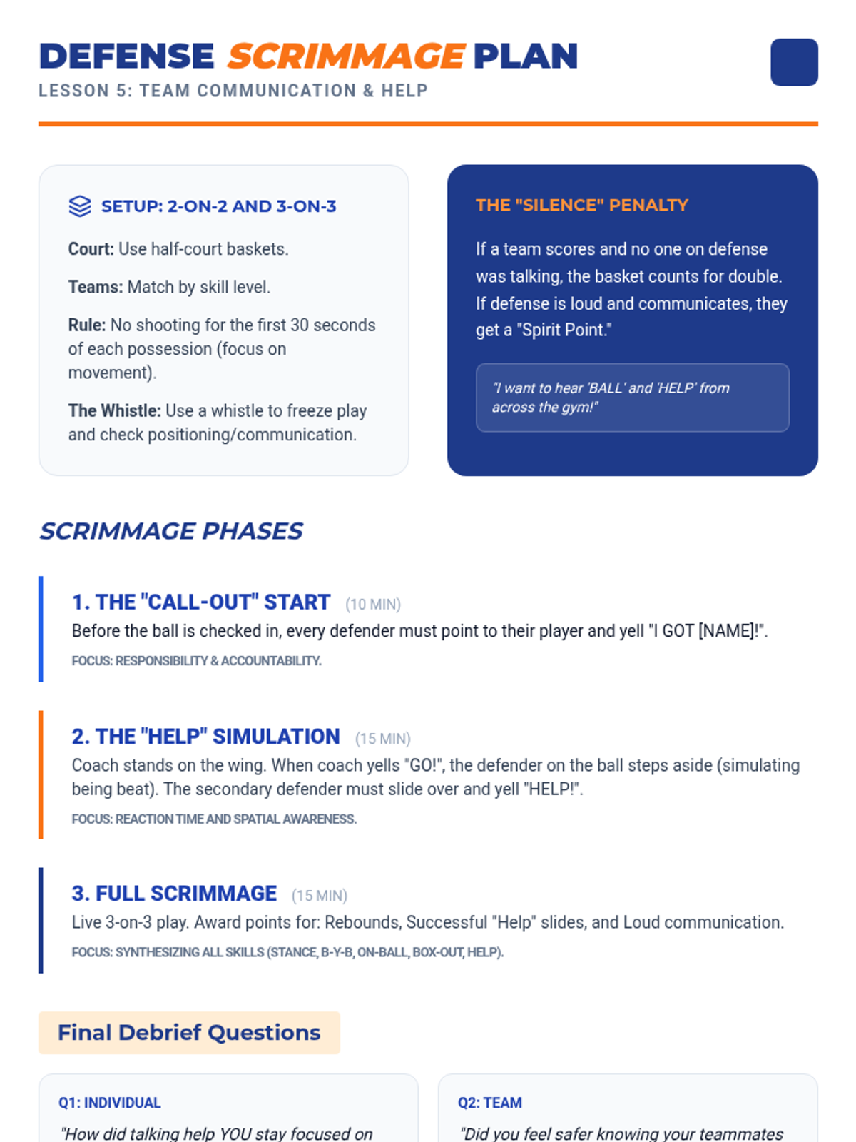 A 3rd-grade basketball sequence focusing on defensive fundamentals, positioning, and teamwork. Students progress from individual stance and movement to complex team-based 'help' defense concepts.
