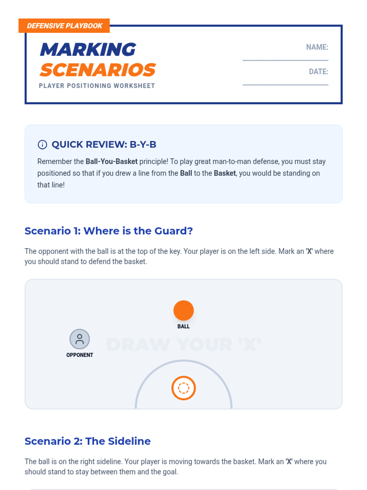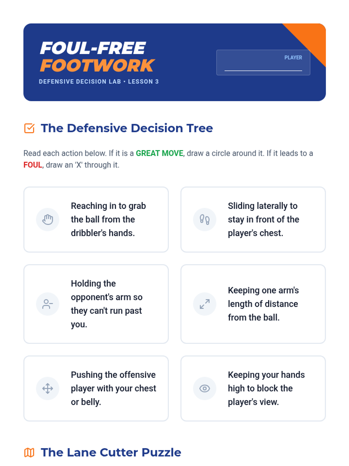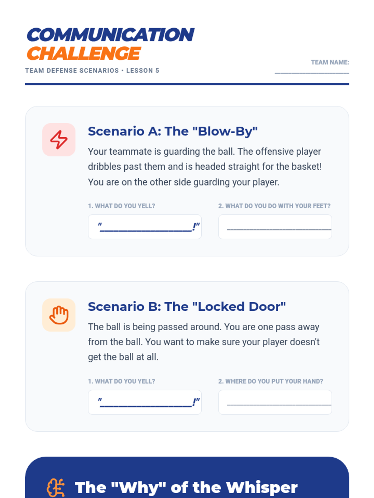 A 3rd-grade basketball sequence focusing on defensive fundamentals, positioning, and teamwork. Students progress from individual stance and movement to complex team-based 'help' defense concepts.
