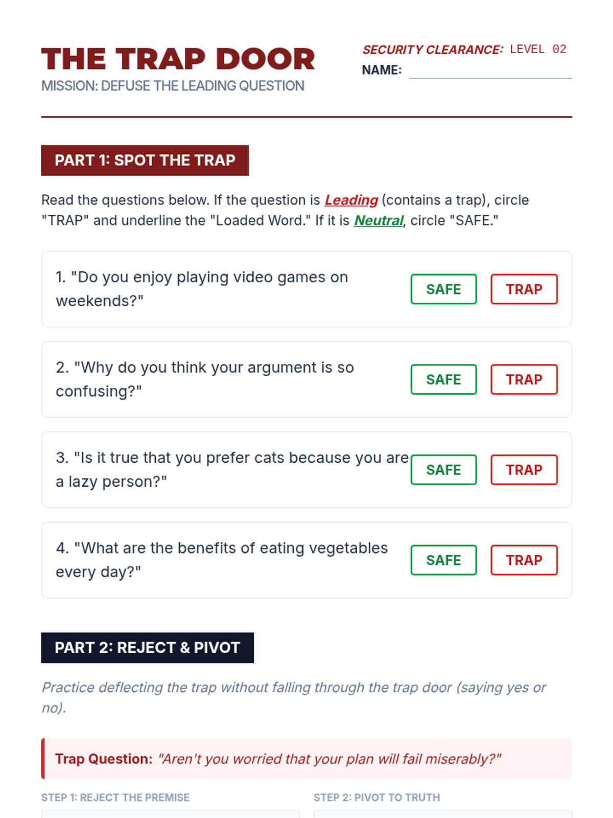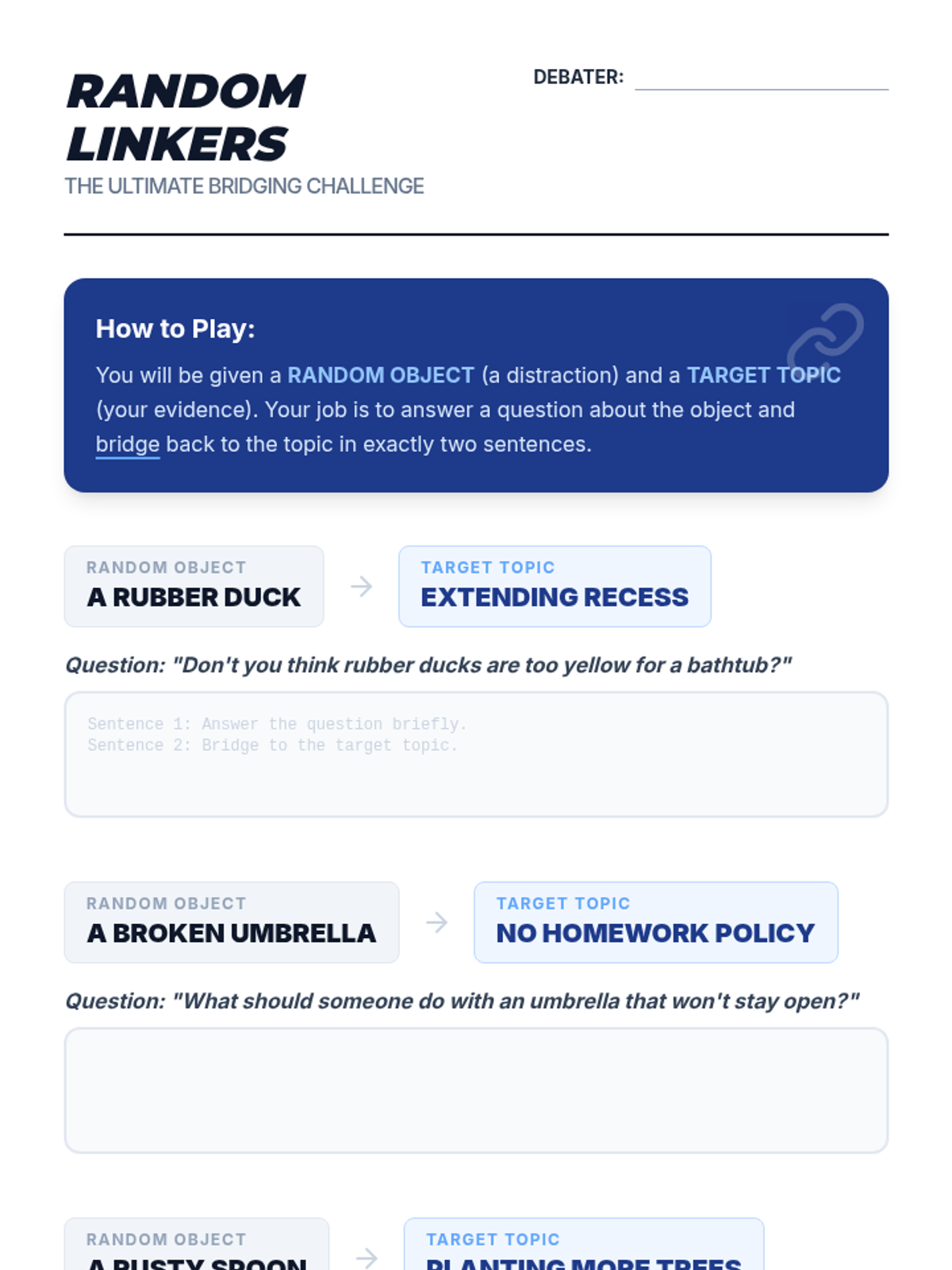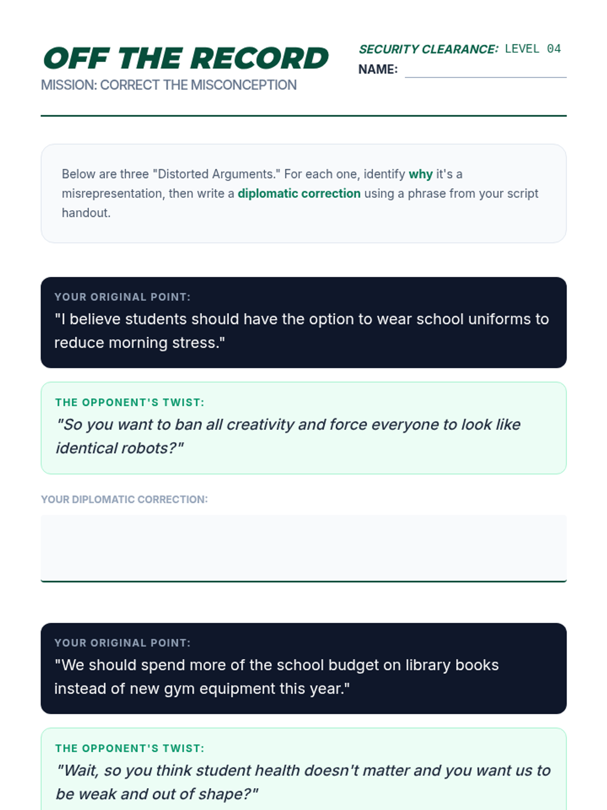 A sequence focused on the defensive side of debate, teaching 6th-grade students how to maintain composure, identify rhetorical traps, and pivot back to evidence during cross-examination. Students will move from non-verbal techniques to full-scale rapid-fire defense simulations.