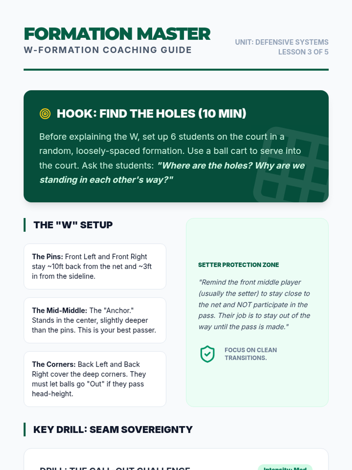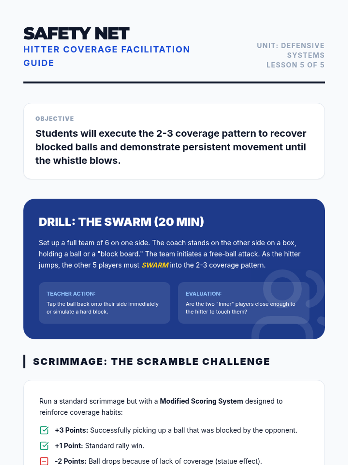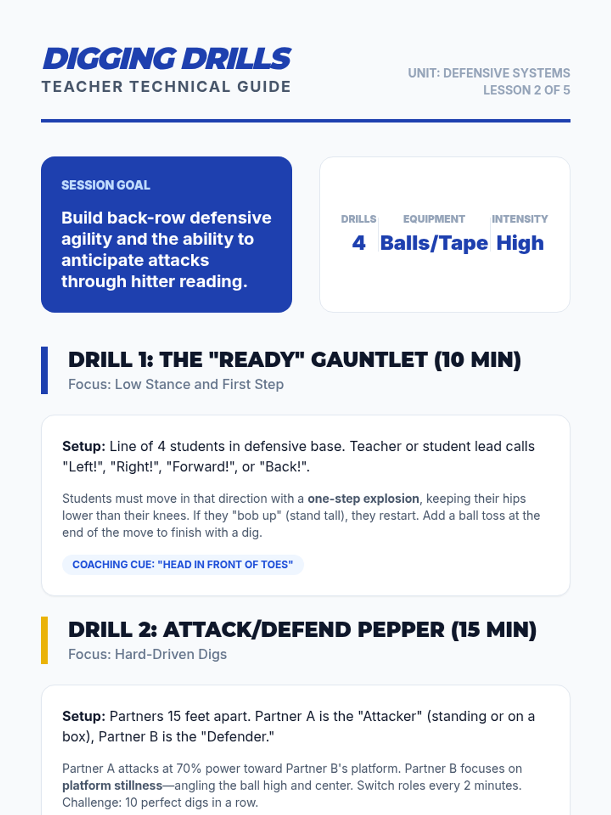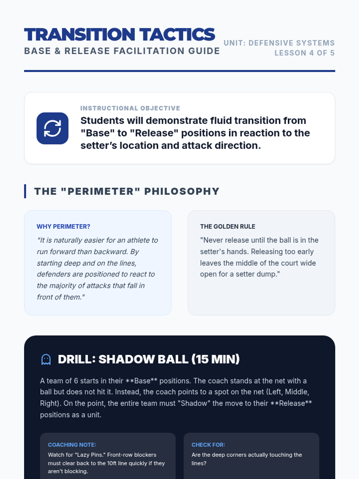 This high-school volleyball sequence focuses on team defensive systems, court coverage, and reading the opponent. Students progress from individual skills like blocking and digging to complex team formations like the 'W' serve receive and perimeter defense.