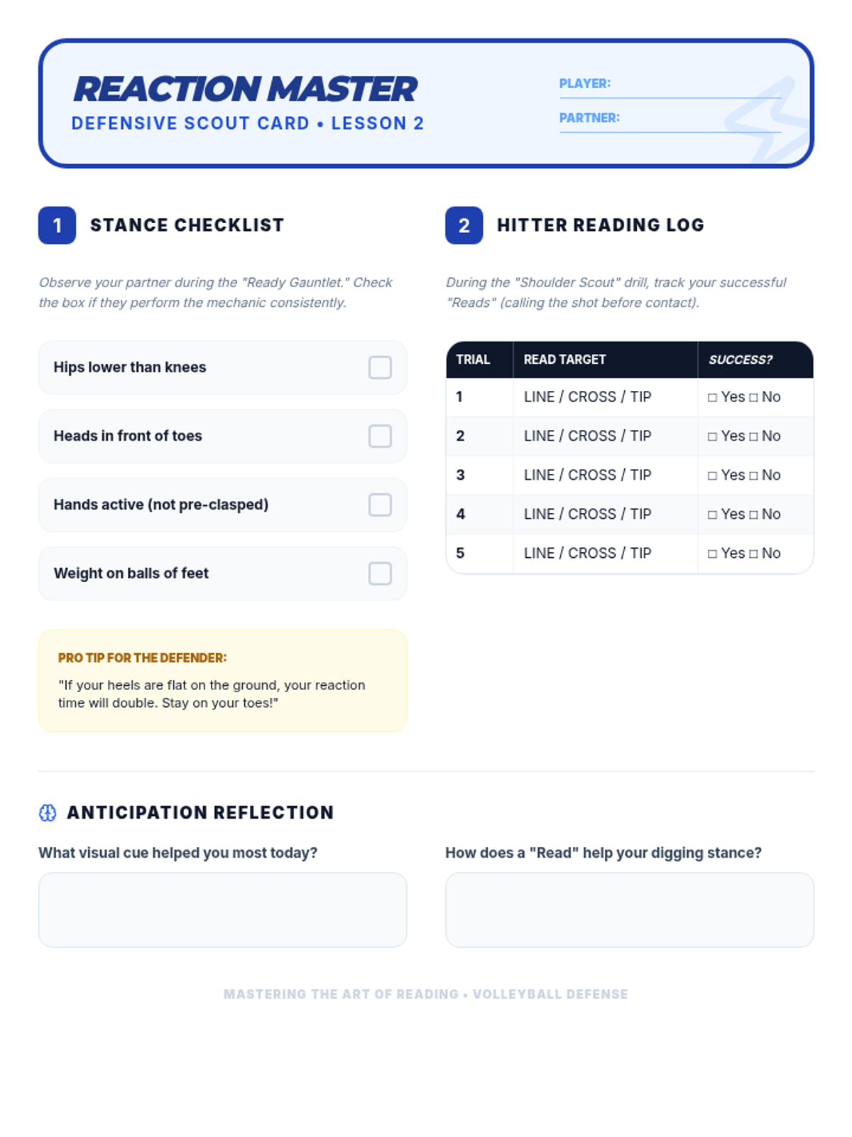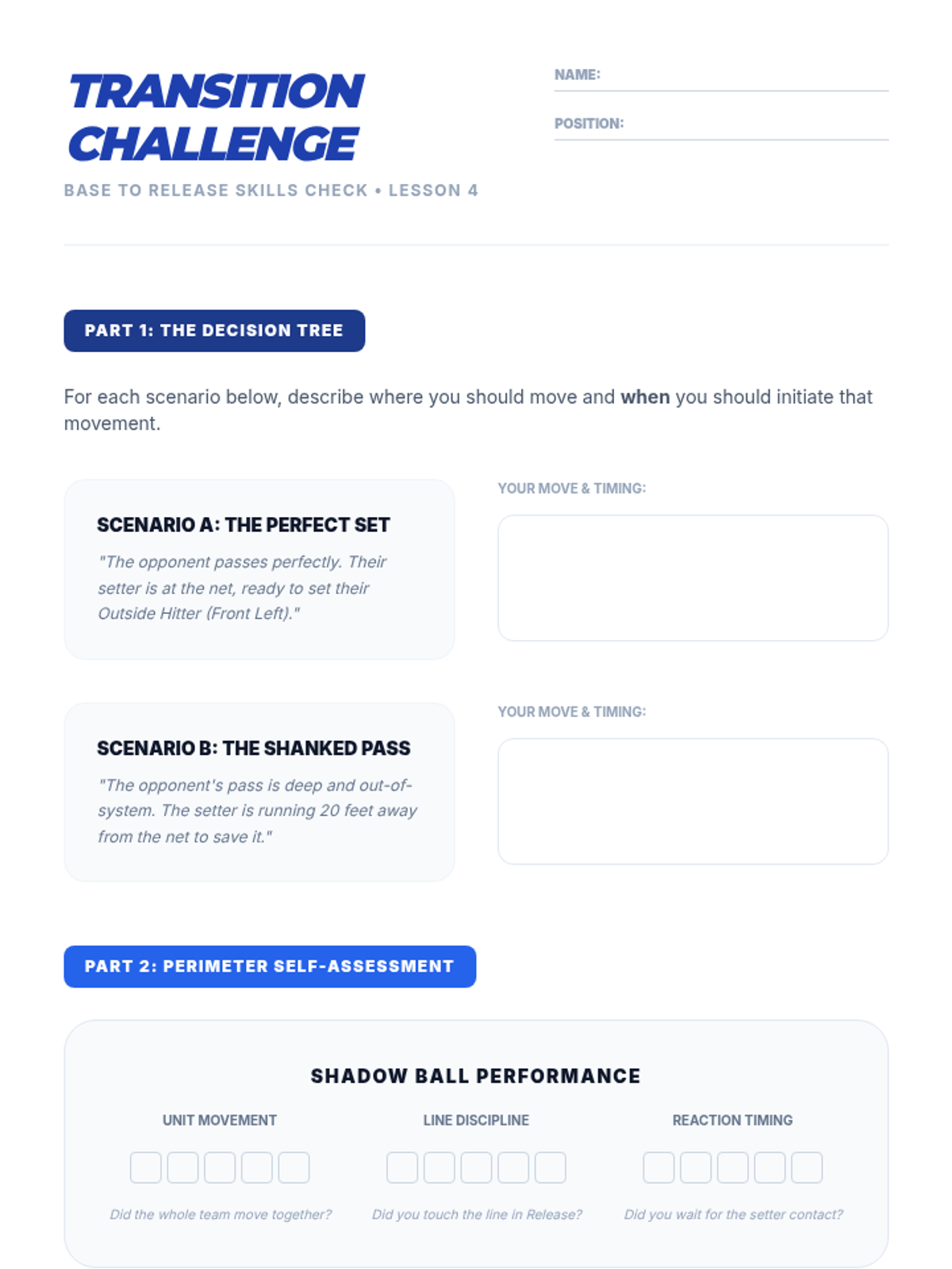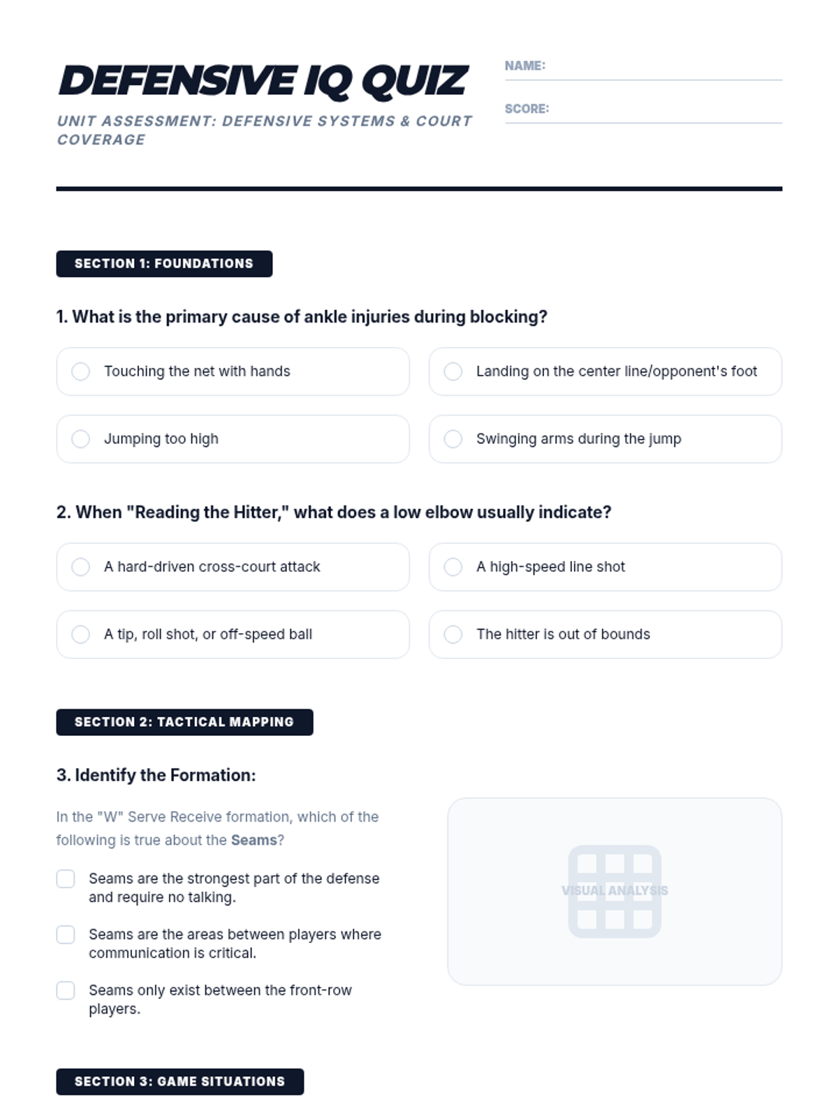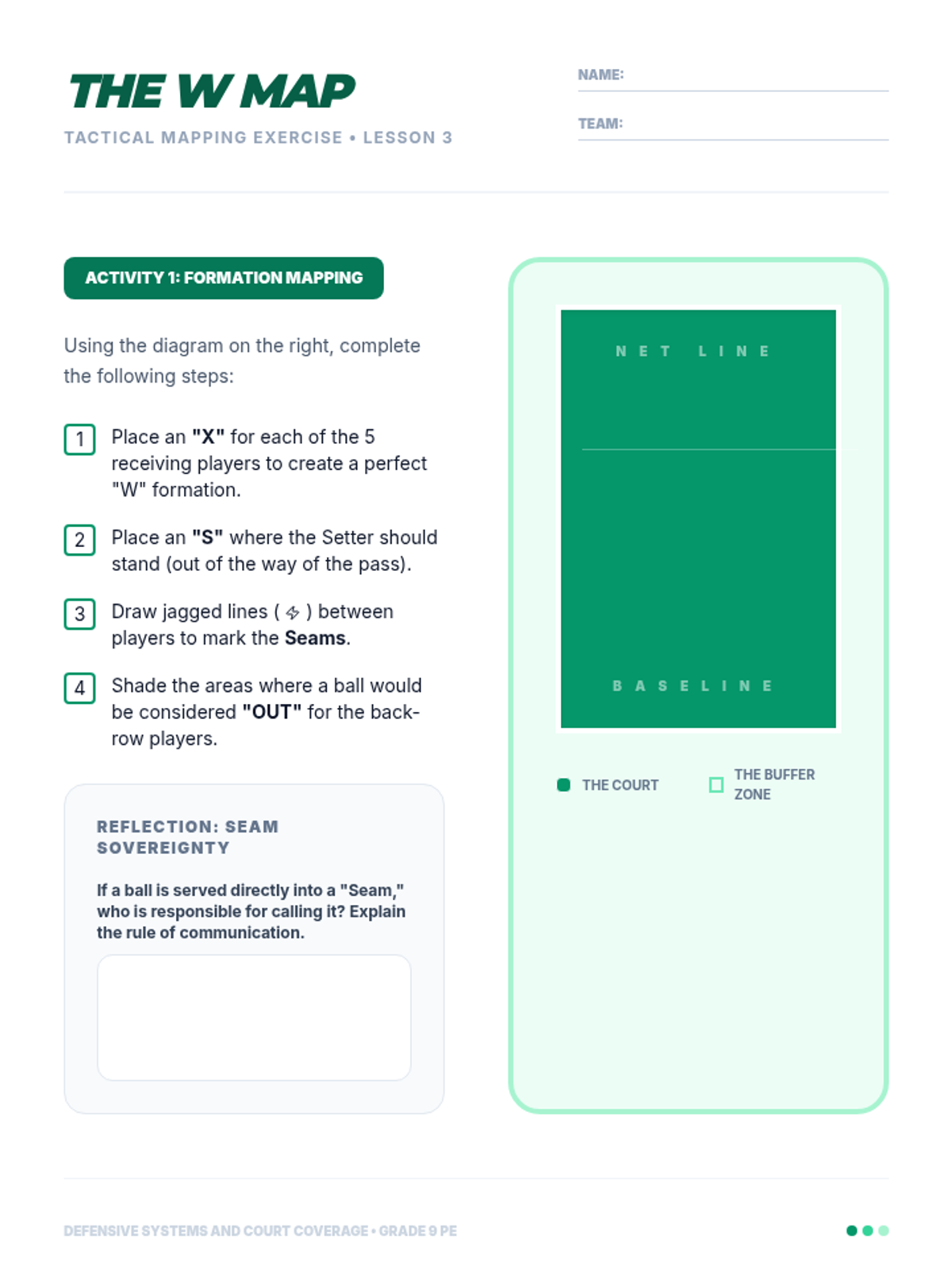 This high-school volleyball sequence focuses on team defensive systems, court coverage, and reading the opponent. Students progress from individual skills like blocking and digging to complex team formations like the 'W' serve receive and perimeter defense.
