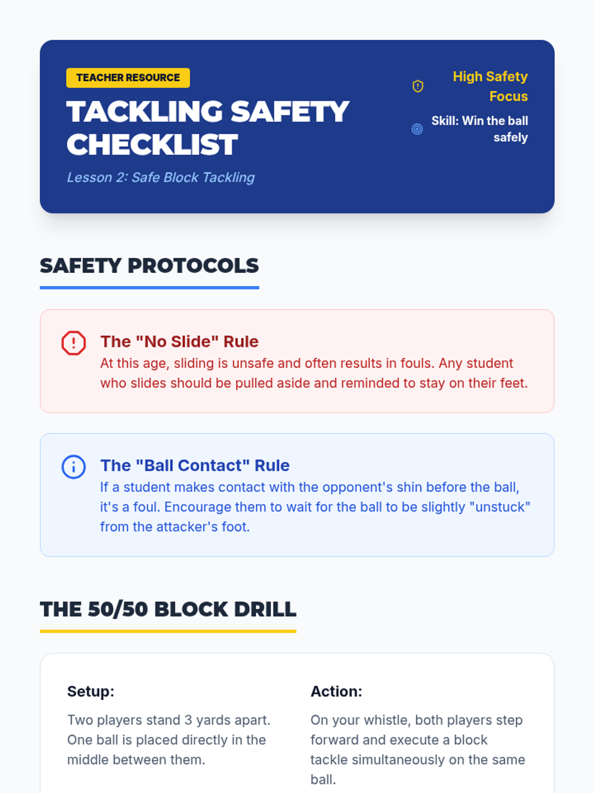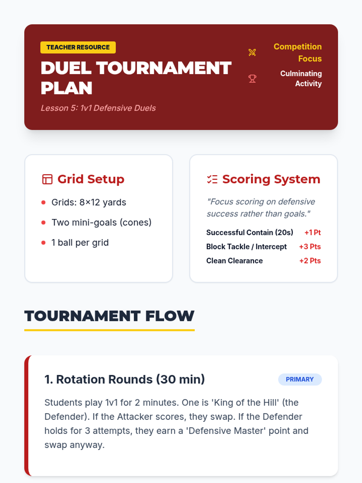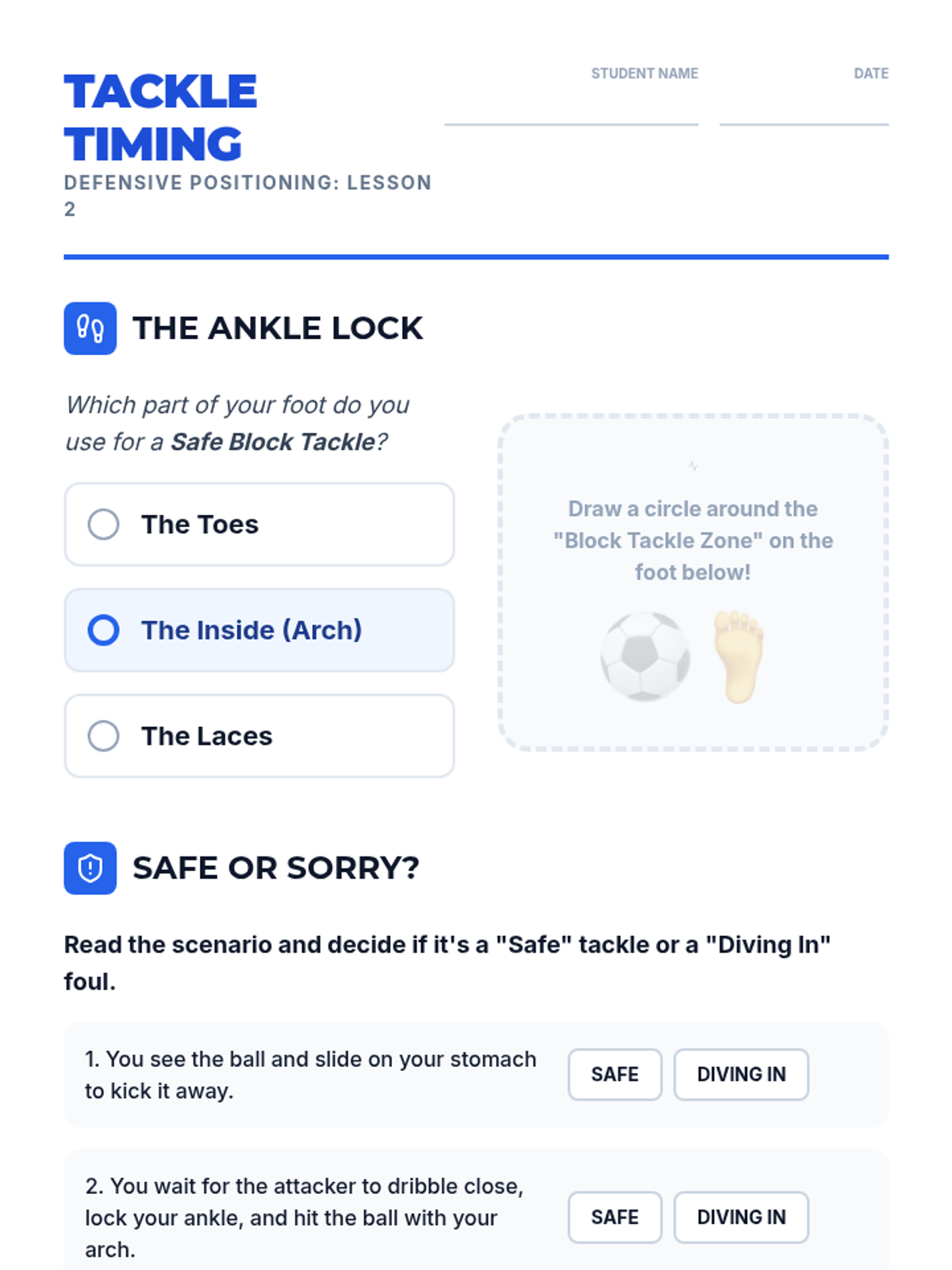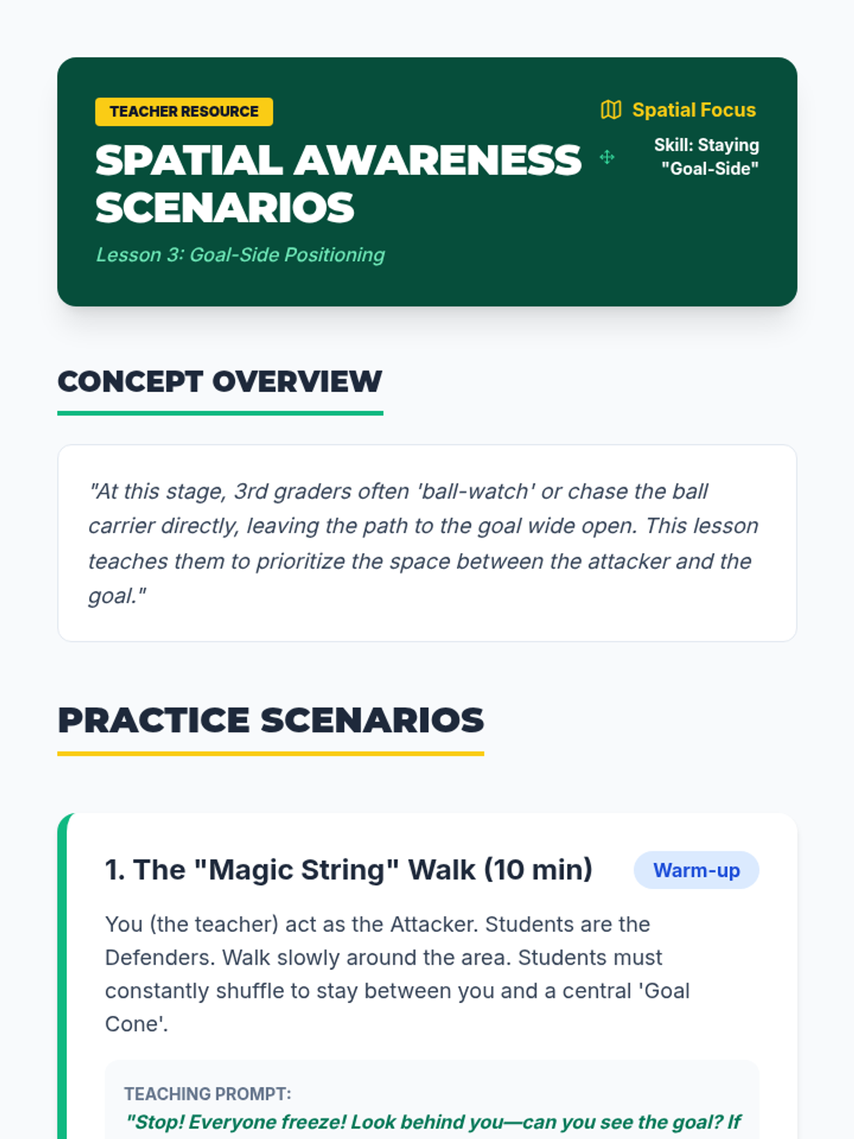 A comprehensive introduction to soccer defense for 3rd graders, focusing on stance, positioning, and safe ball recovery. Students learn to defend with patience and technique rather than aggression.