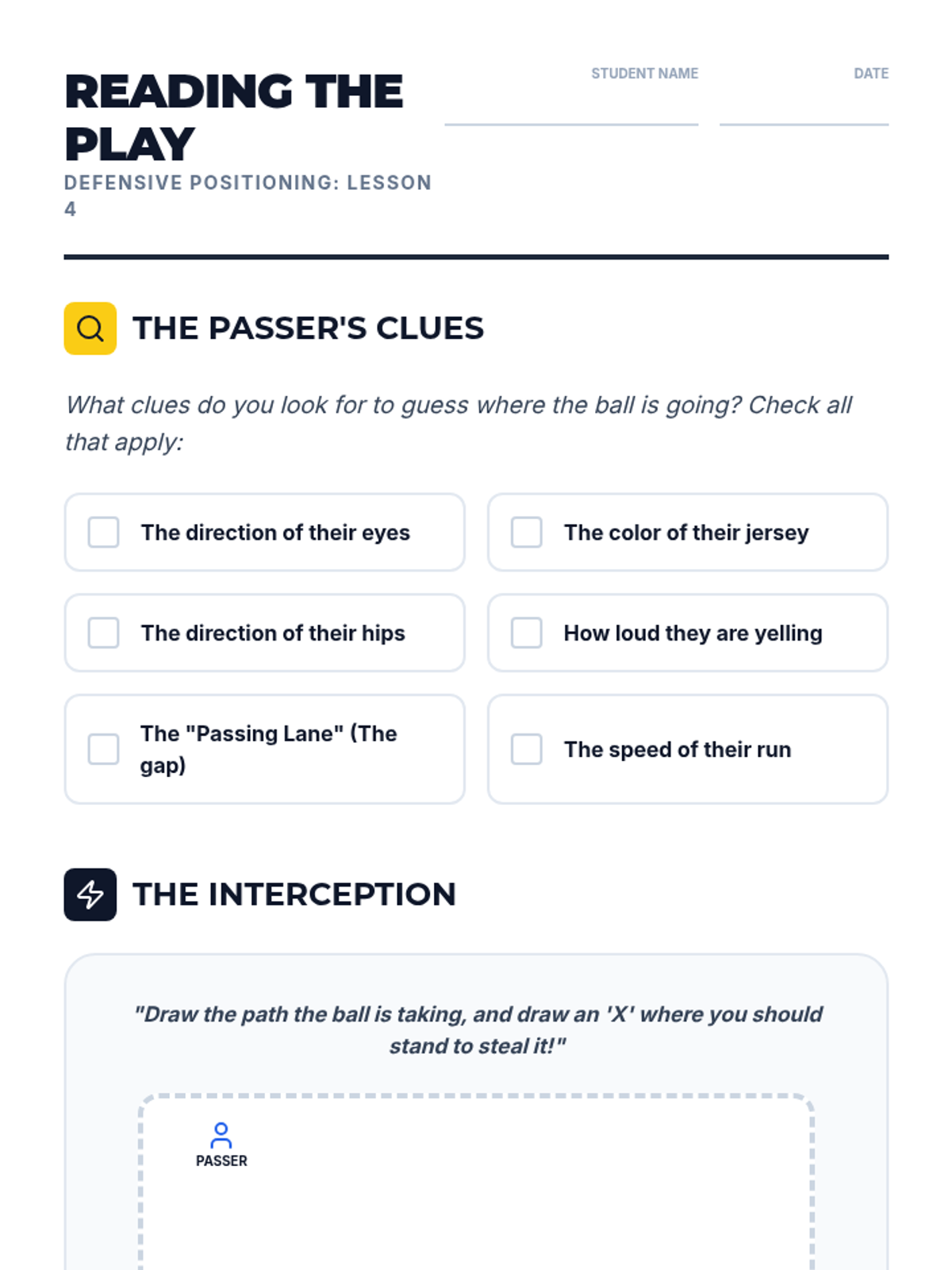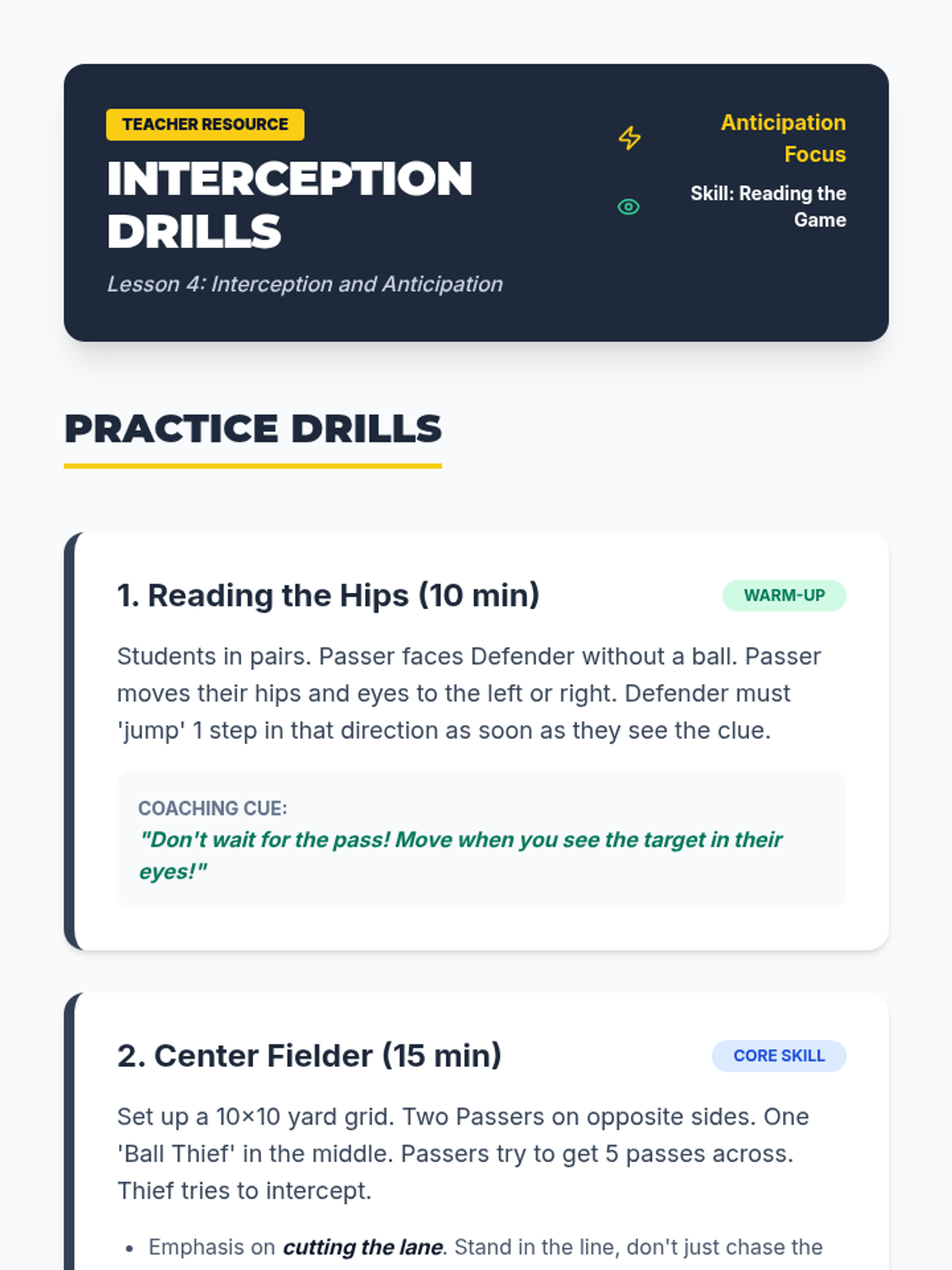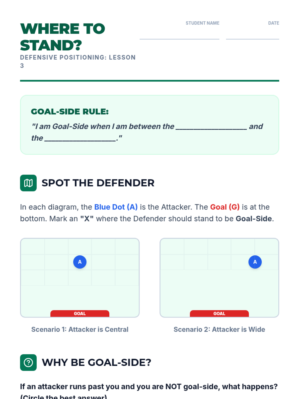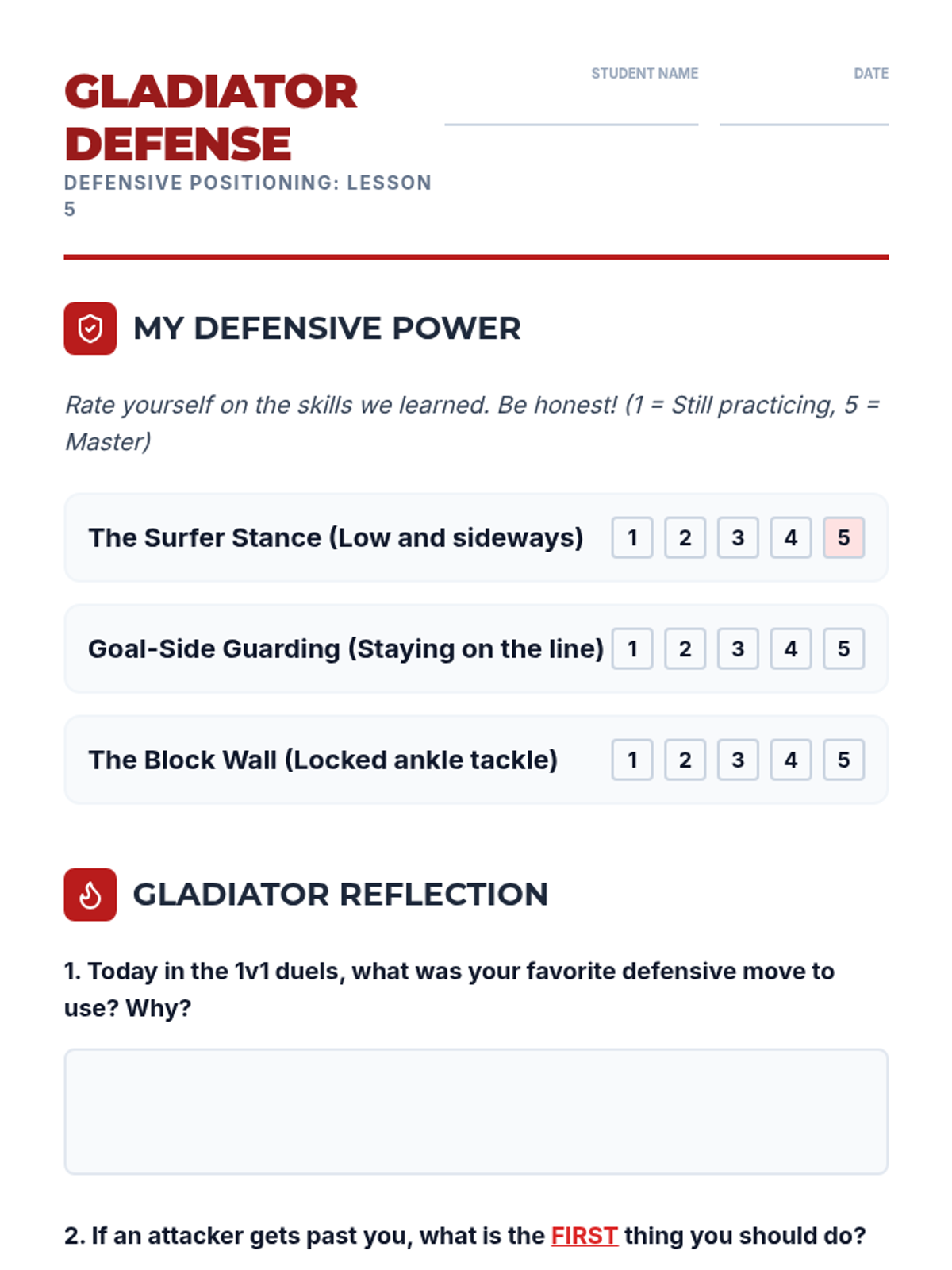 A comprehensive introduction to soccer defense for 3rd graders, focusing on stance, positioning, and safe ball recovery. Students learn to defend with patience and technique rather than aggression.